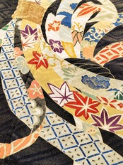 熨斗目の中には古典的なお花(牡丹、菊、紅葉、梅、クレマチス、竹、橘)と花菱や紗綾形、七宝繋ぎや青海波などの吉祥文の組み合わせが華やかなかつ美しく目を惹きます。