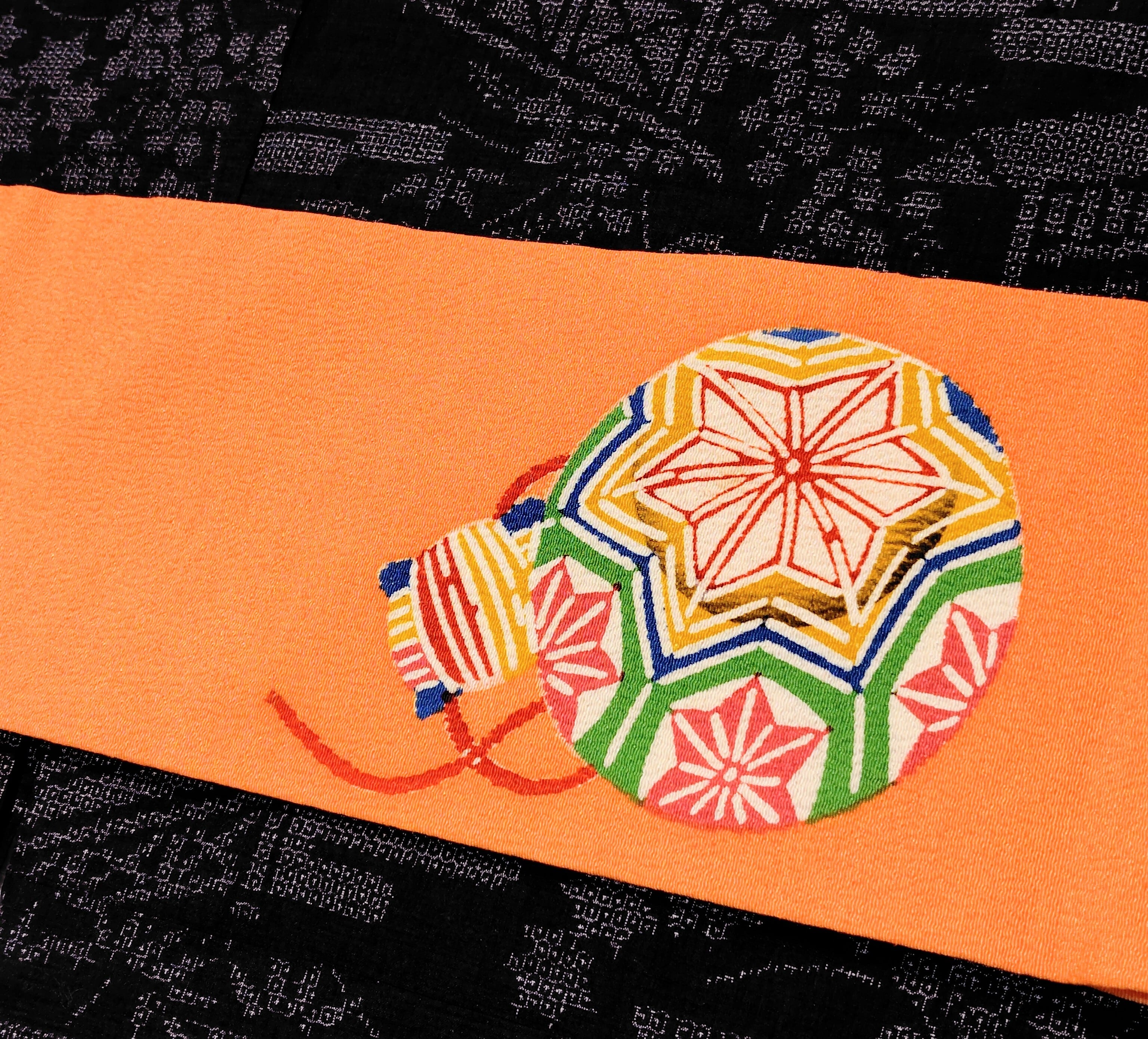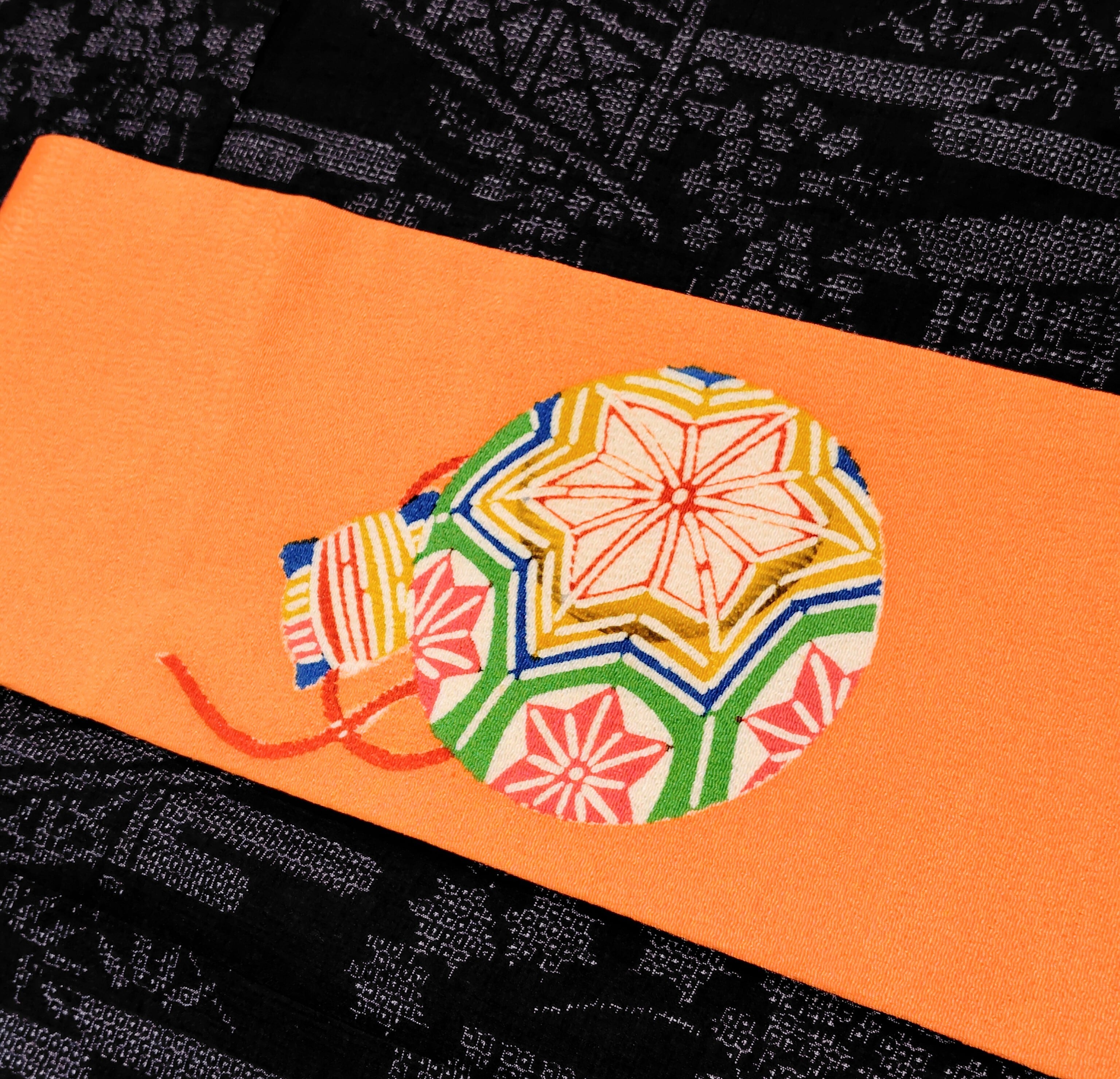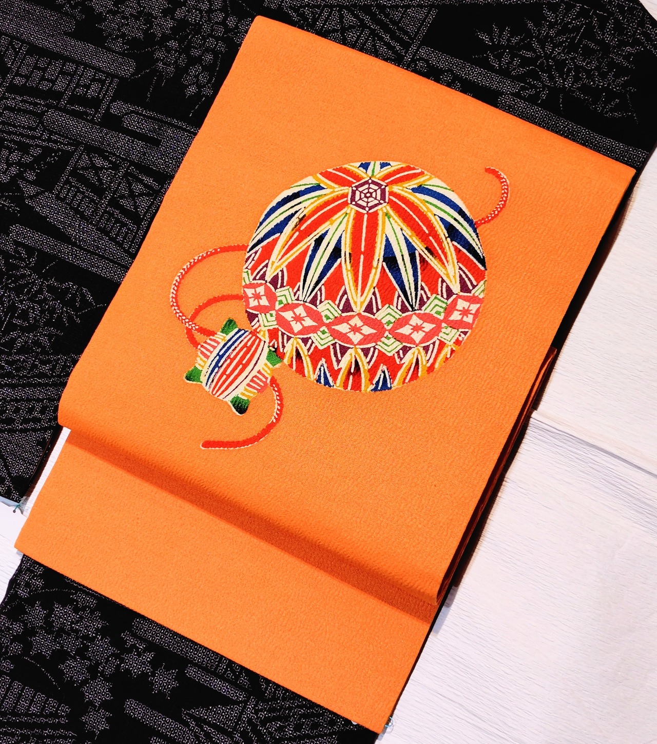 大きな毬柄はコーディネートのワンポイントにもなりますが、無地の部分も多いのでお着物の柄は大きめ〜江戸小紋まで悩まずに合わせて頂けます◎