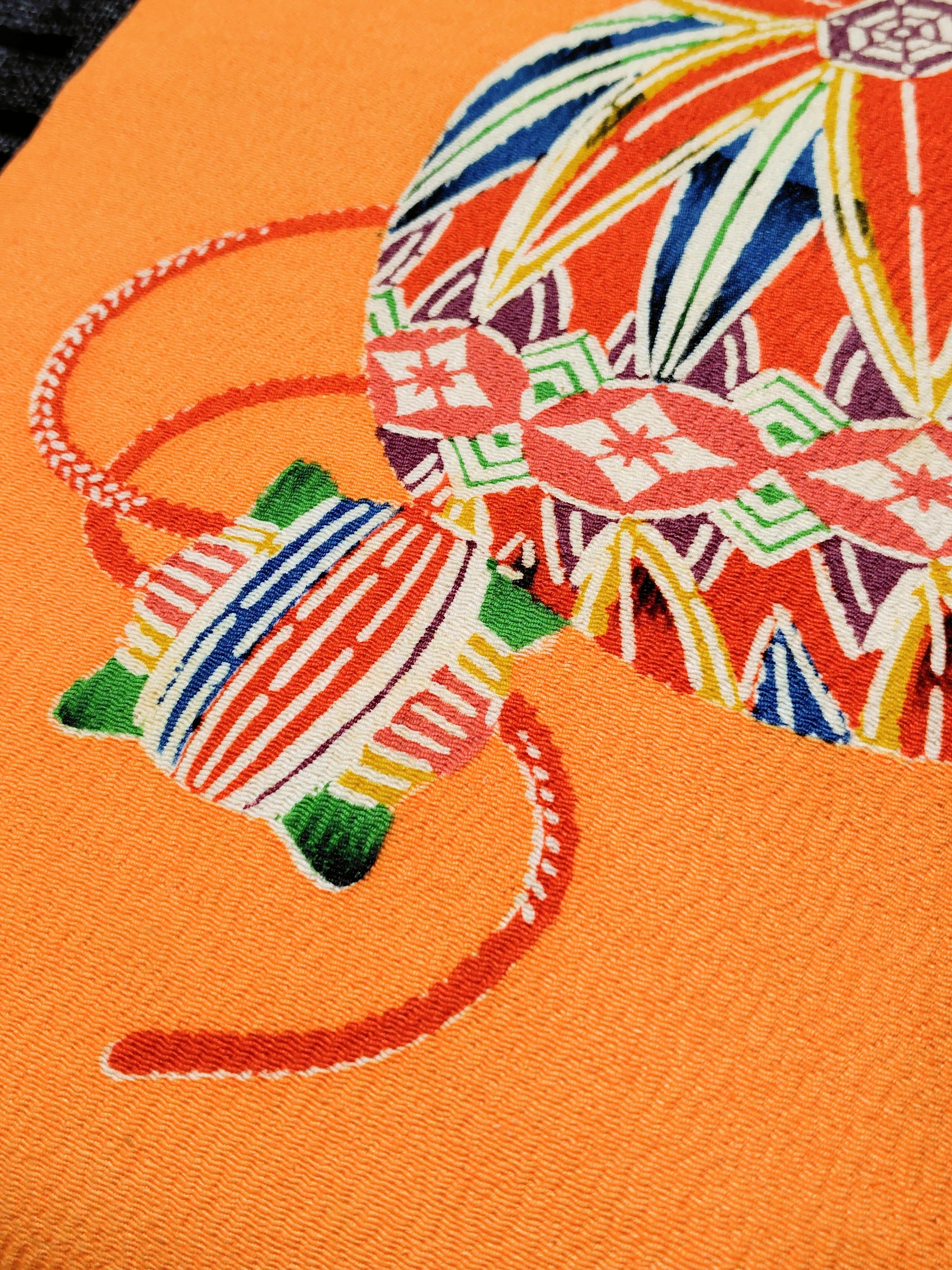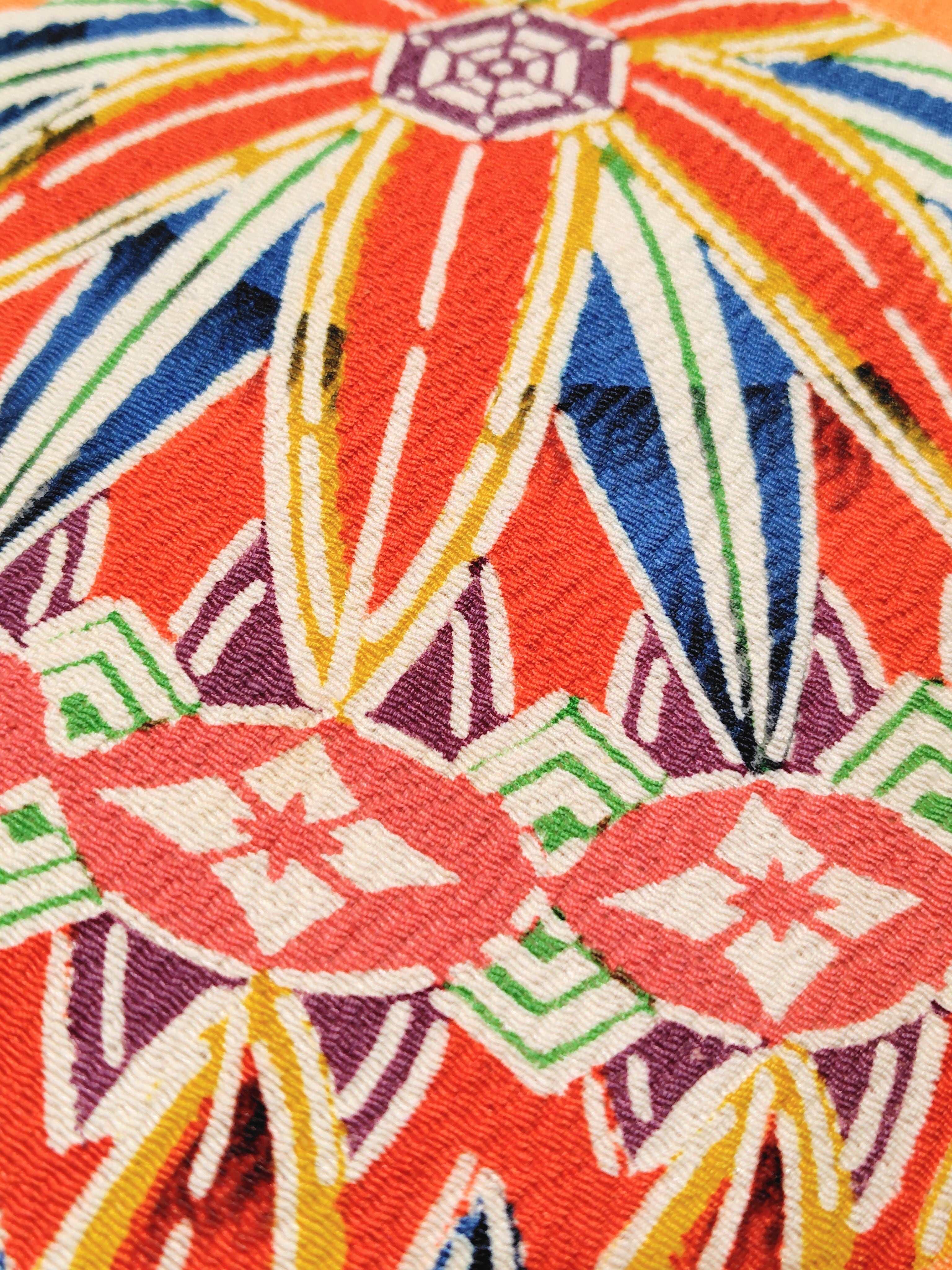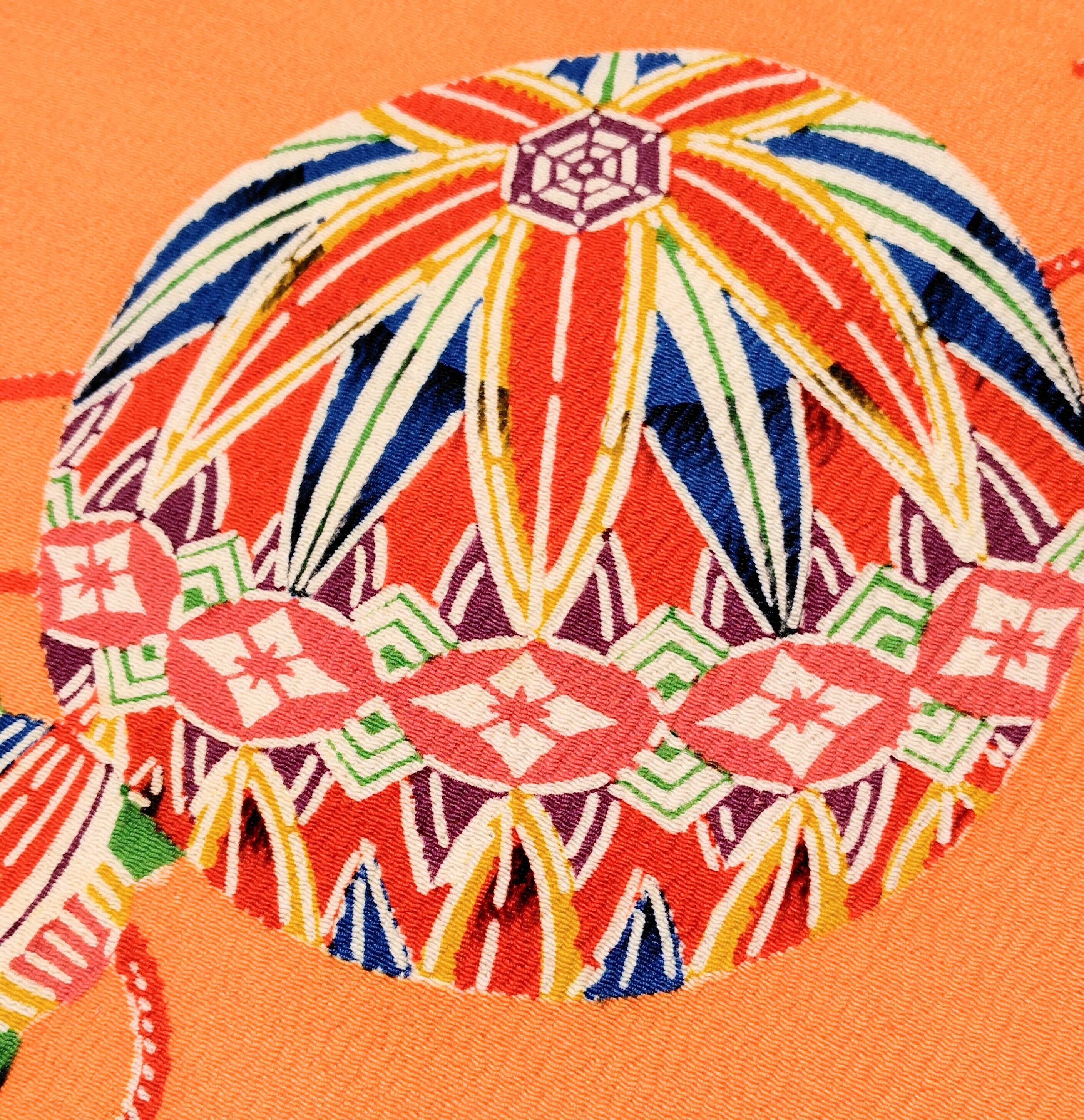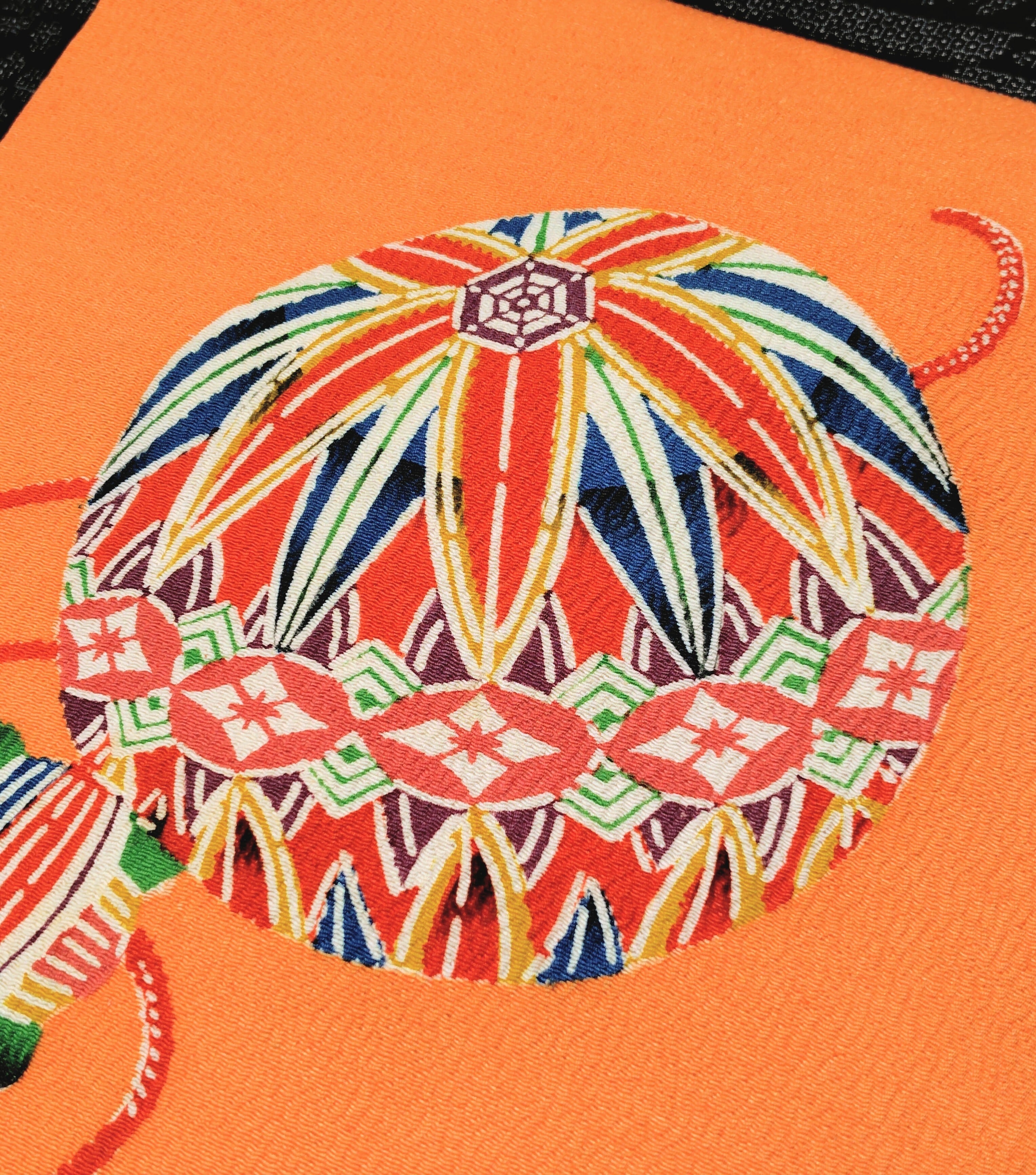 大きな毬柄はコーディネートのワンポイントにもなりますが、無地の部分も多いのでお着物の柄は大きめ〜江戸小紋まで悩まずに合わせて頂けます◎