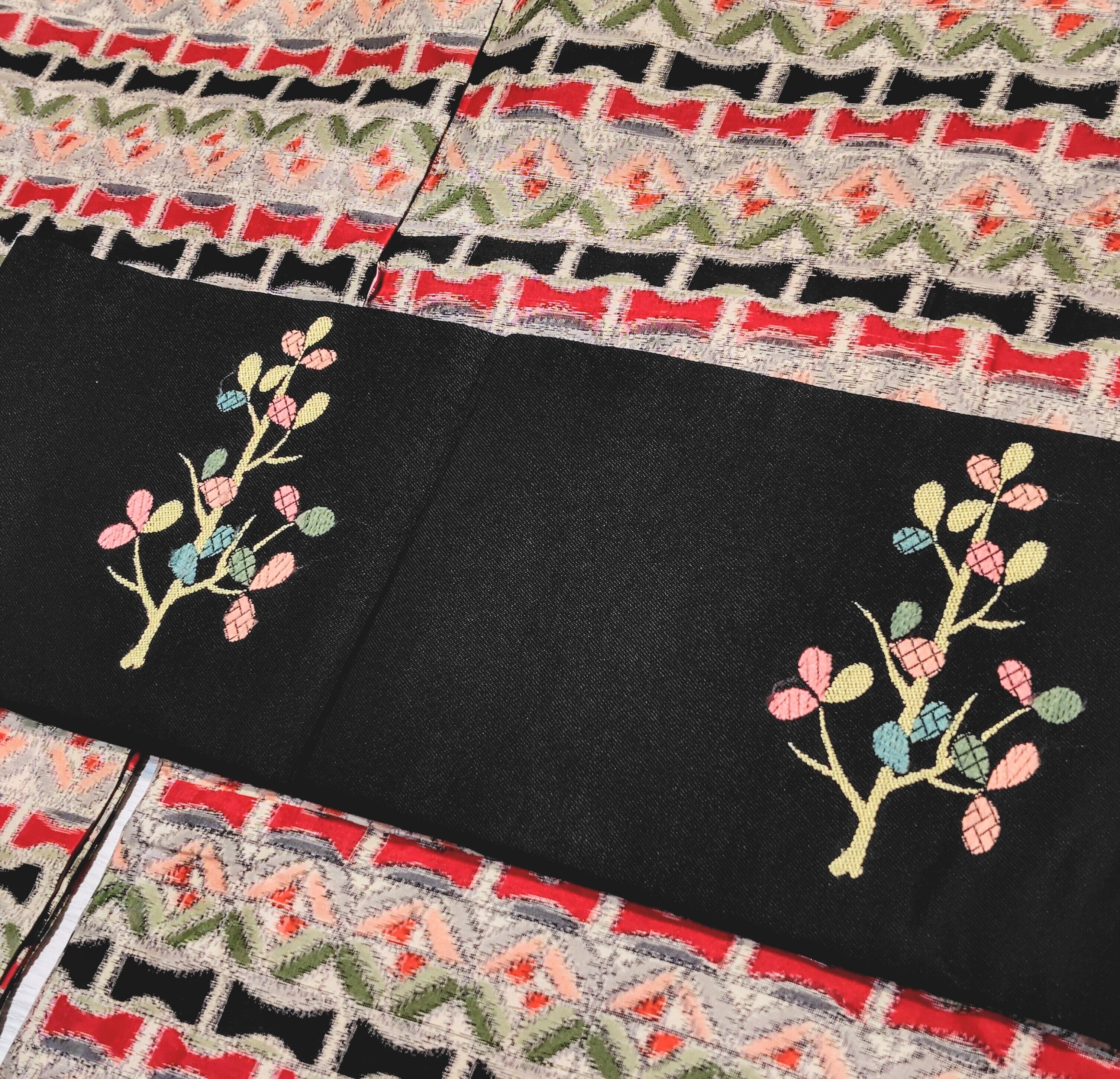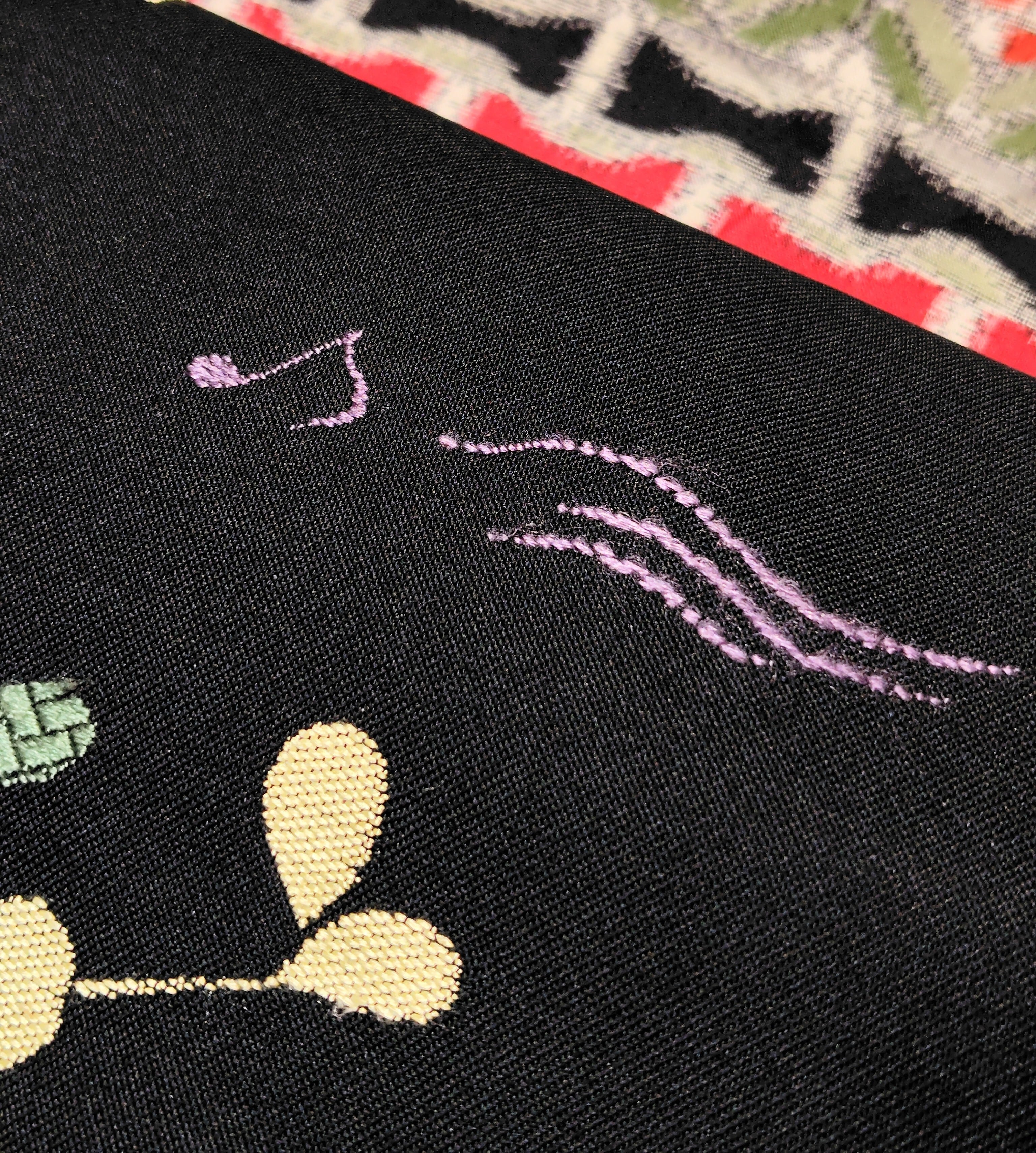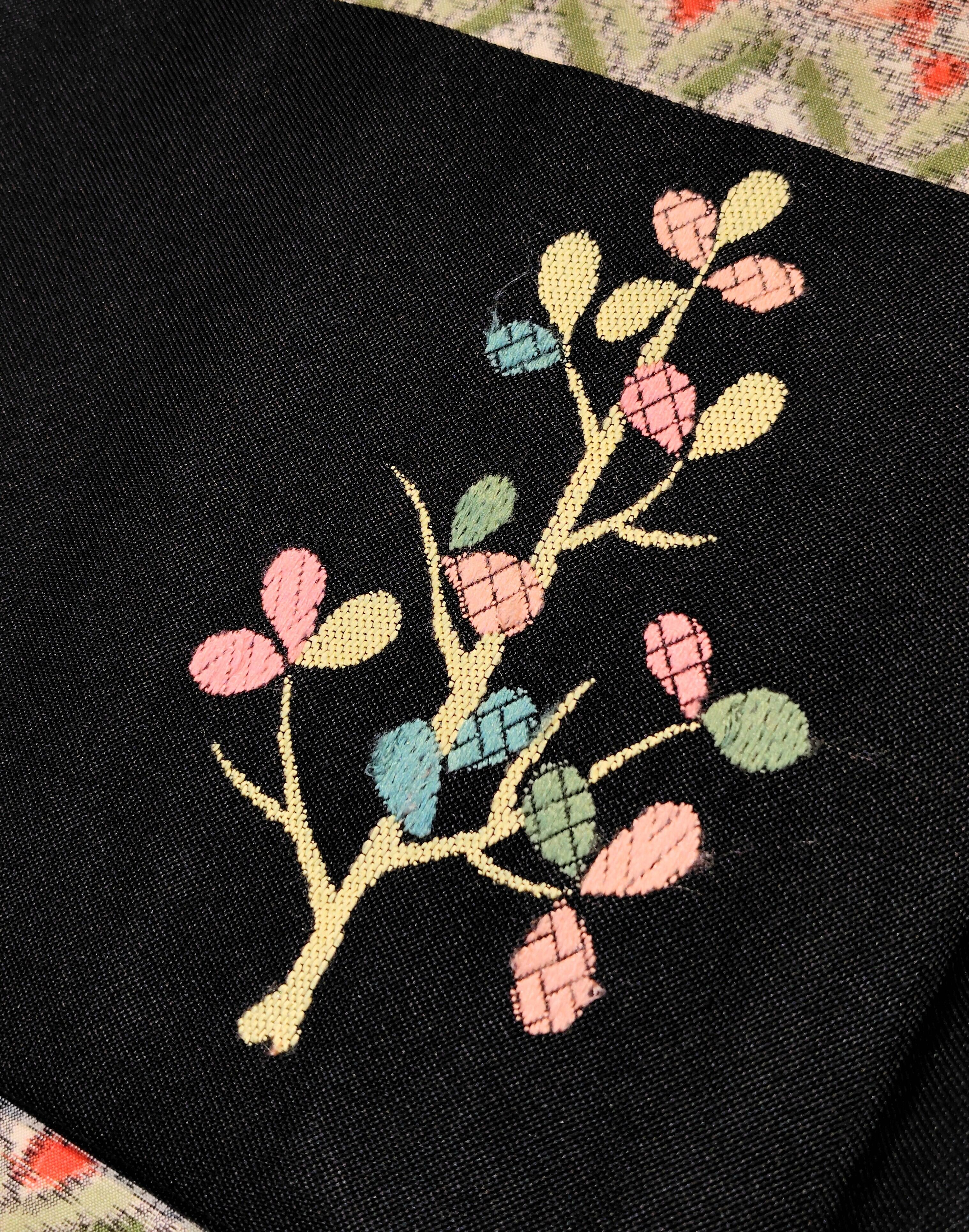 柄部分は2種類の技法で織られ、一部は刺繍のようにみえます。