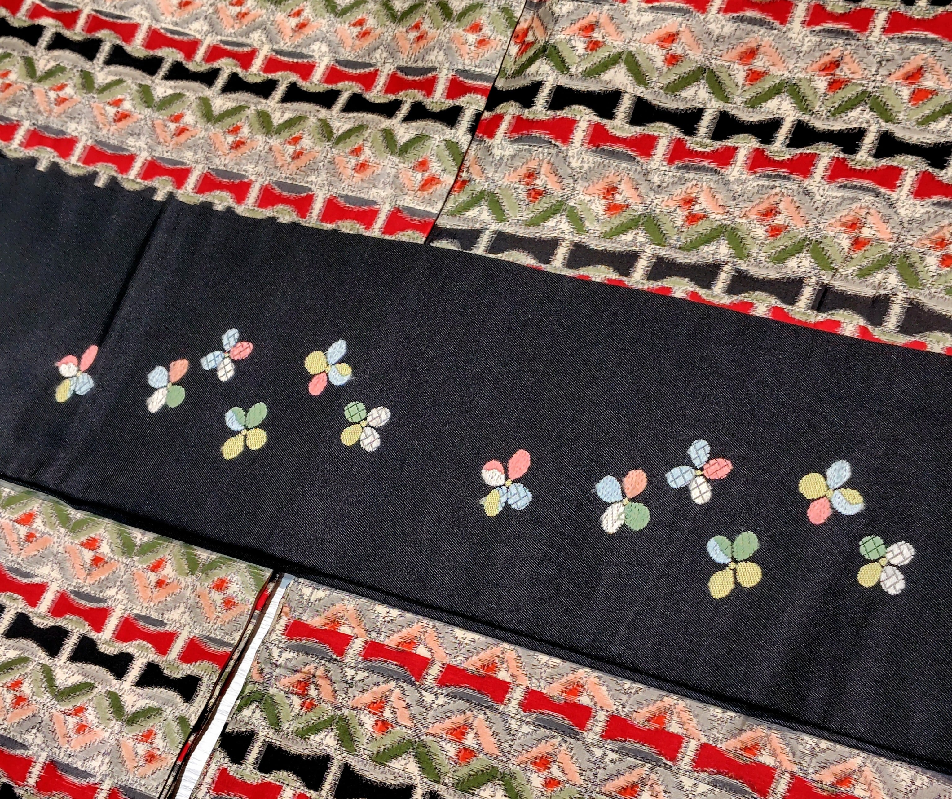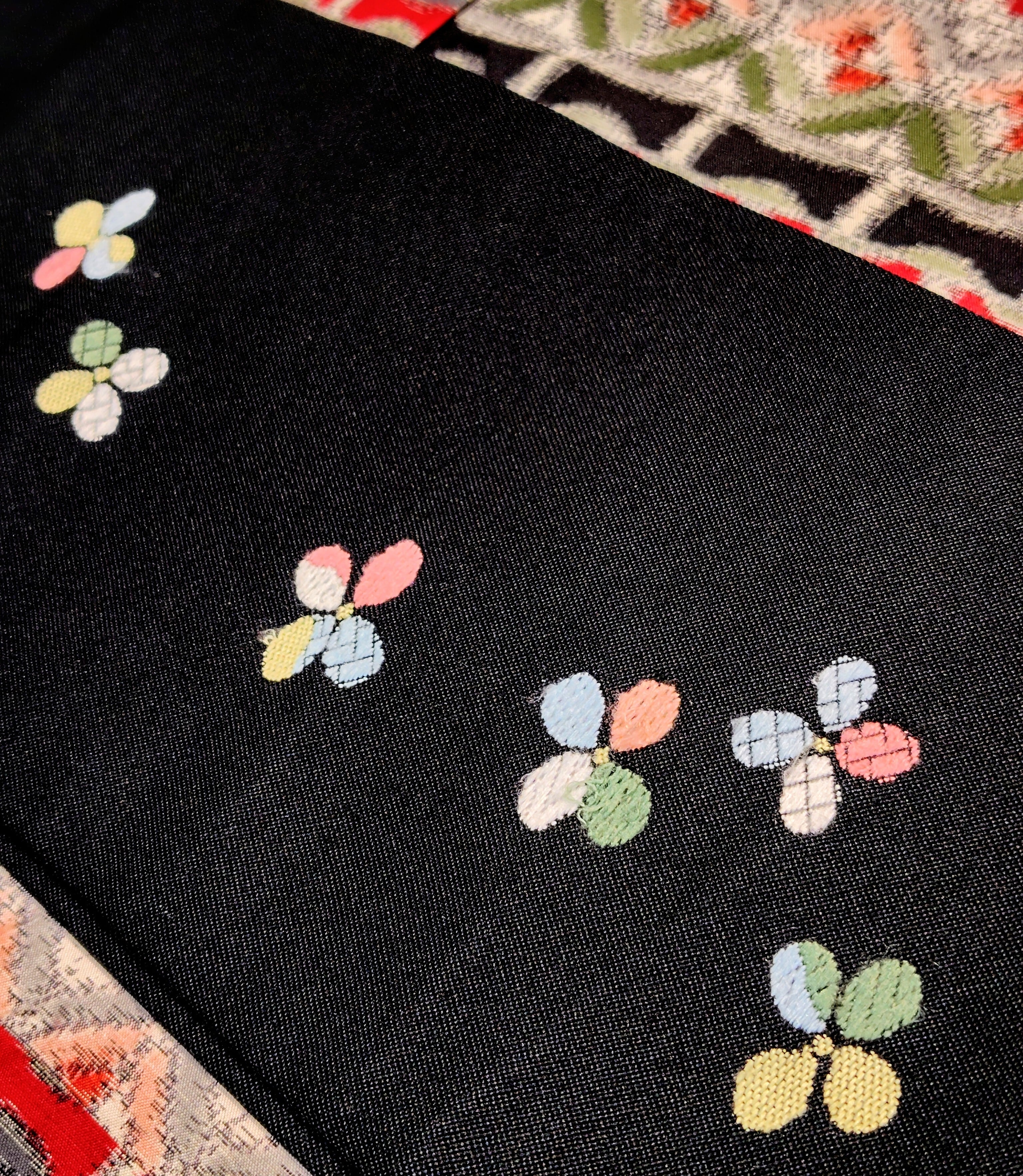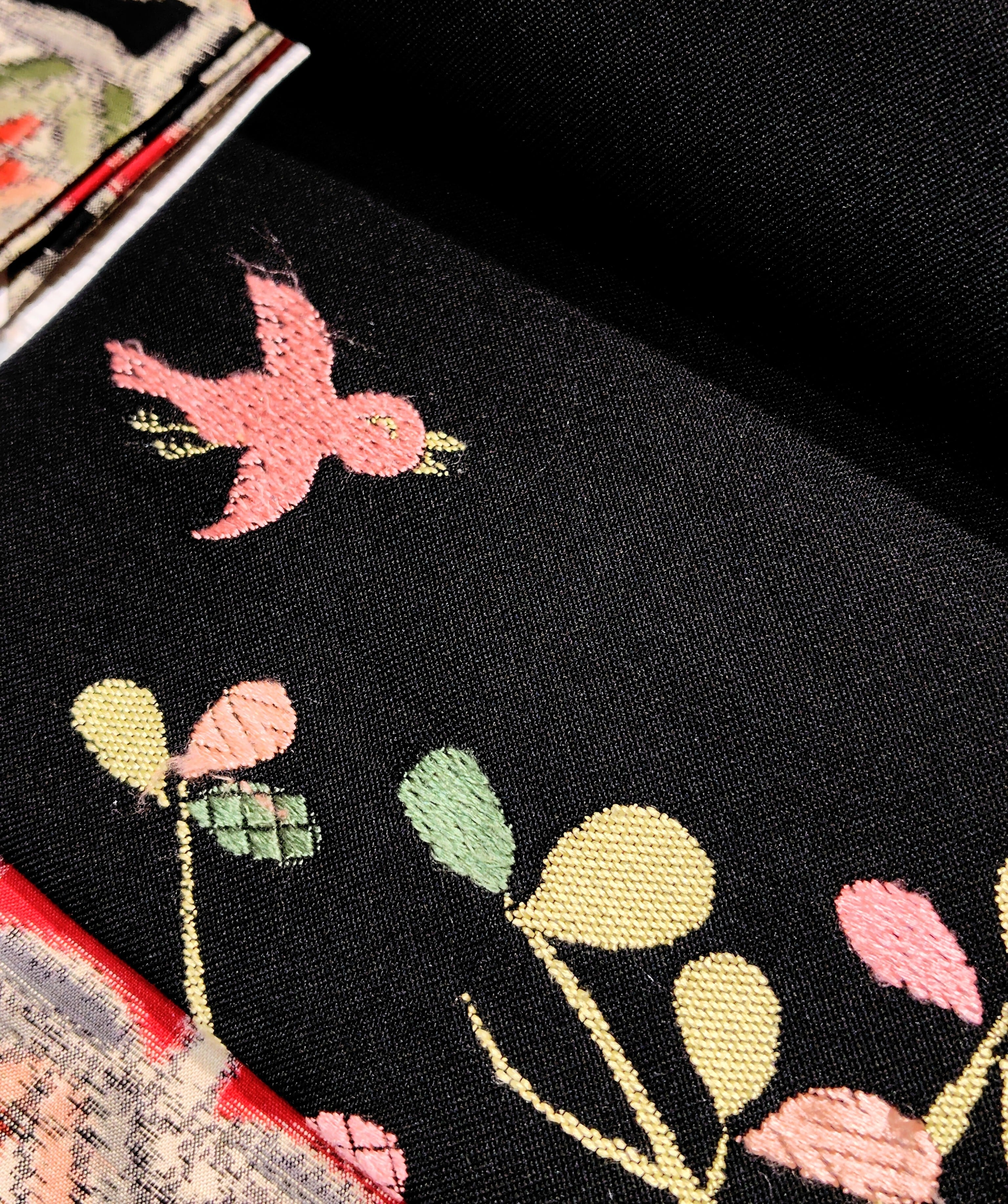 柄部分は2種類の技法で織られ、一部は刺繍のようにみえます。
