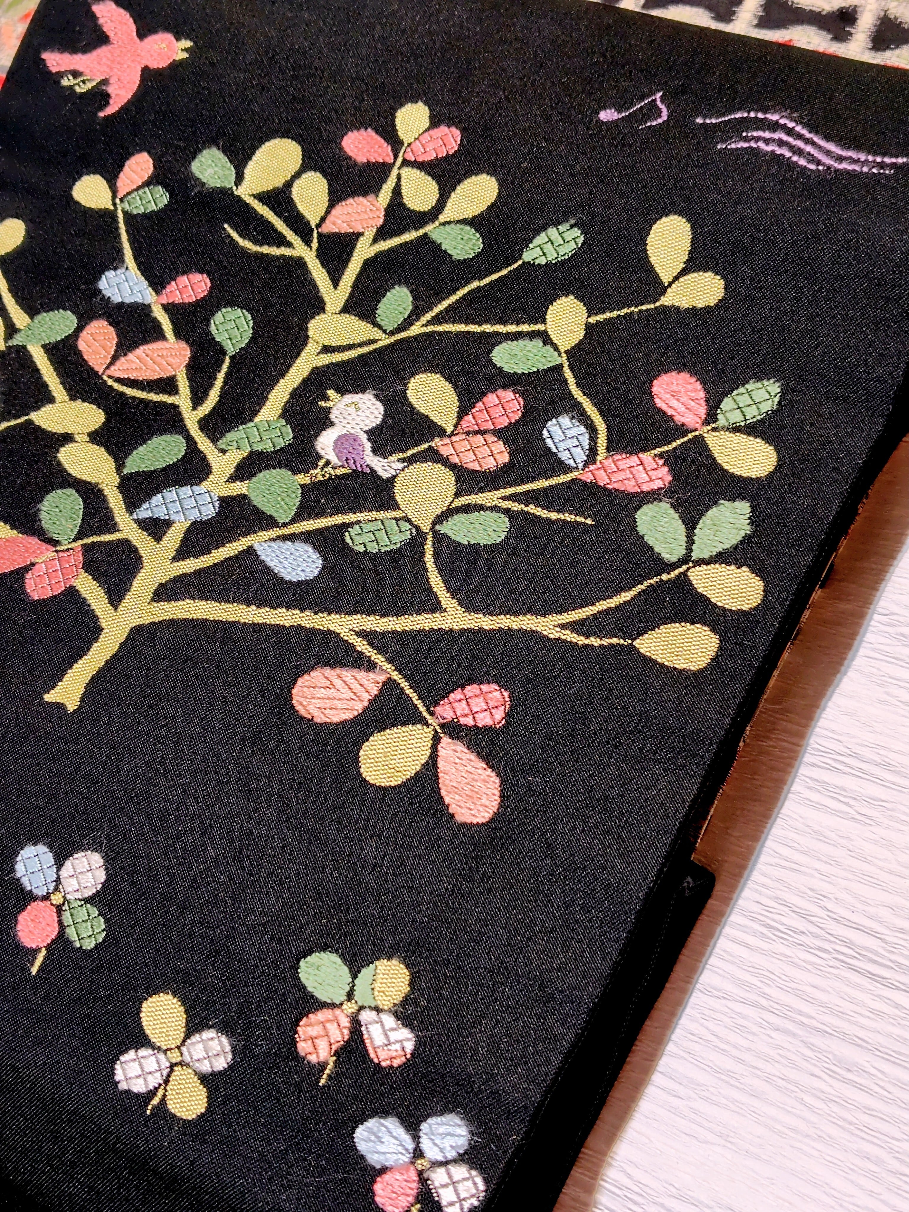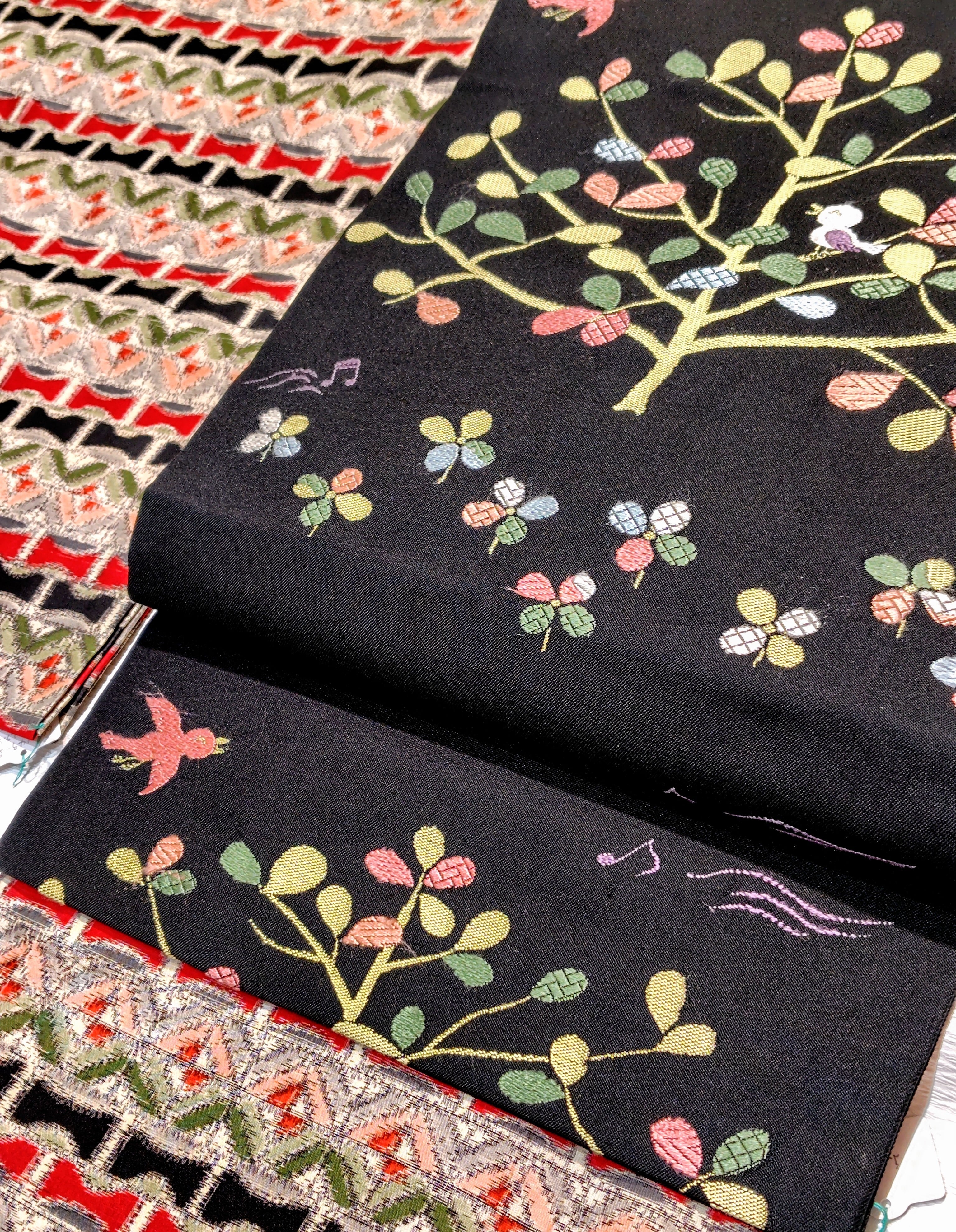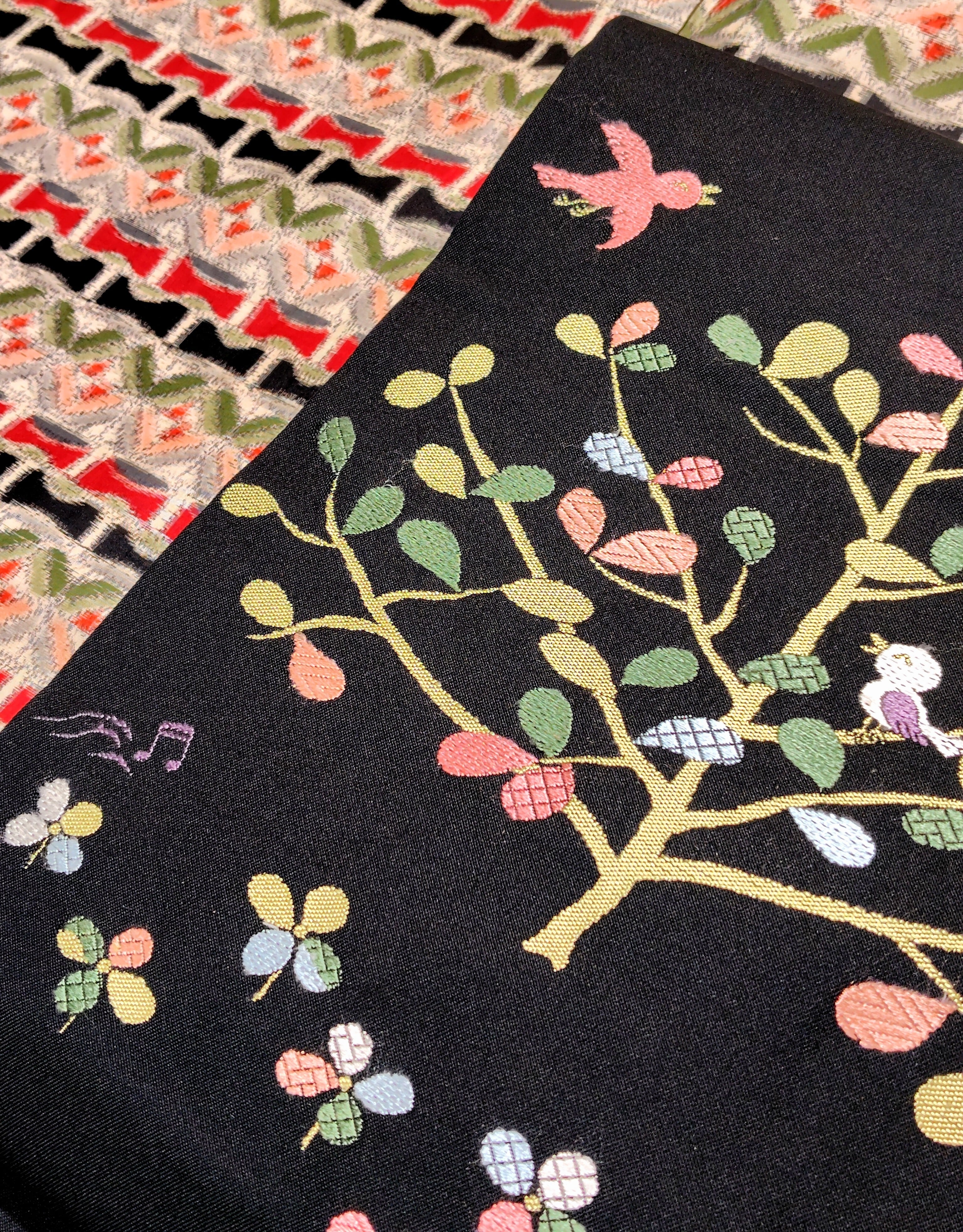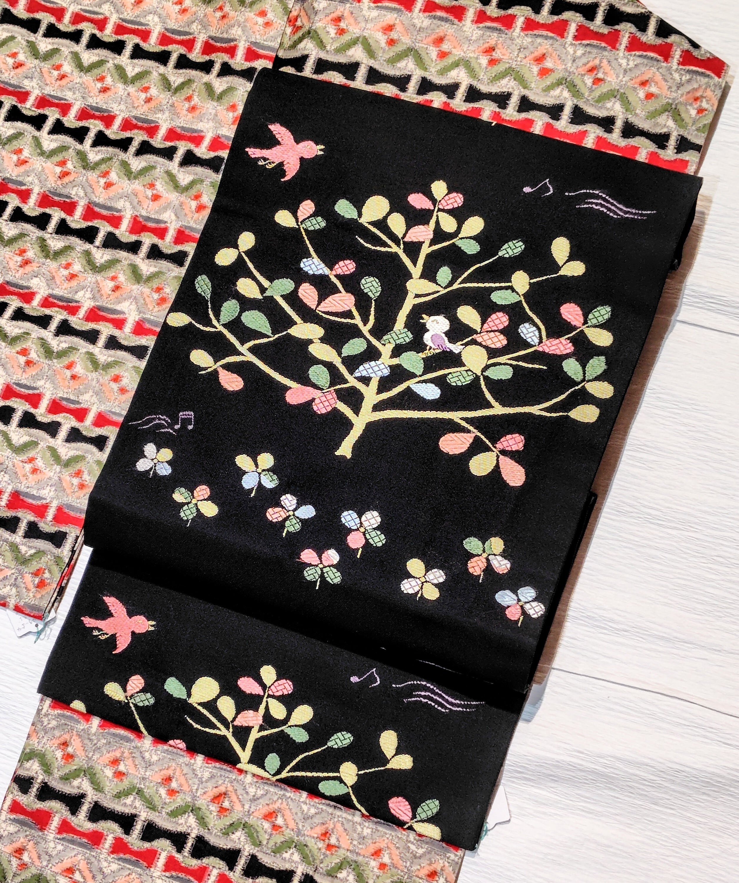 木と小鳥と音符柄の名古屋帯です。