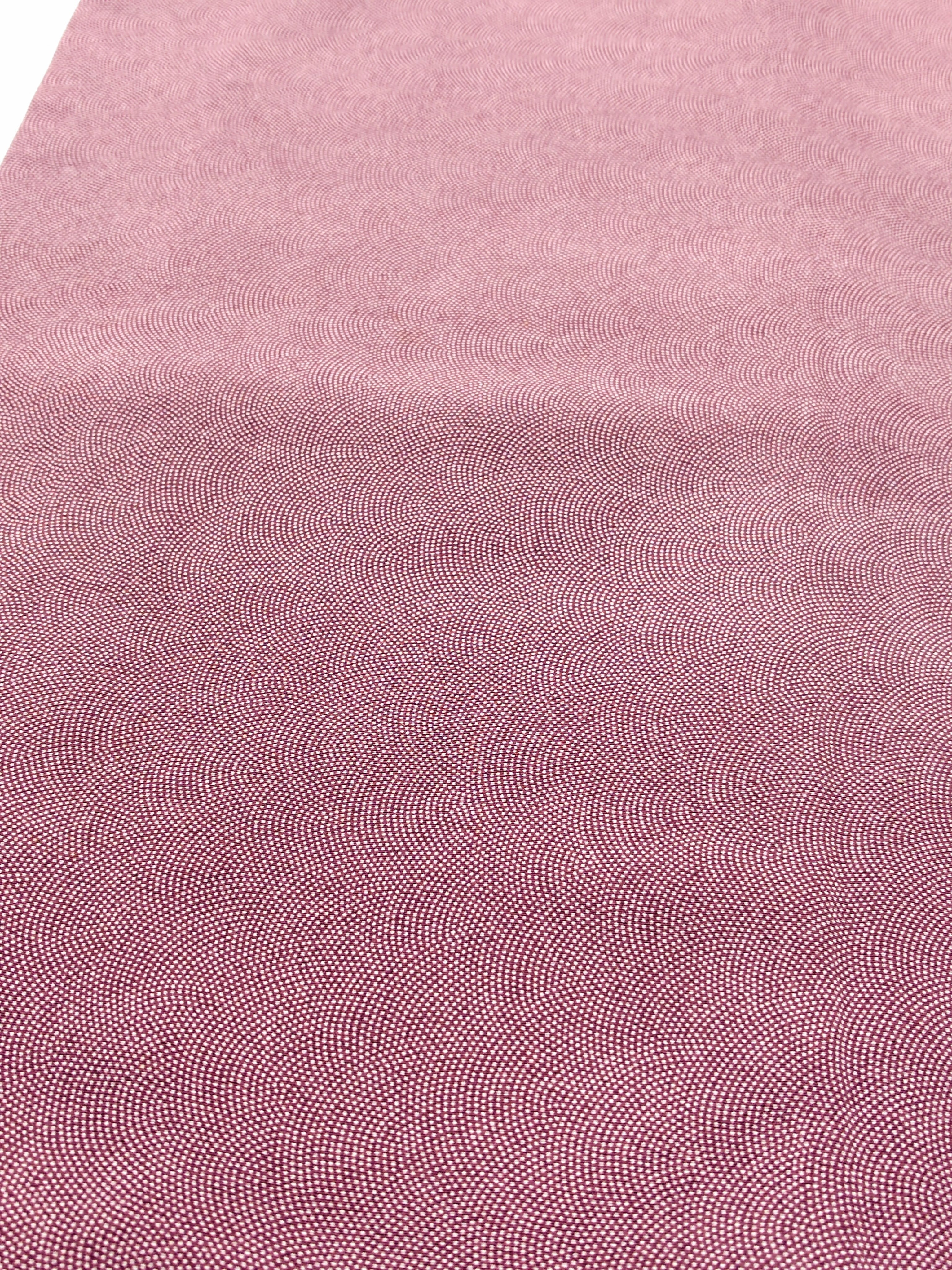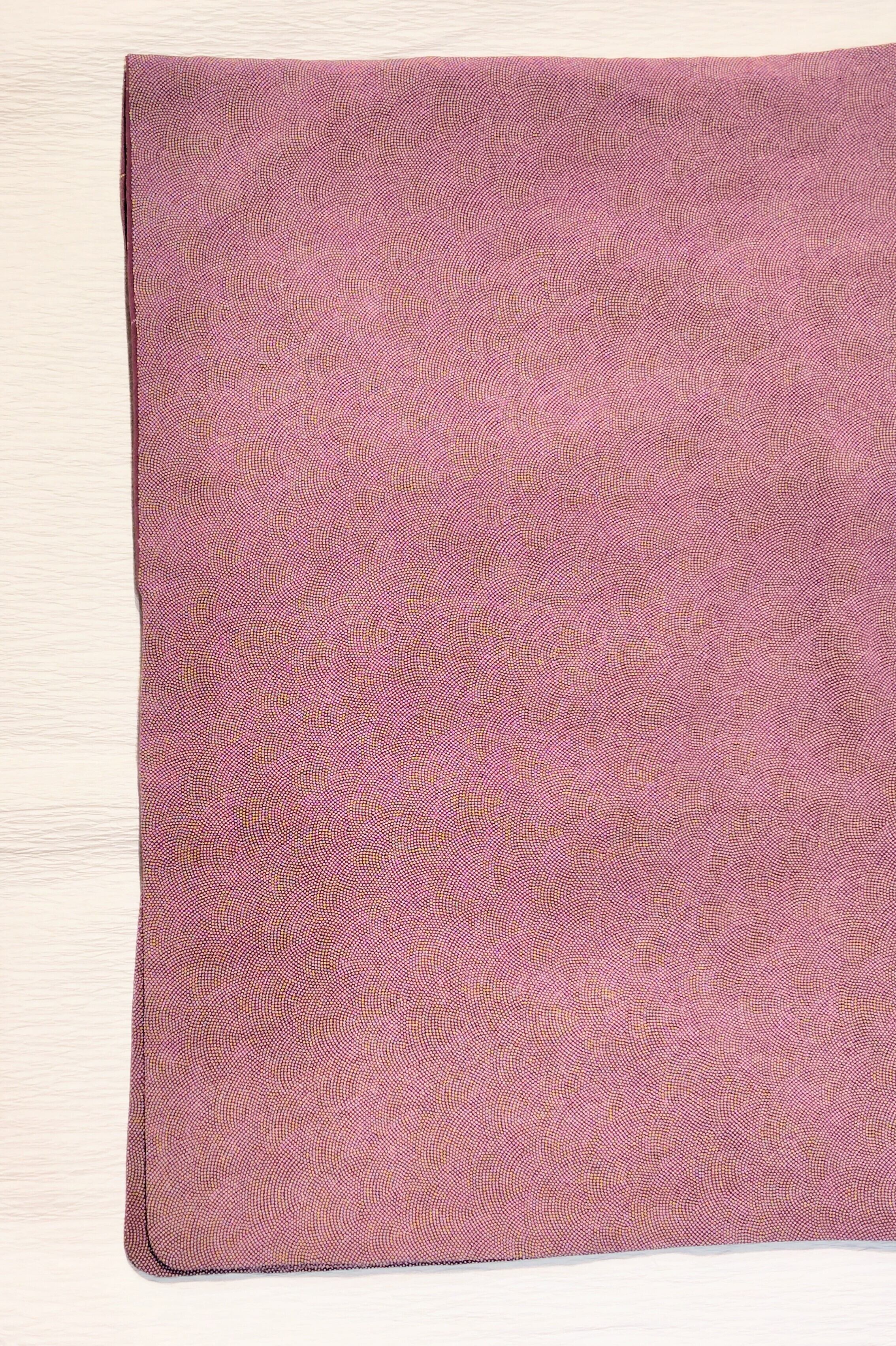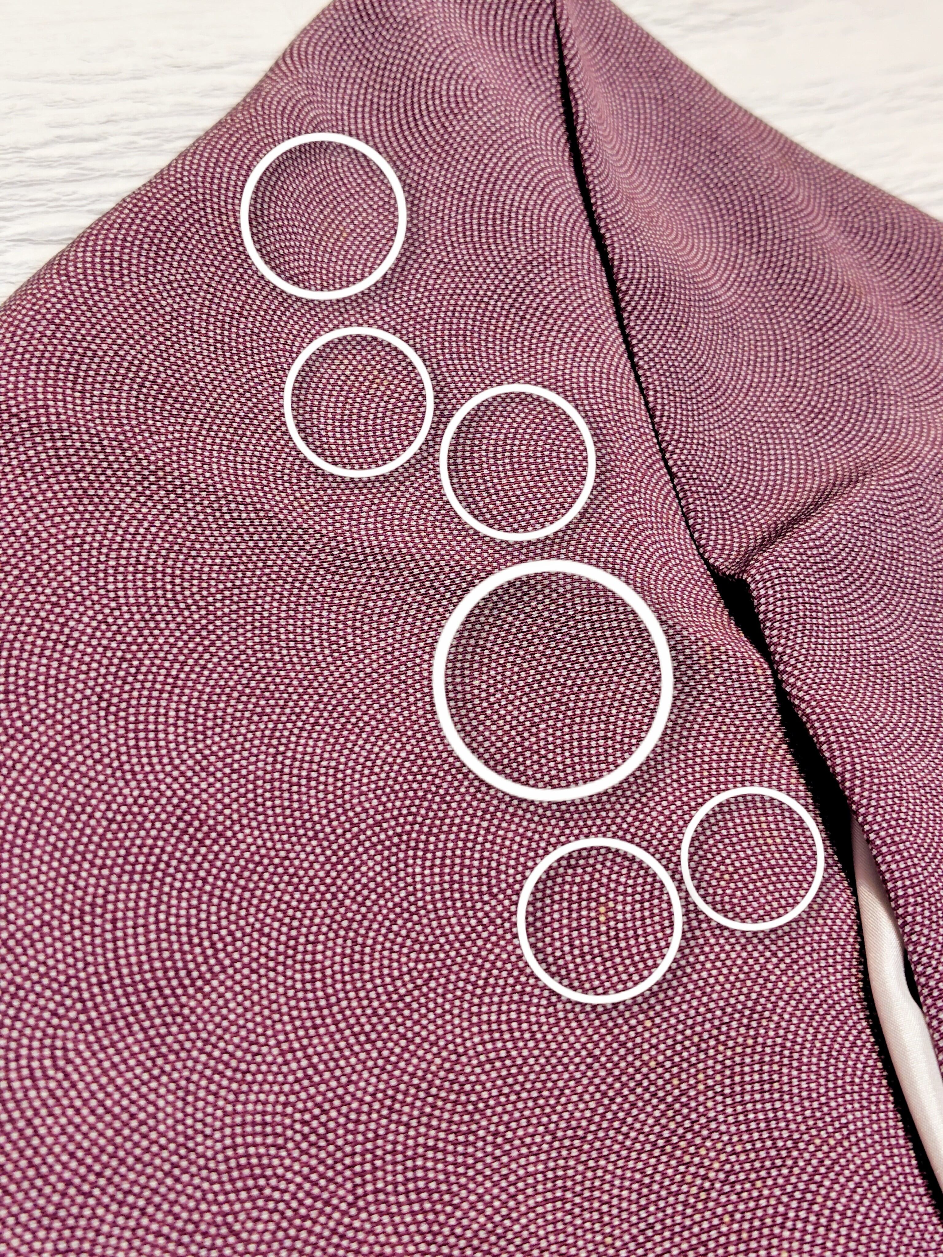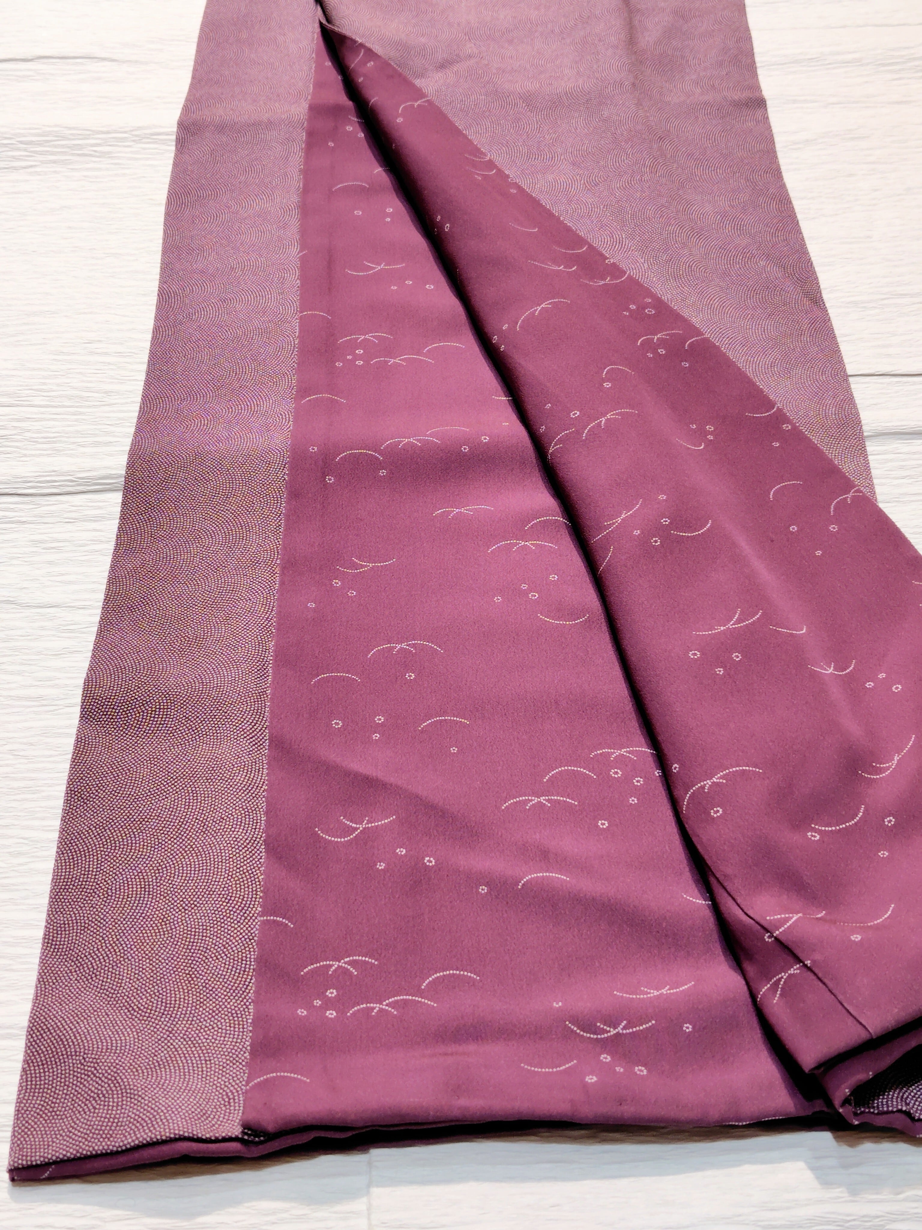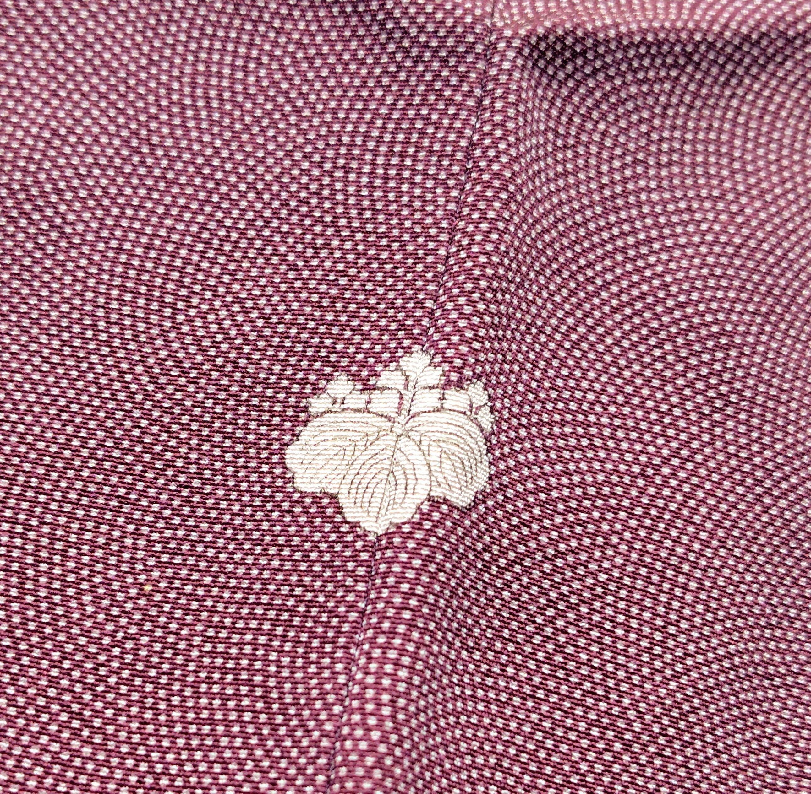 赤紫色(赤紫蘇を思わせるお色)の地色で落ち着いた印象、お茶席や趣味のお出かけにも映えます。