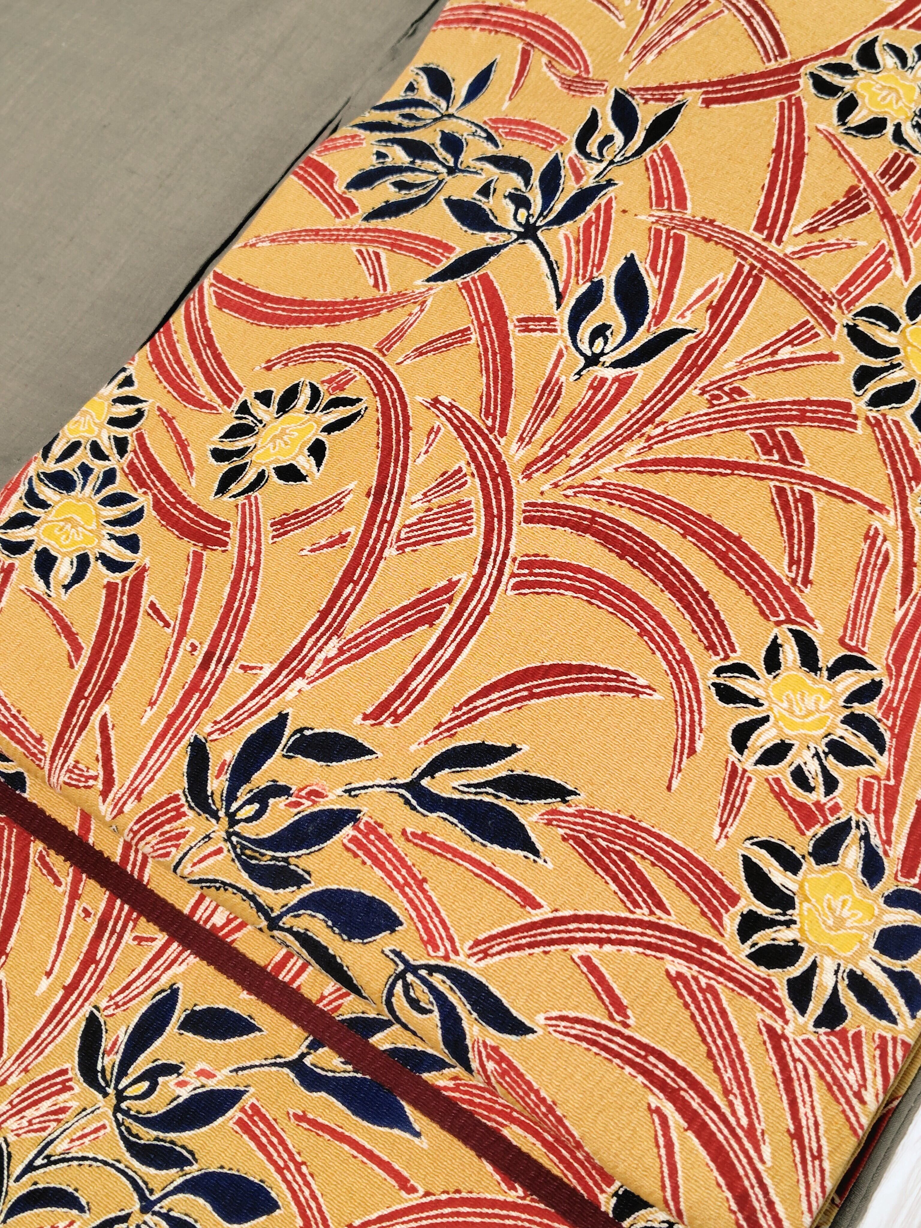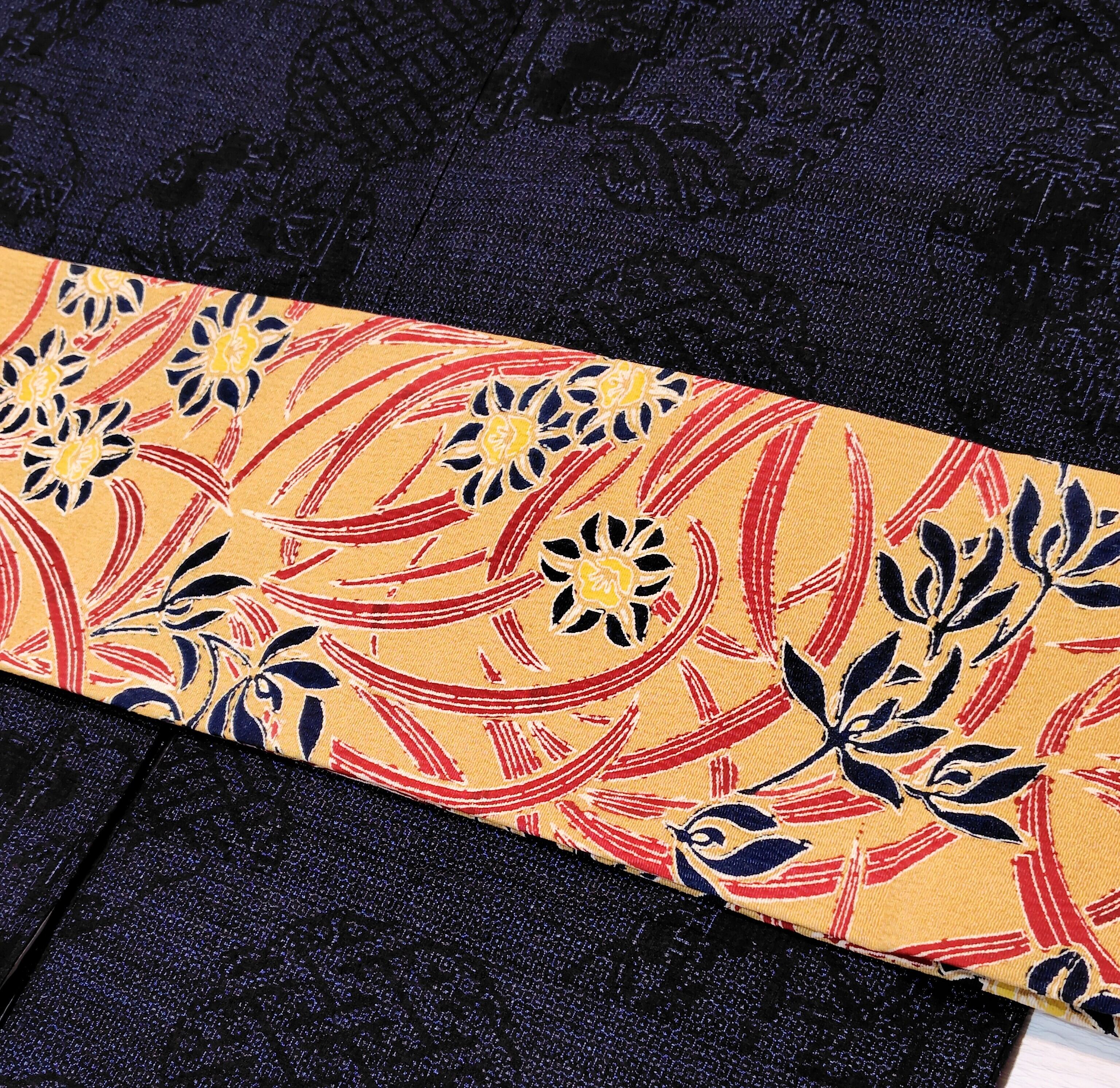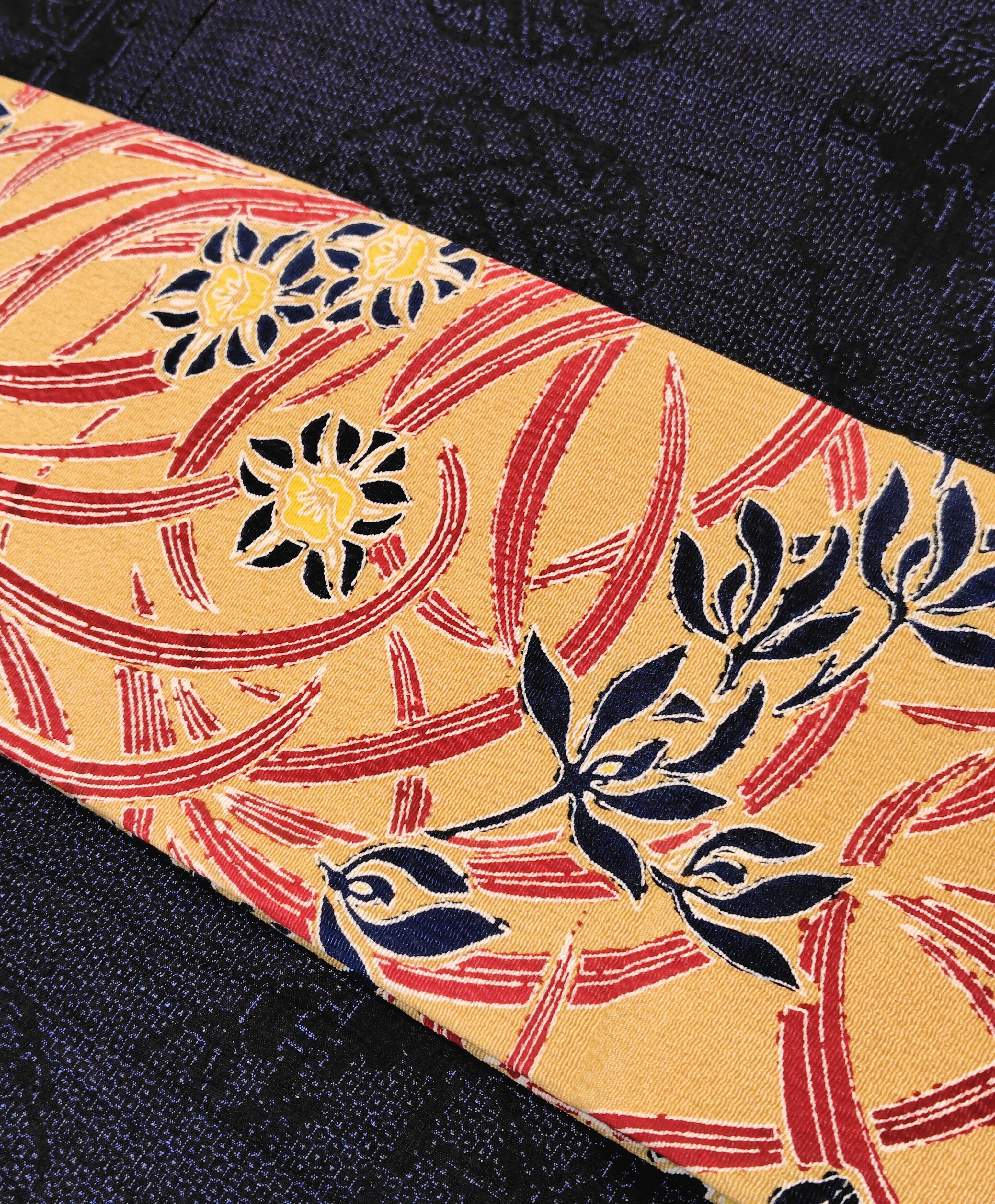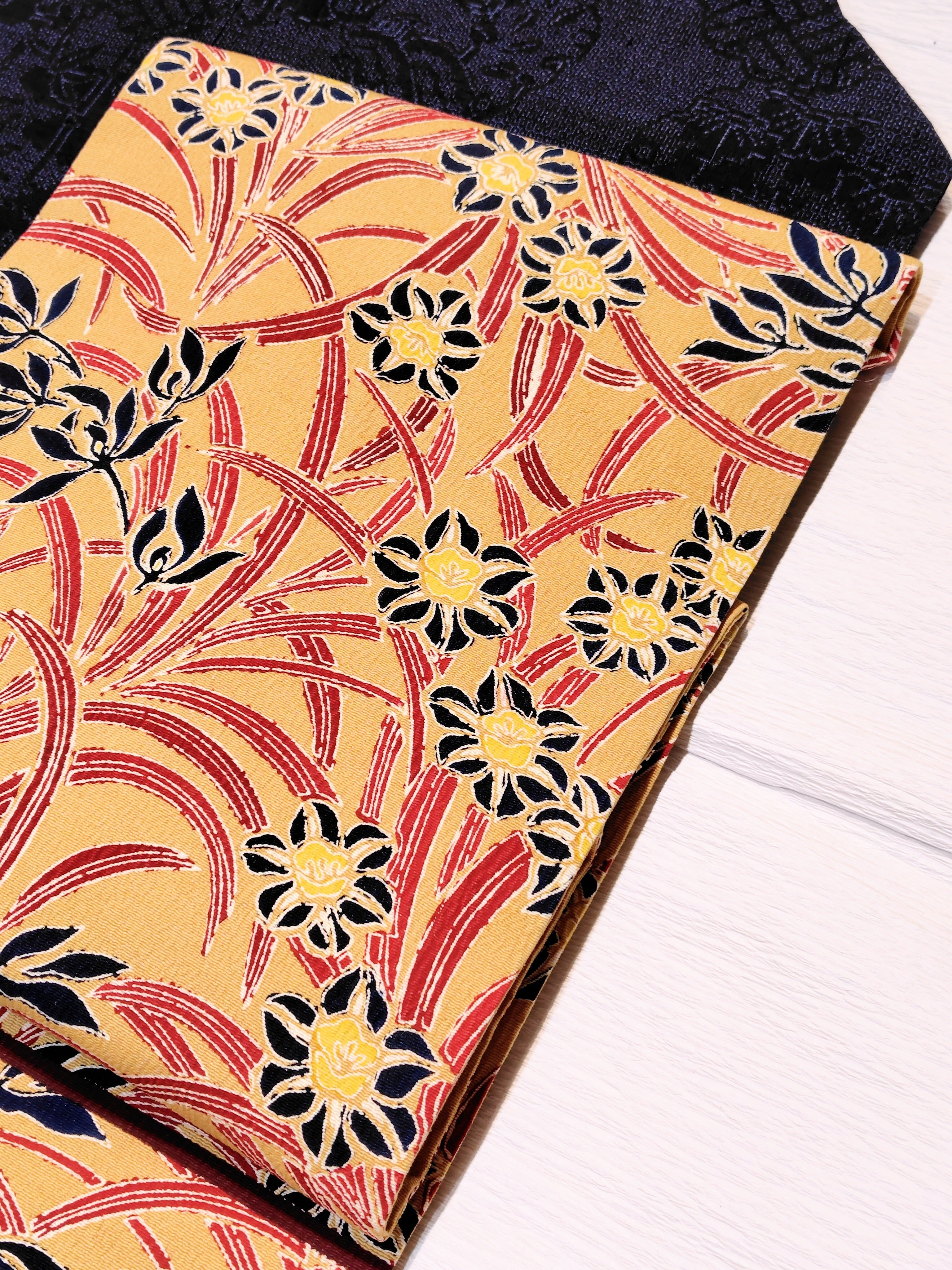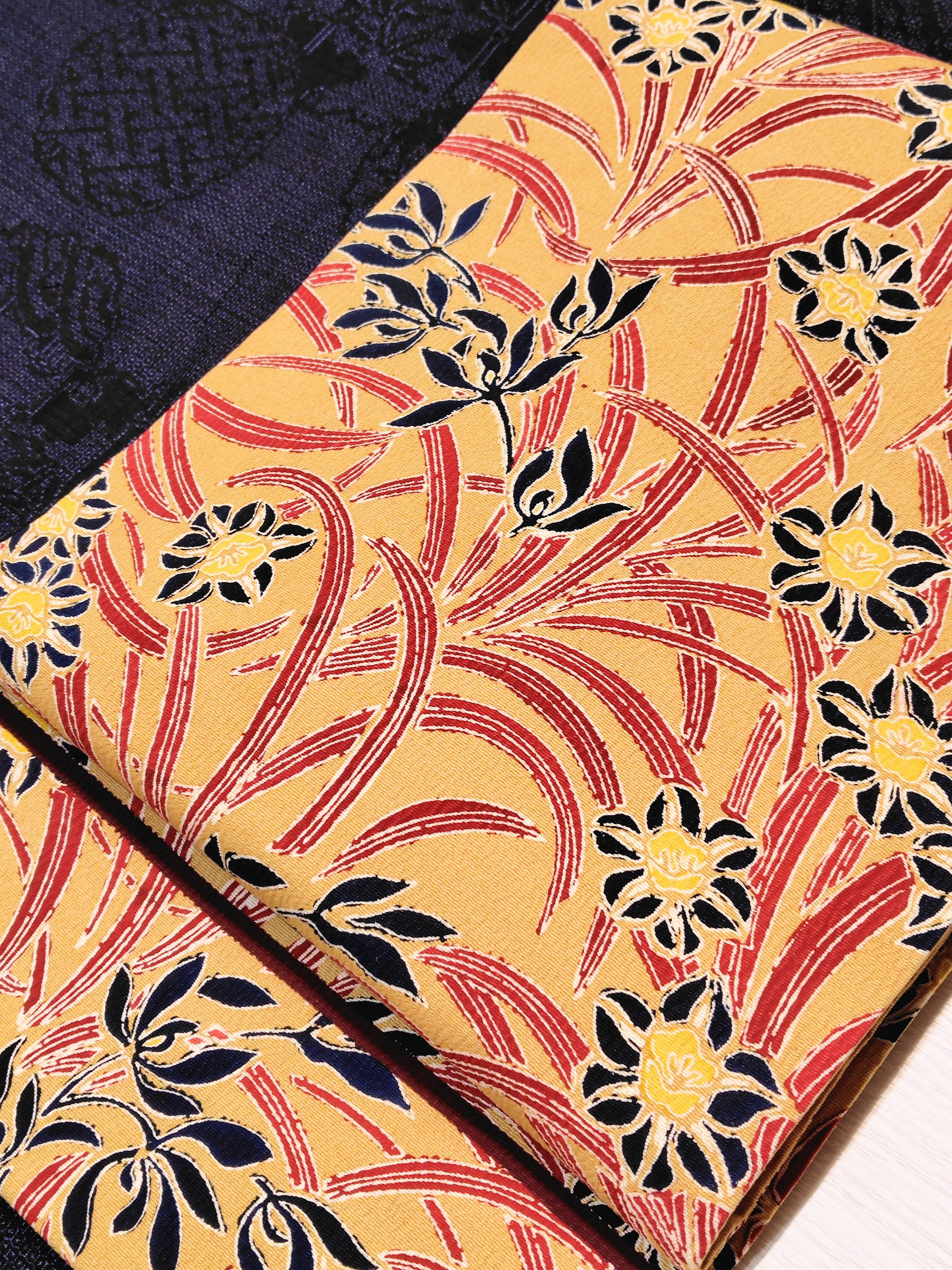 淡い芥子色の地に上品な深みのある赤色と黒色にも見える深い藍色の組み合わせ、とてもシックな印象です。