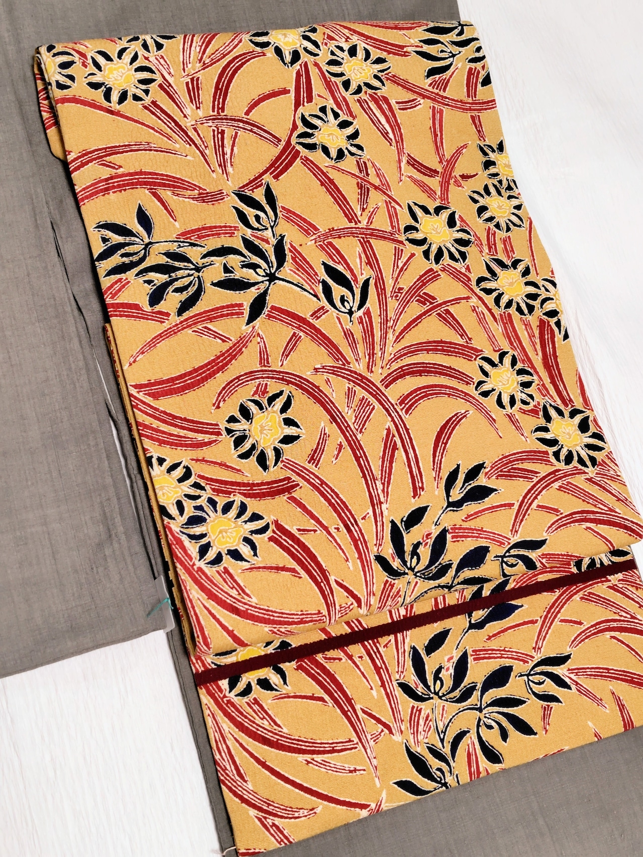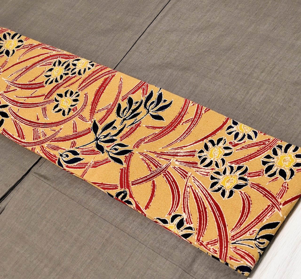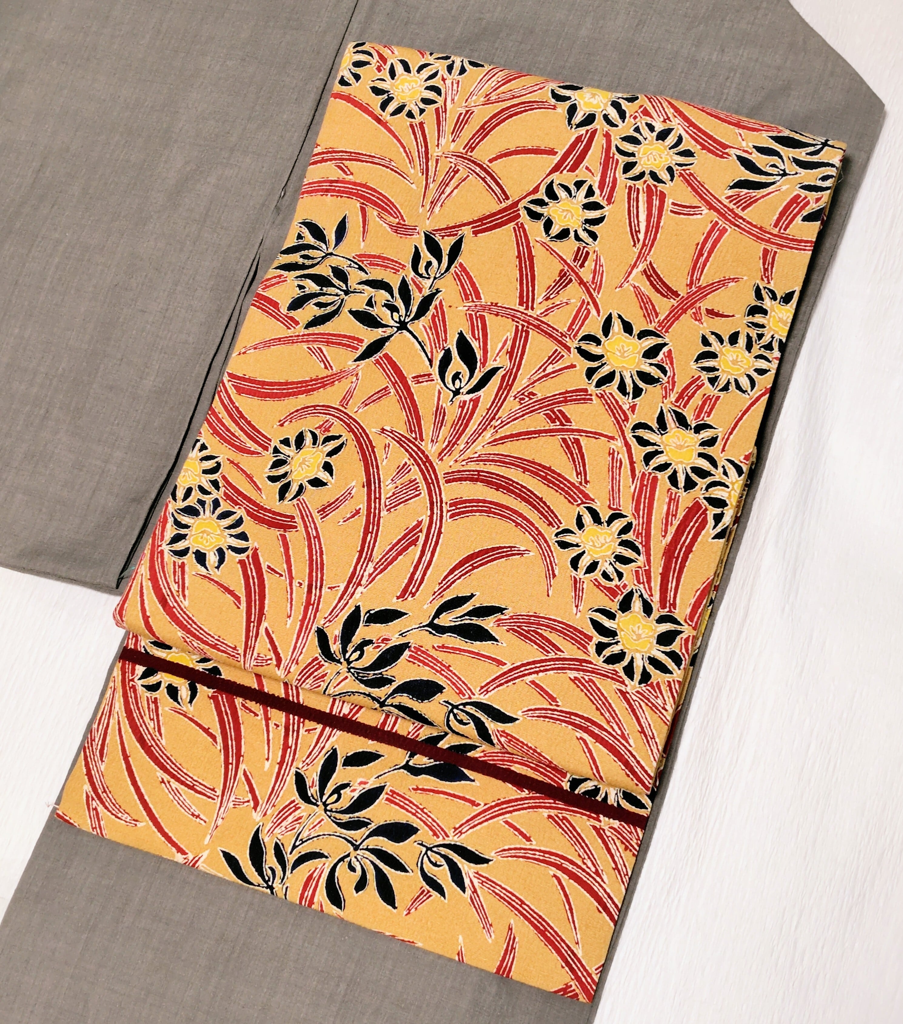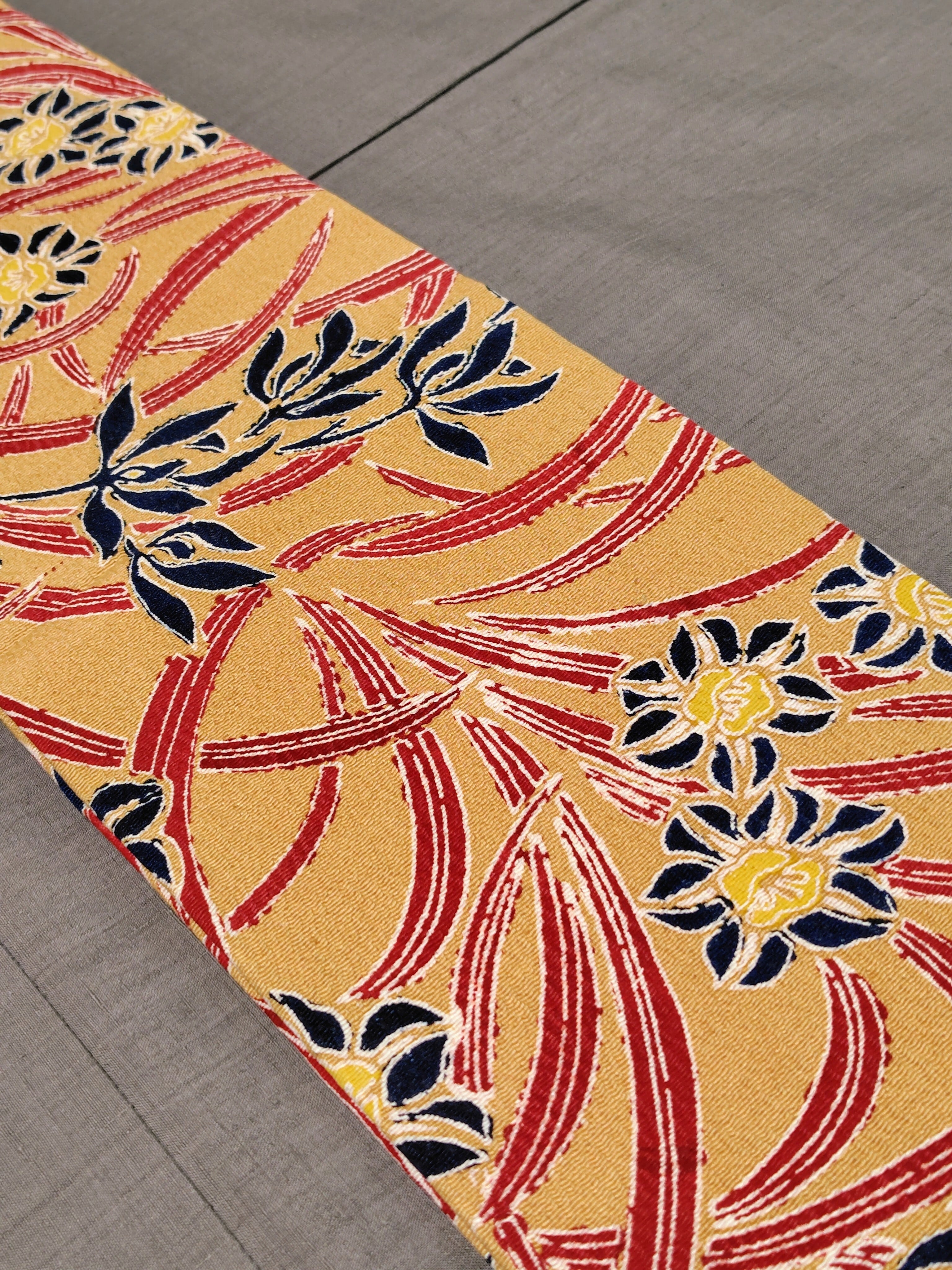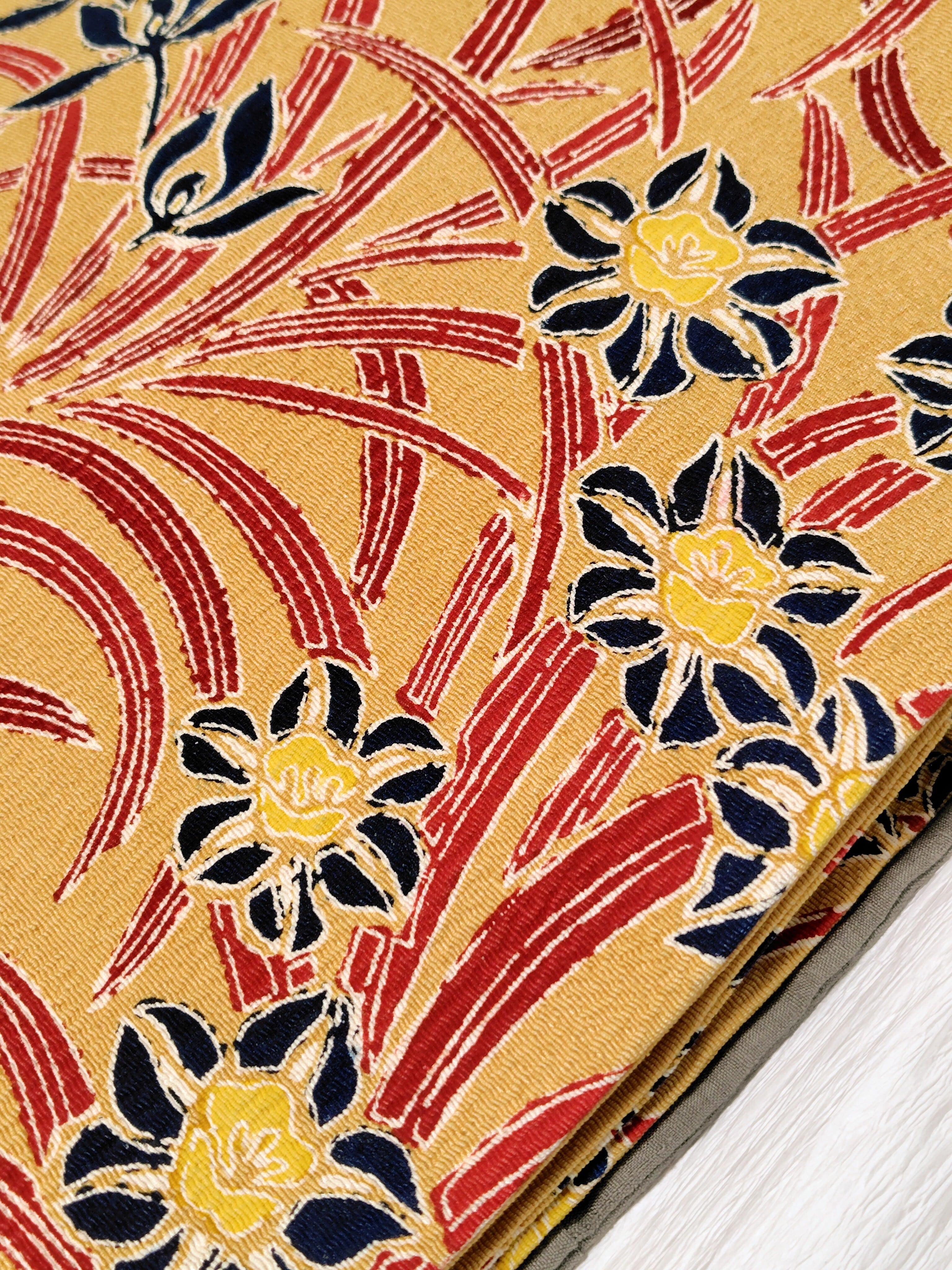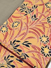 淡い芥子色の地に上品な深みのある赤色と黒色にも見える深い藍色の組み合わせ、とてもシックな印象です。