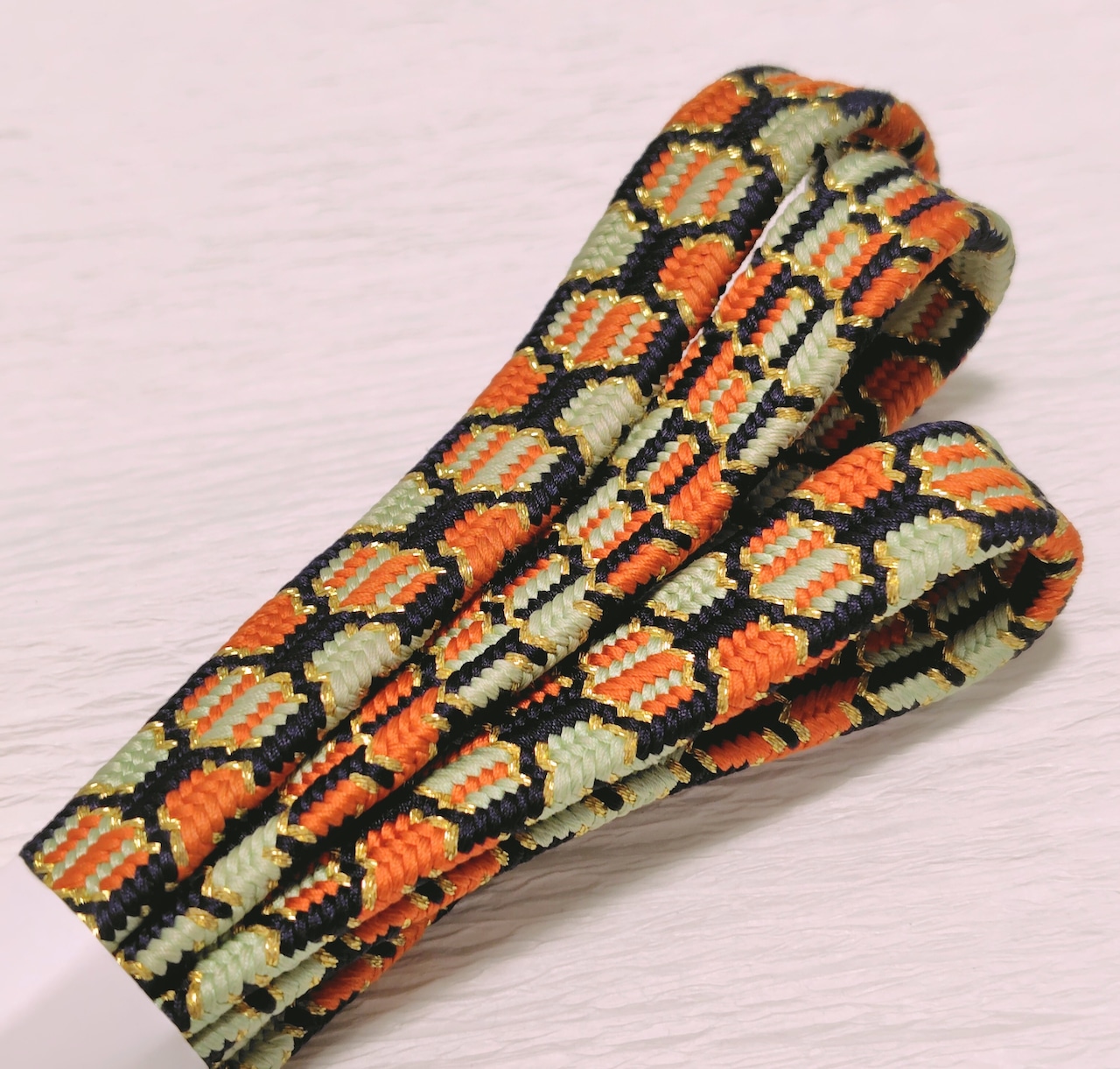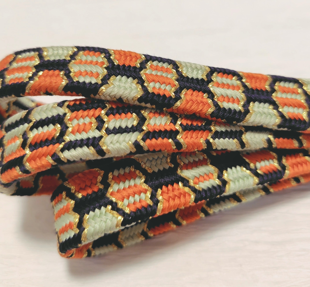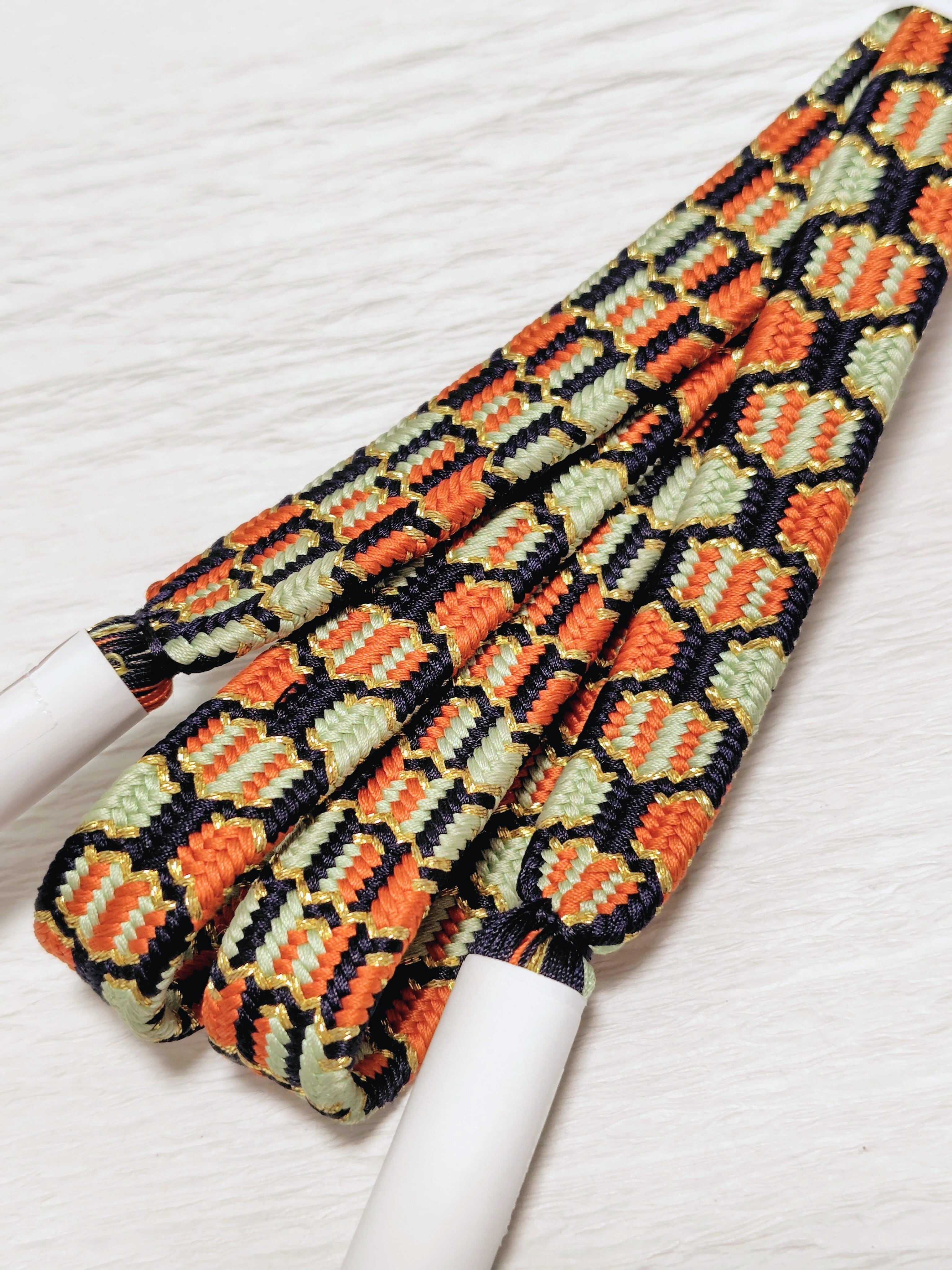 このタイプの道明製の資料が少なく、また限定品などの場合は調べきれないため、道明製と同じ程に組みや色合いが美しく上質な亀甲組の帯締めとしてご紹介します。