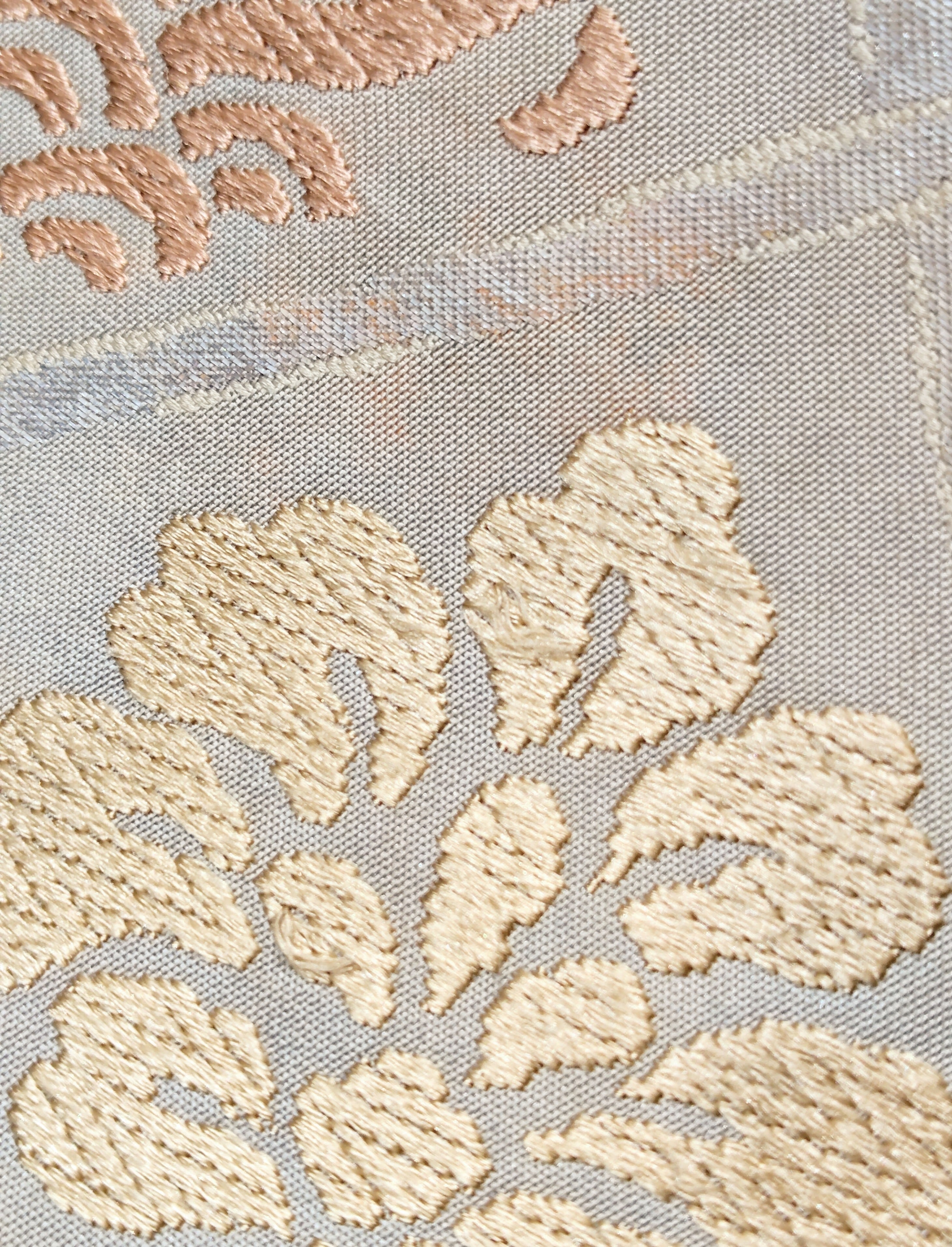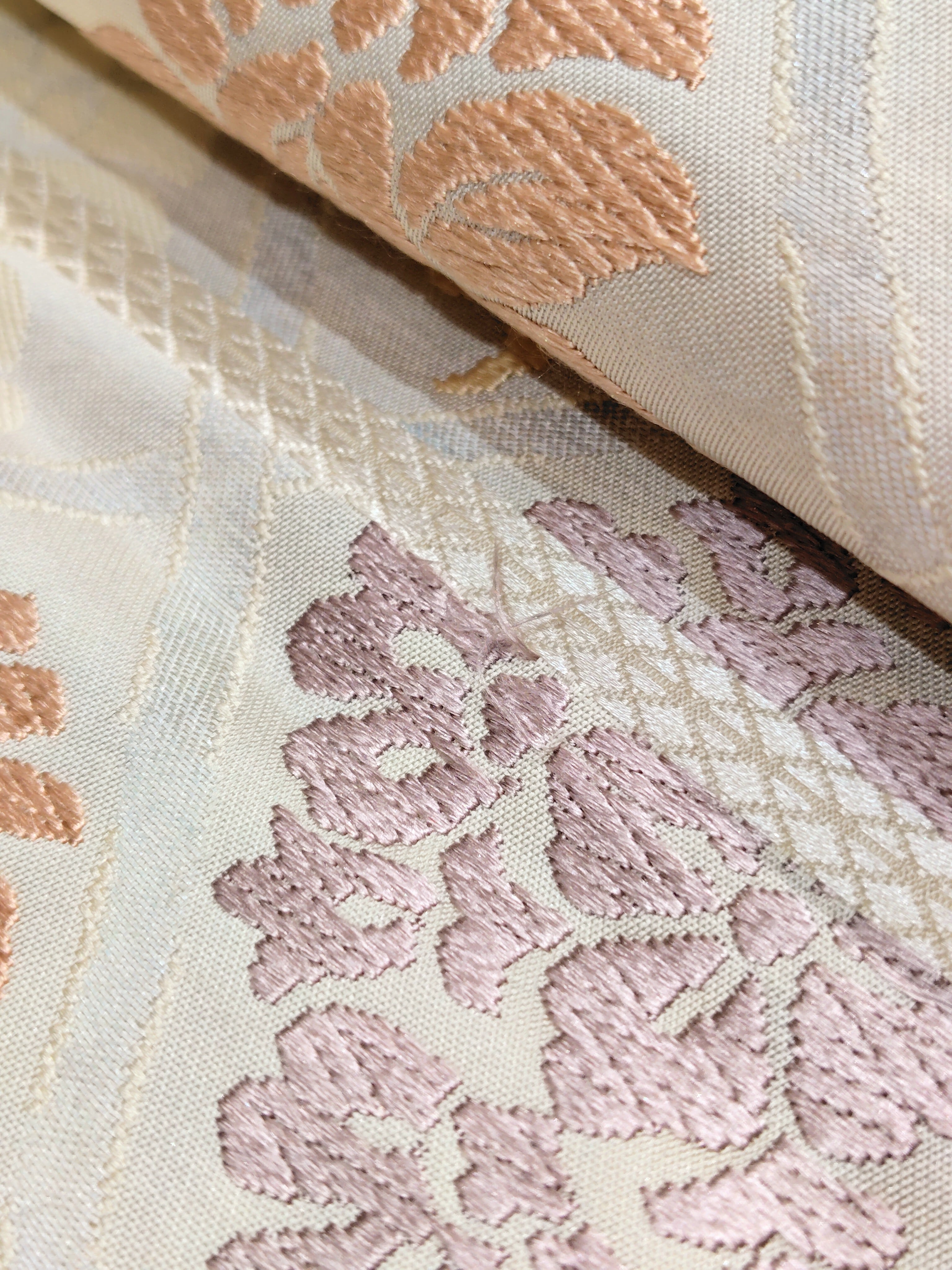 (多少の糸の毛羽立ちや糸飛び出しなどがありますが、唐織に慣れていらっしゃる方なら気にならない程度だと思います。)