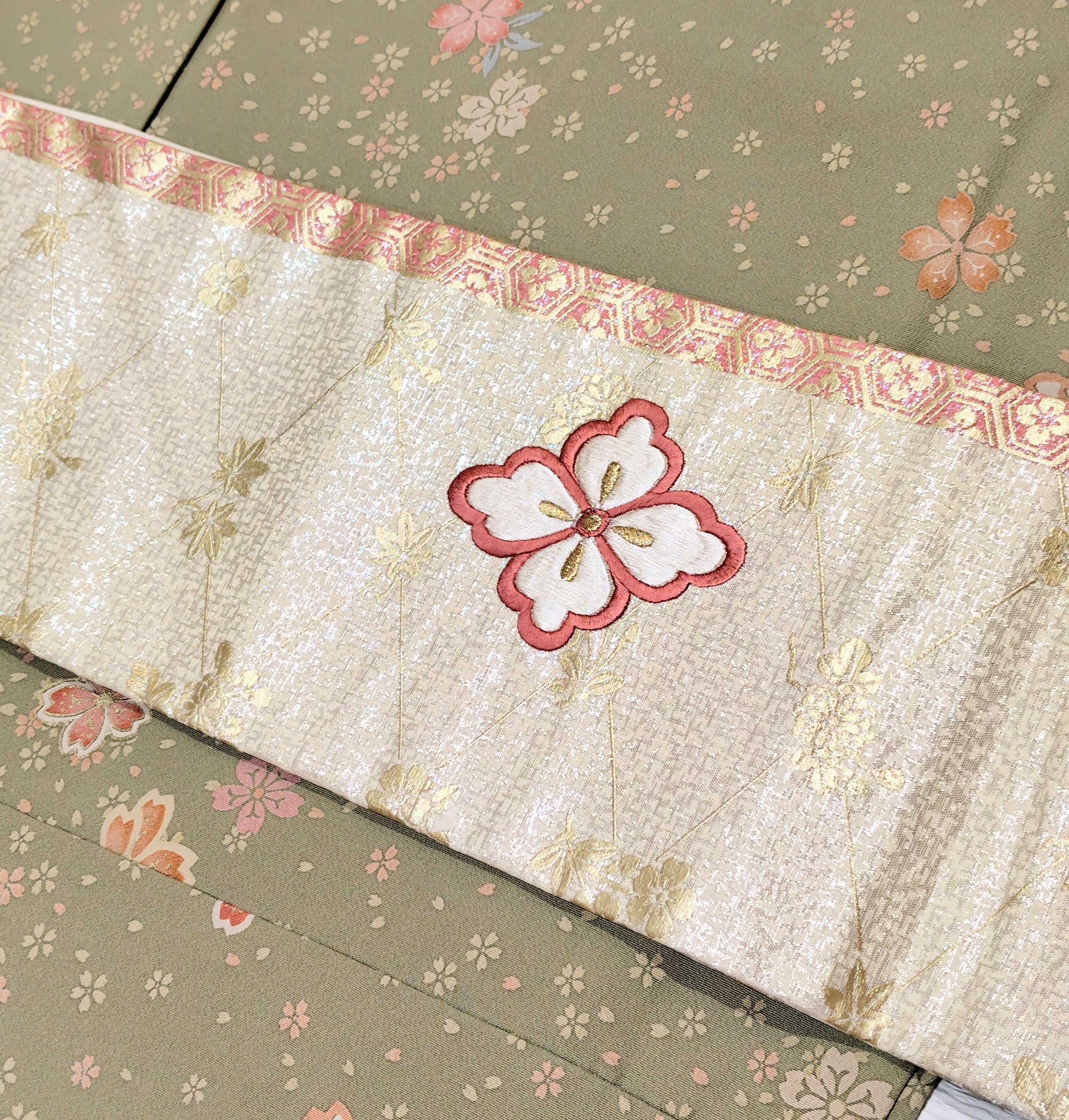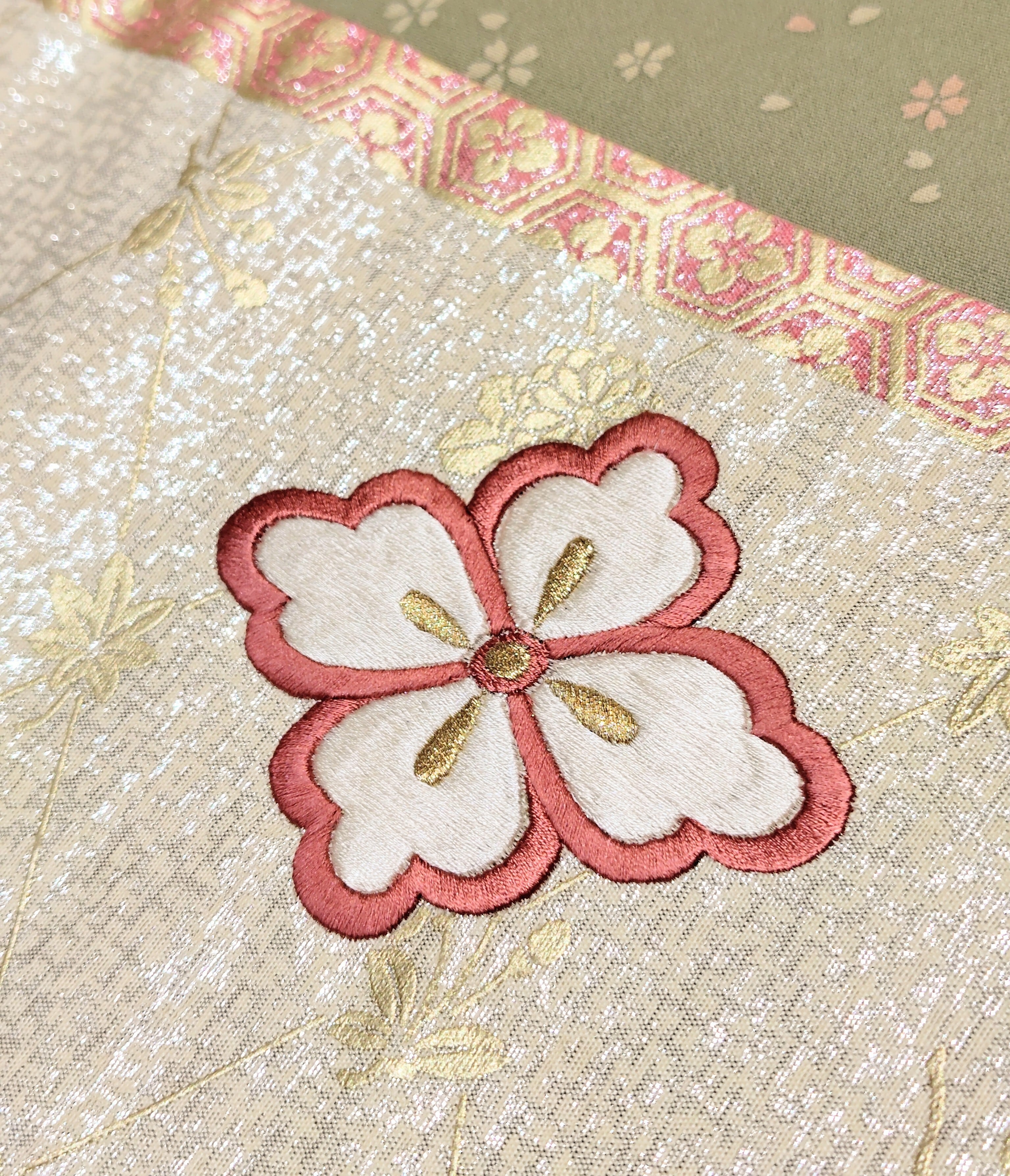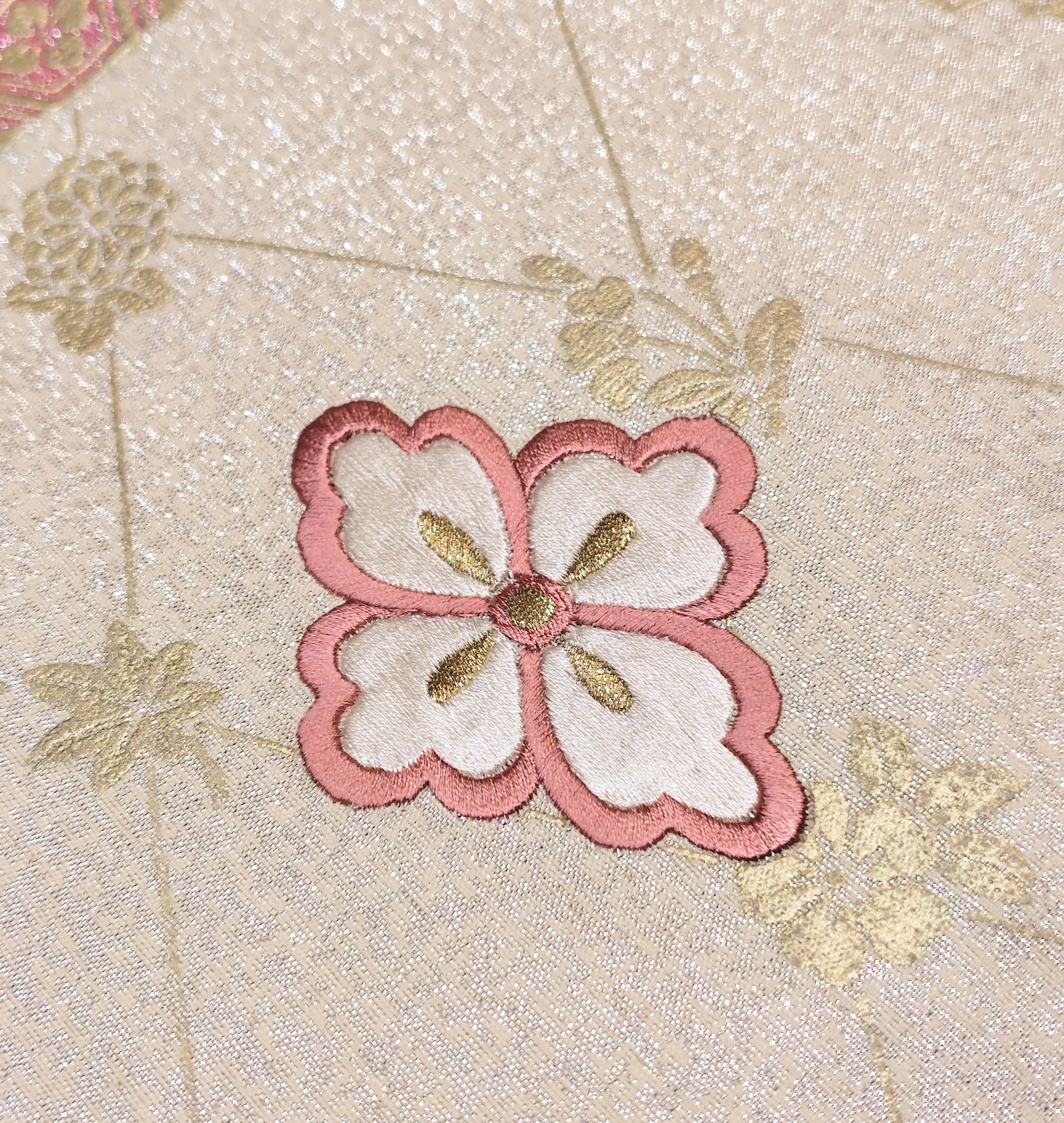 ピンク色と白色の花菱文は刺繍です。