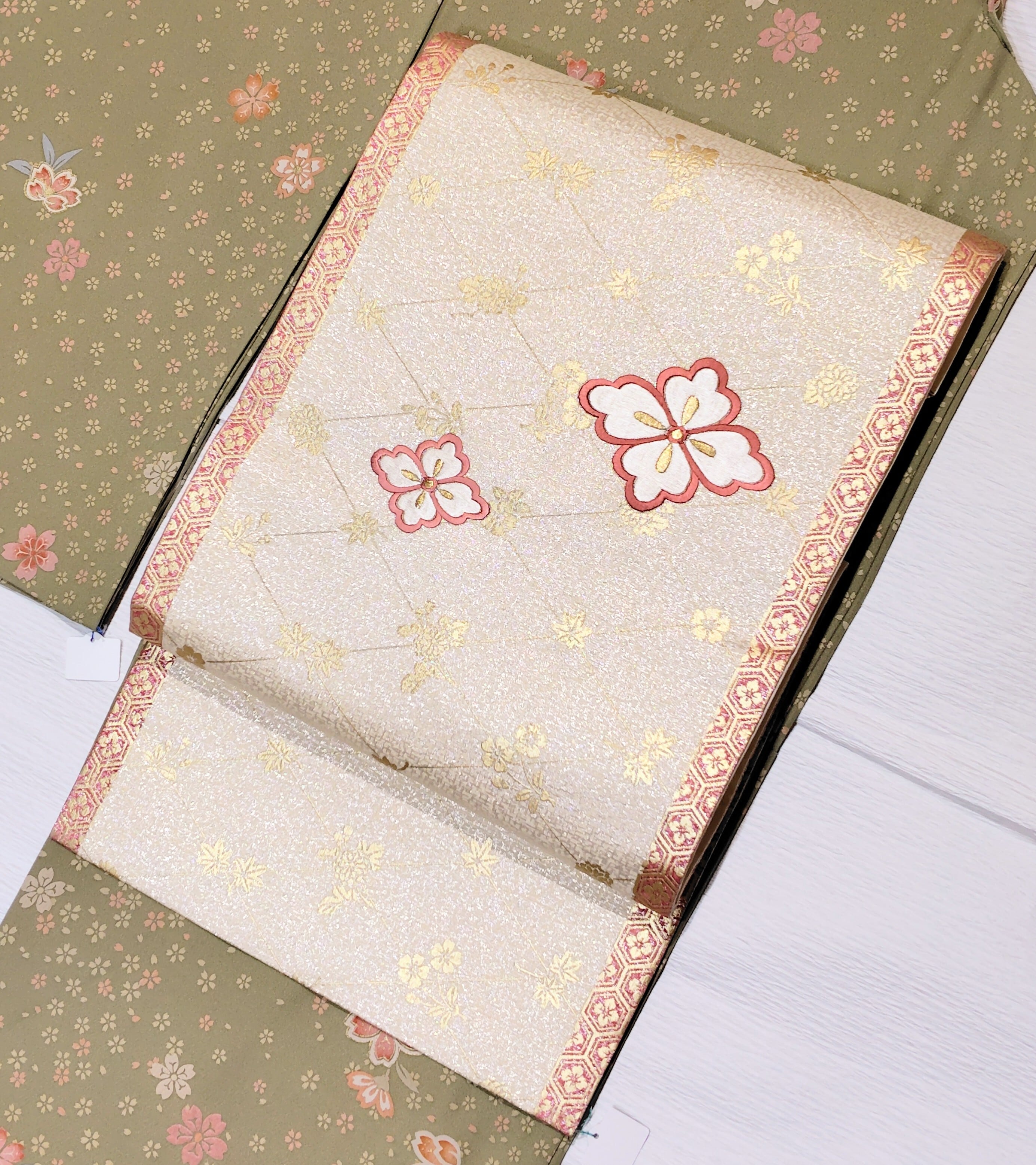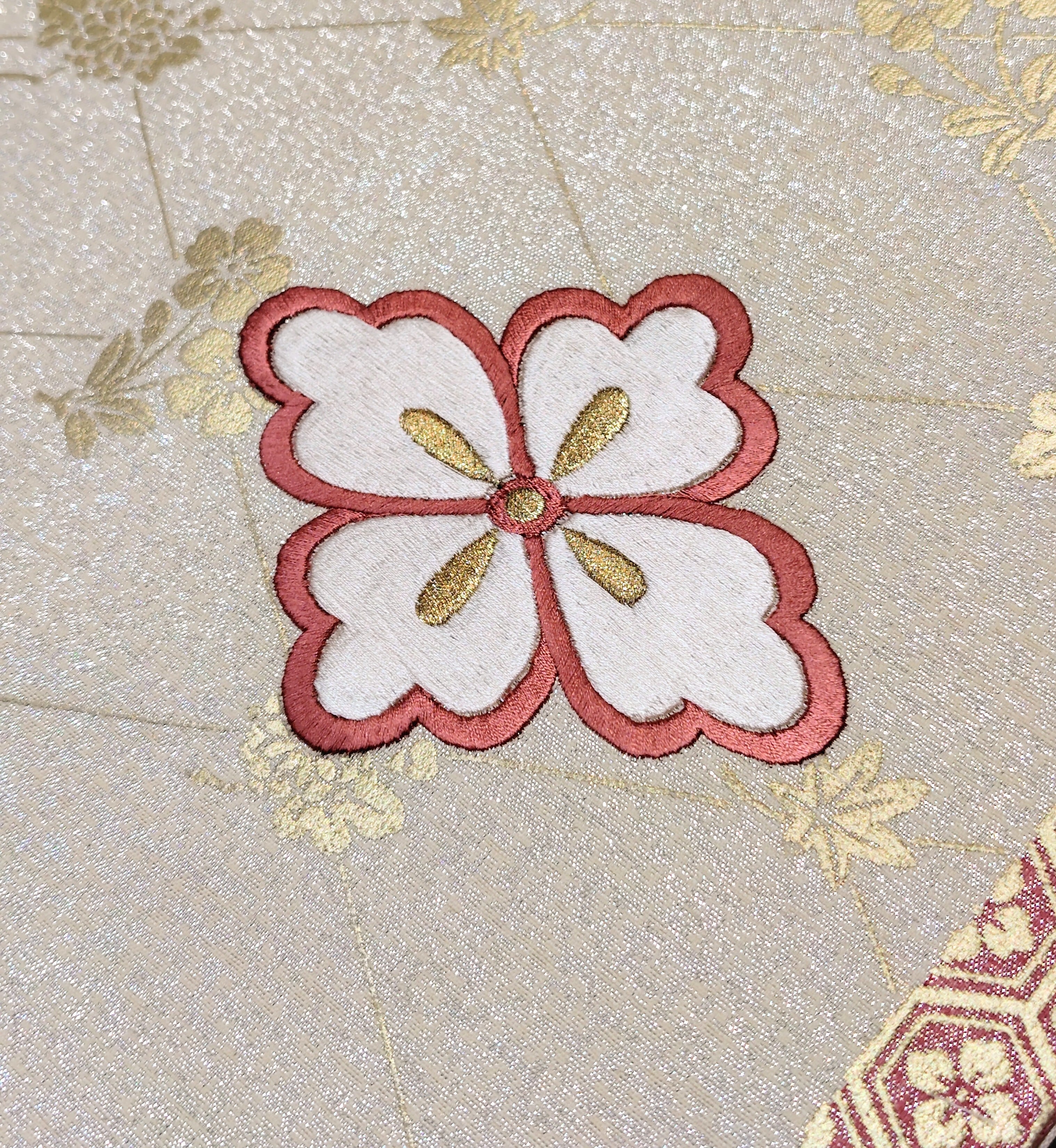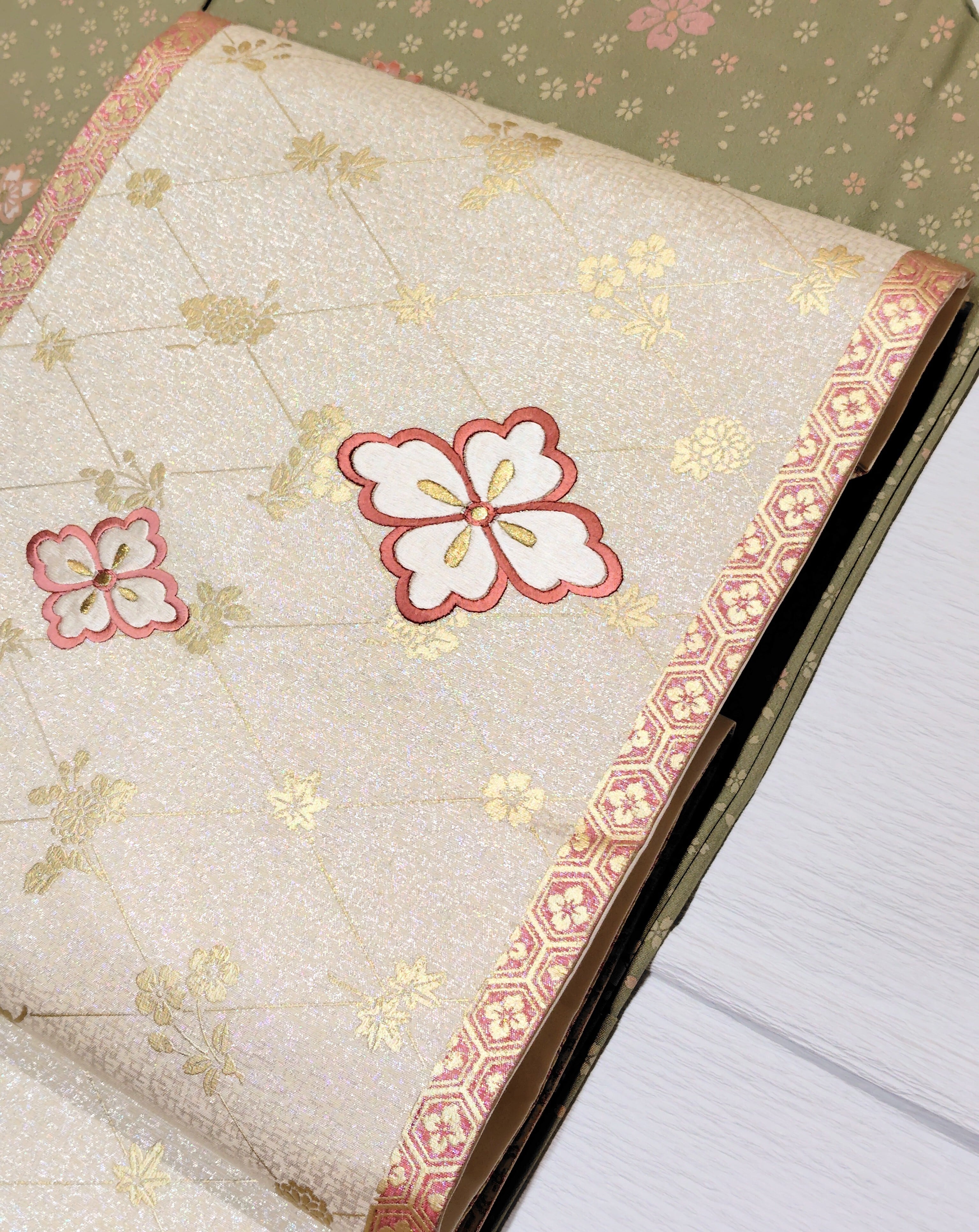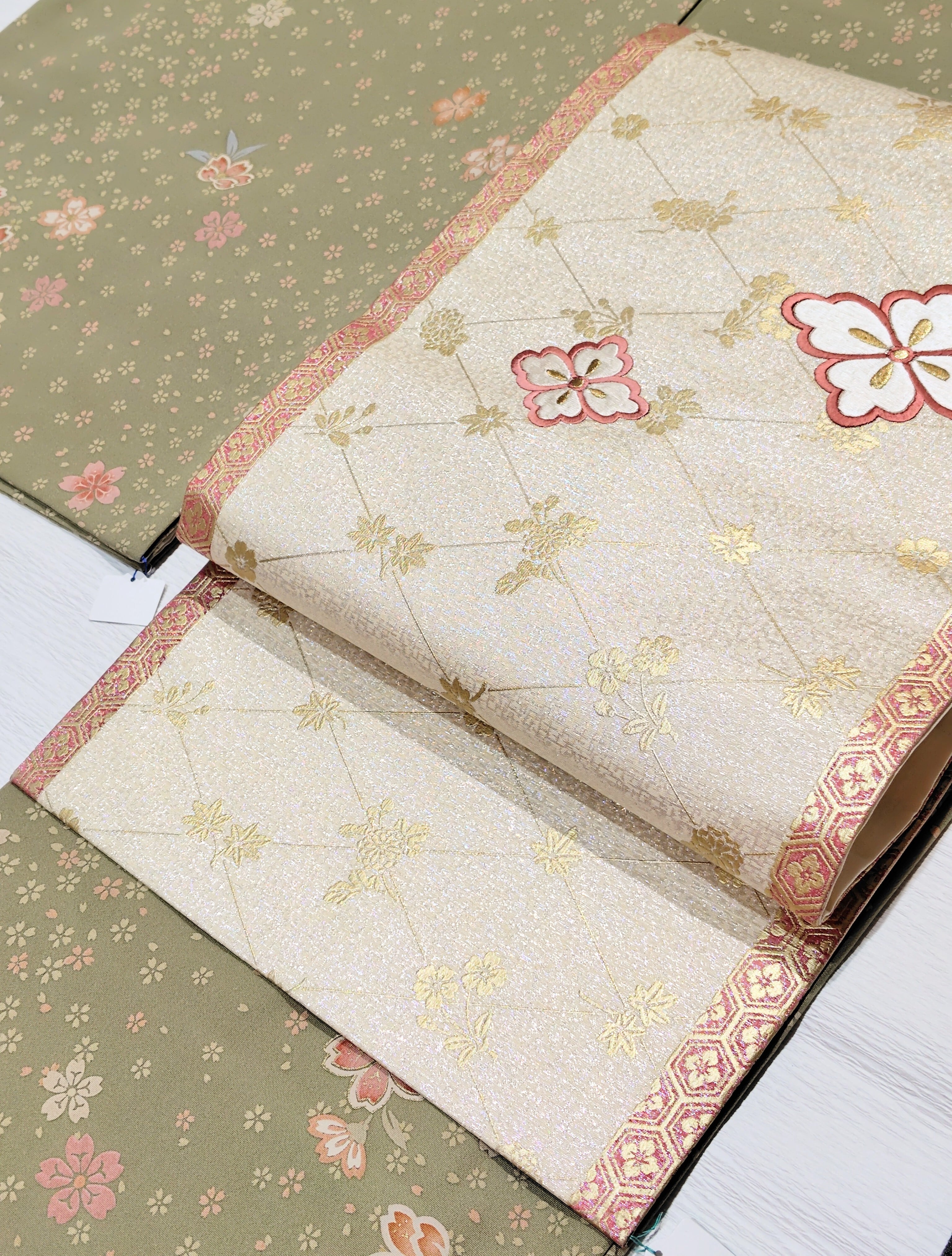 ピンク色と白色の花菱文は刺繍です。