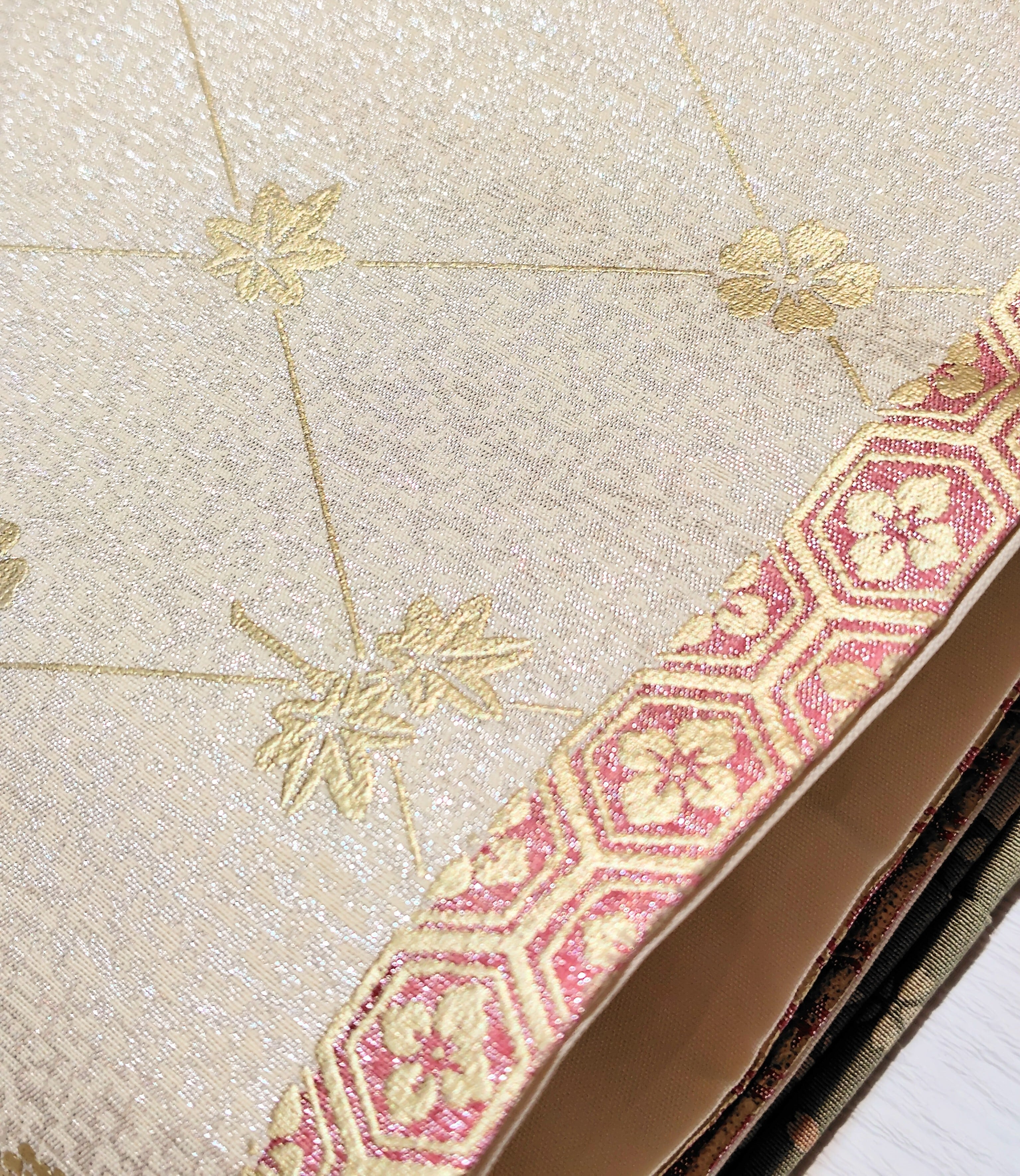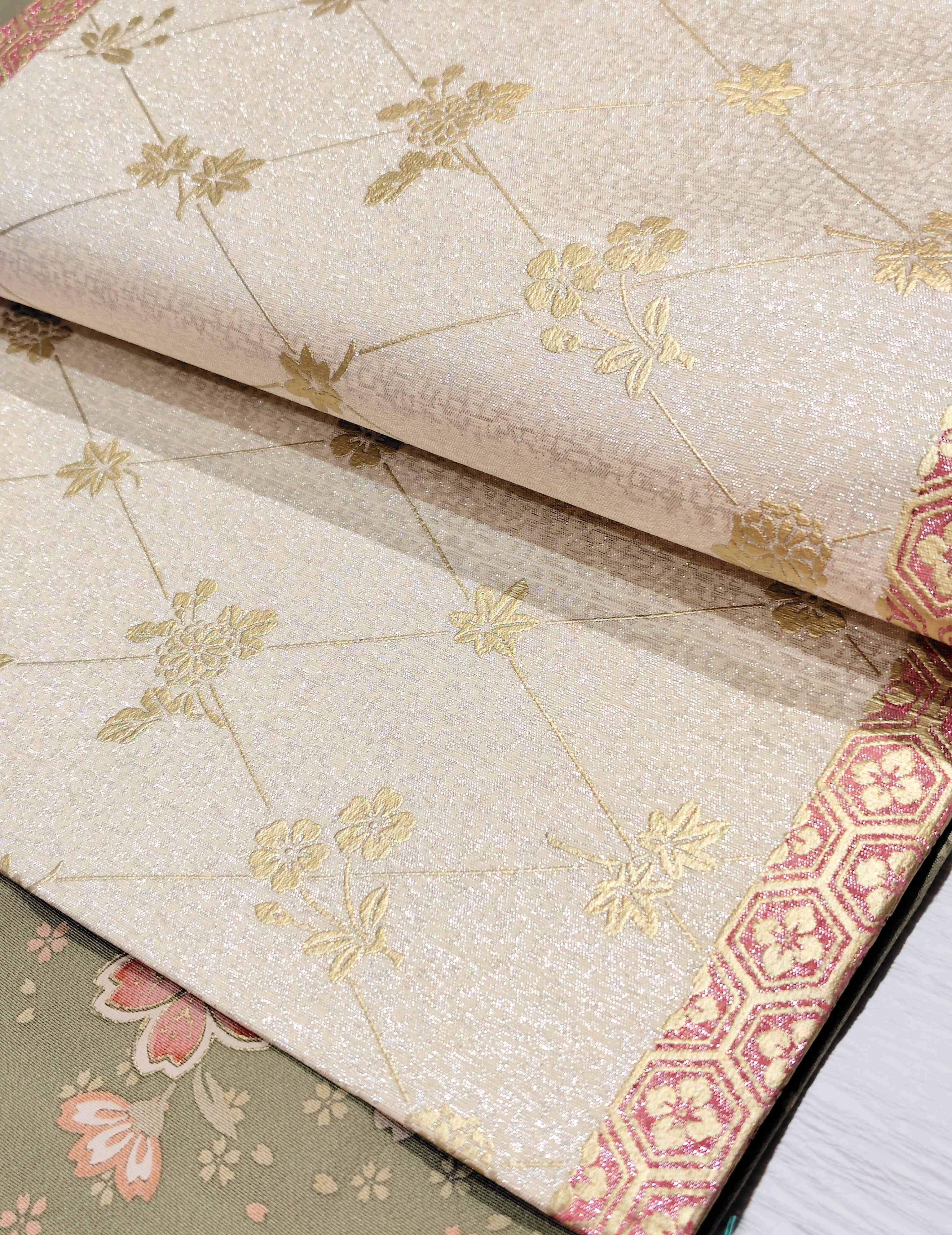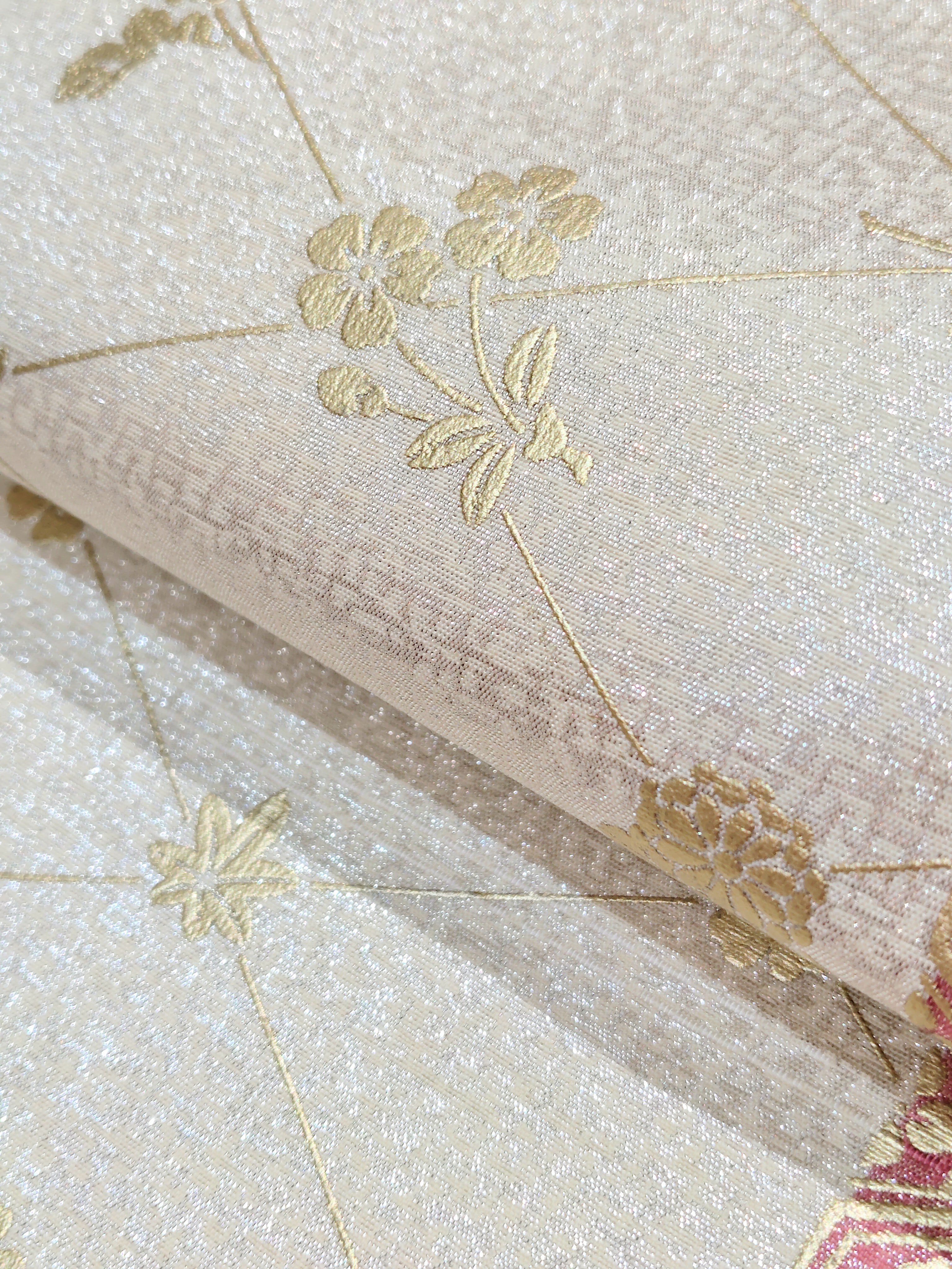 金色で亀甲に花菱、菱形に花(桜、紅葉、菊)の染め。