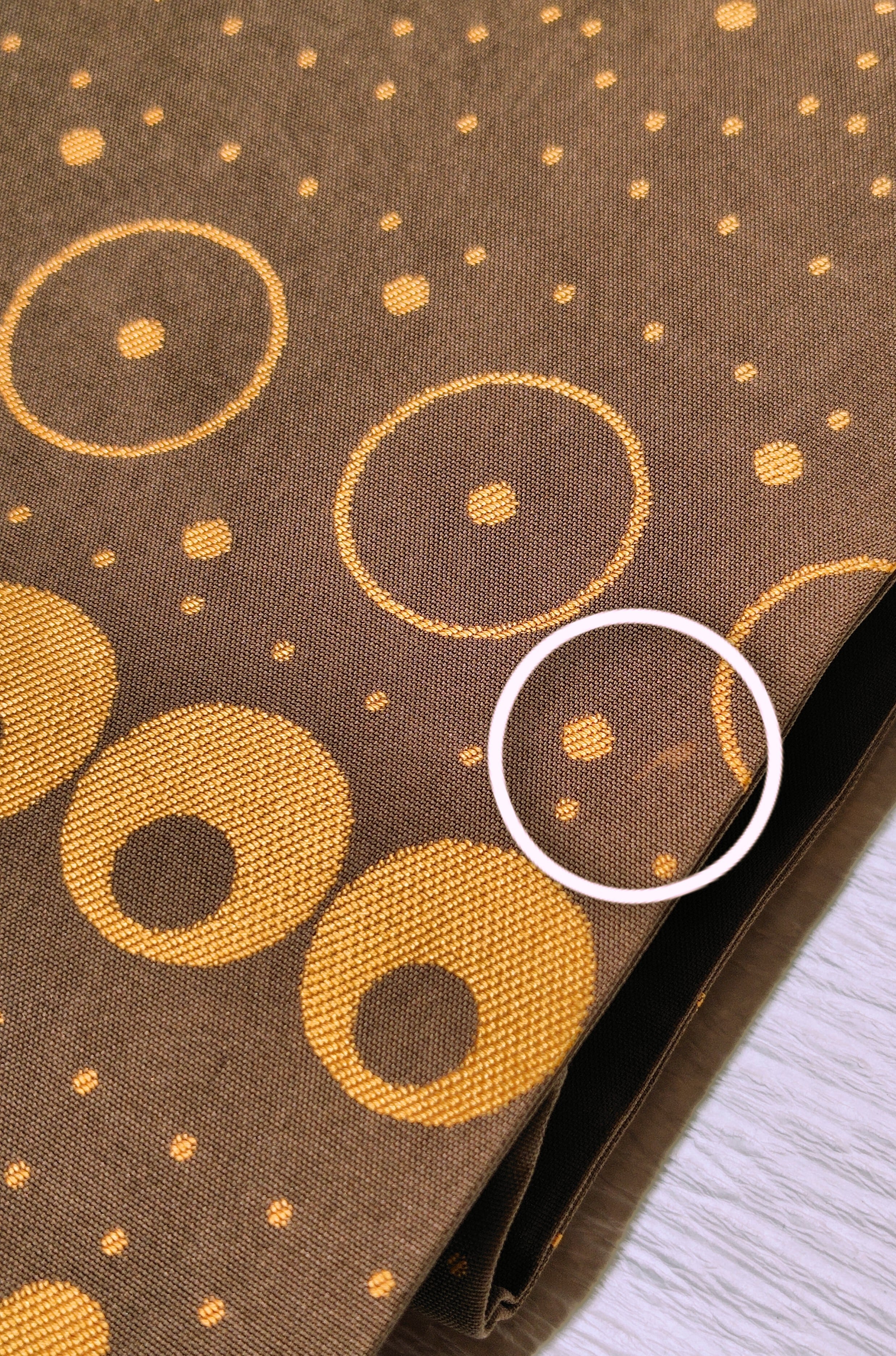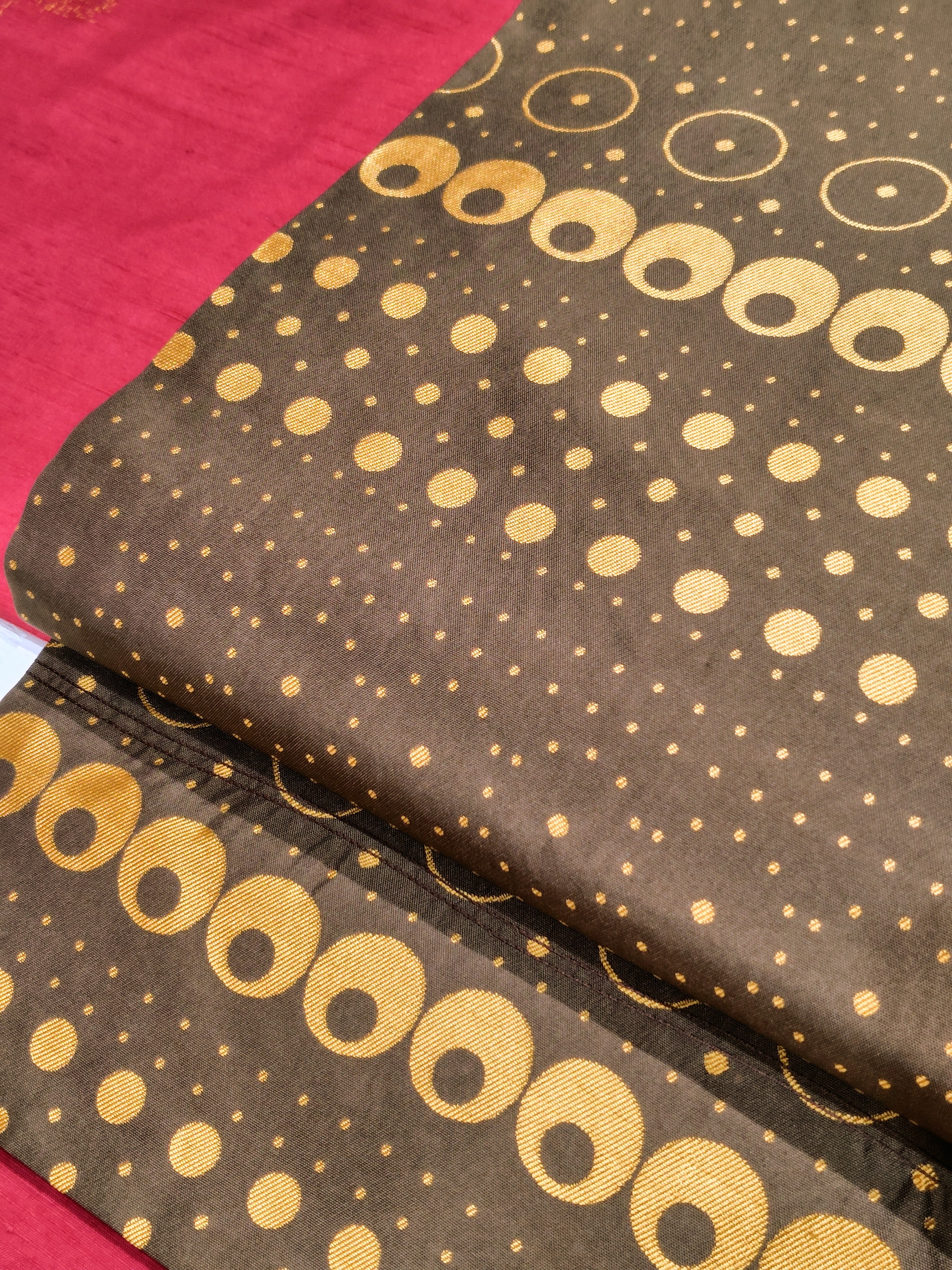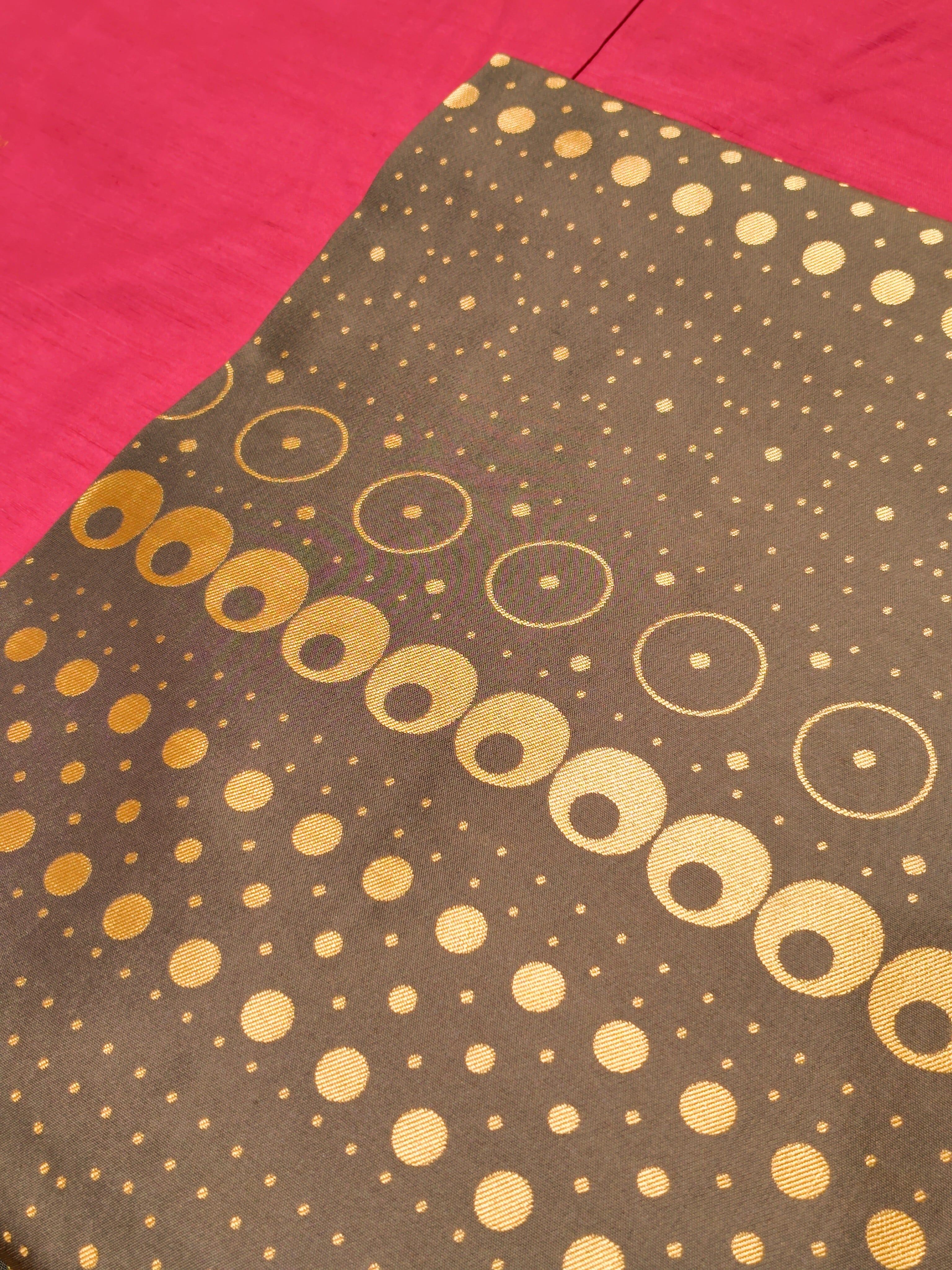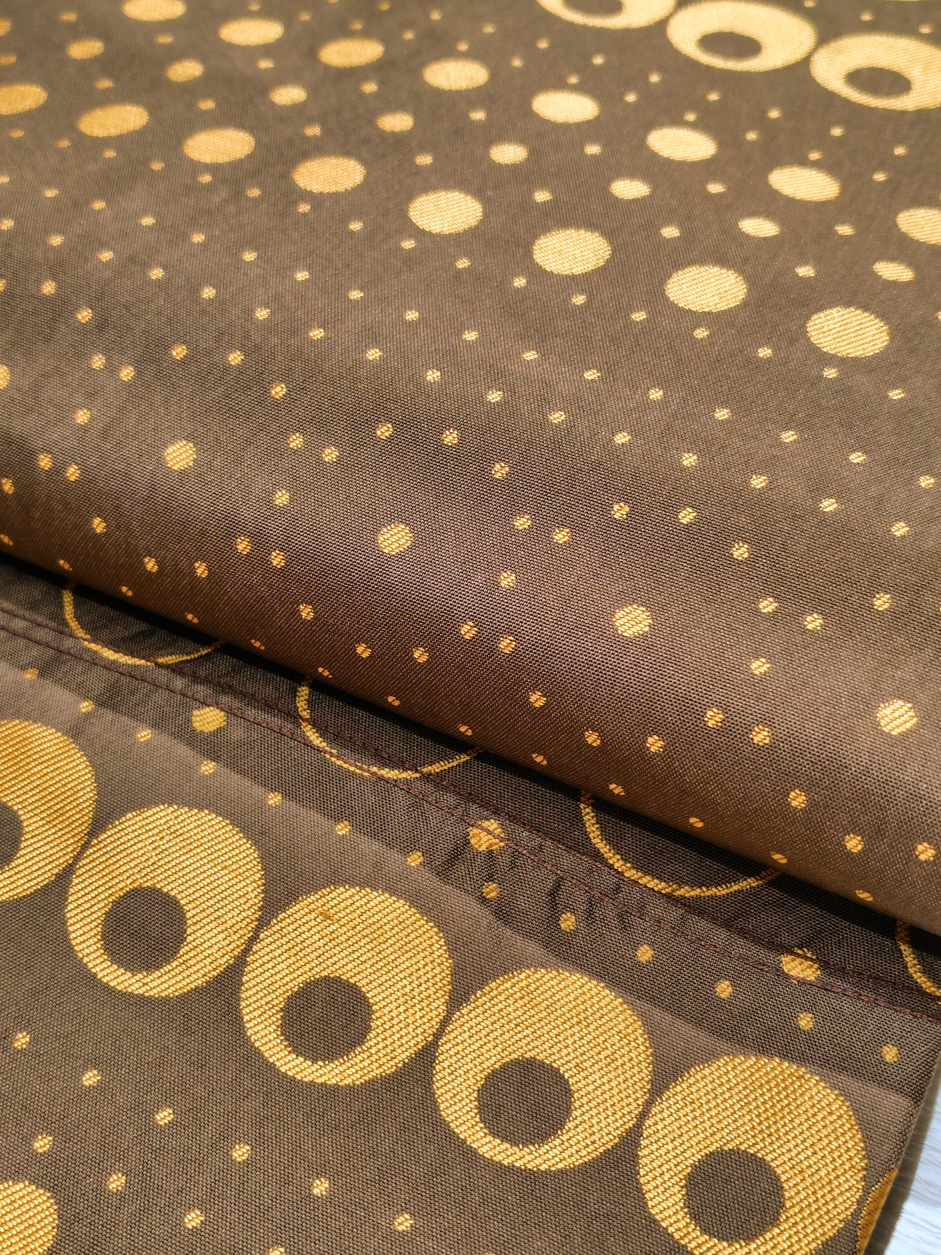 チョコレートのような淡い焦げ茶色に金茶色で大中小の様々な大きさとデザインの水玉柄。