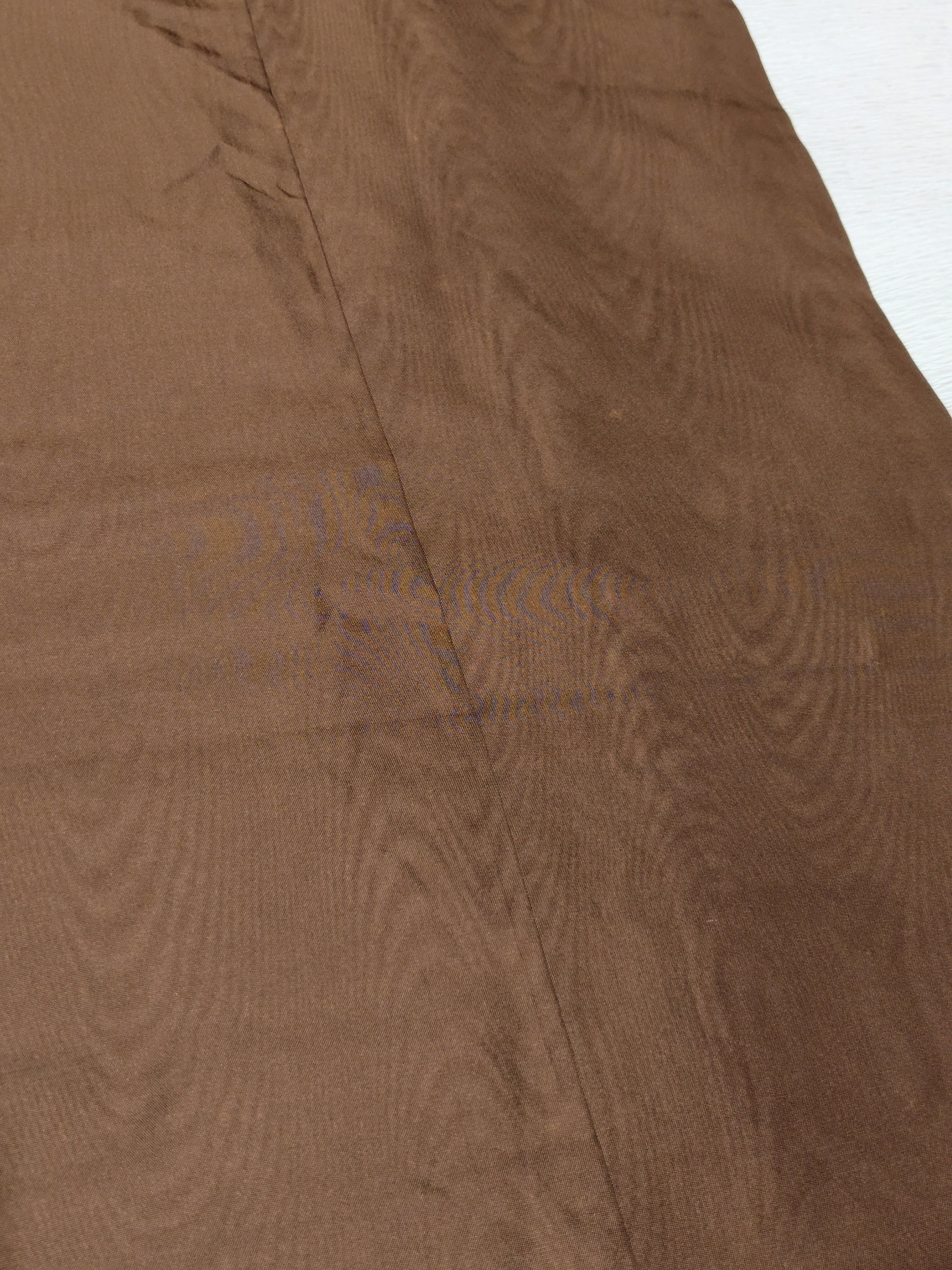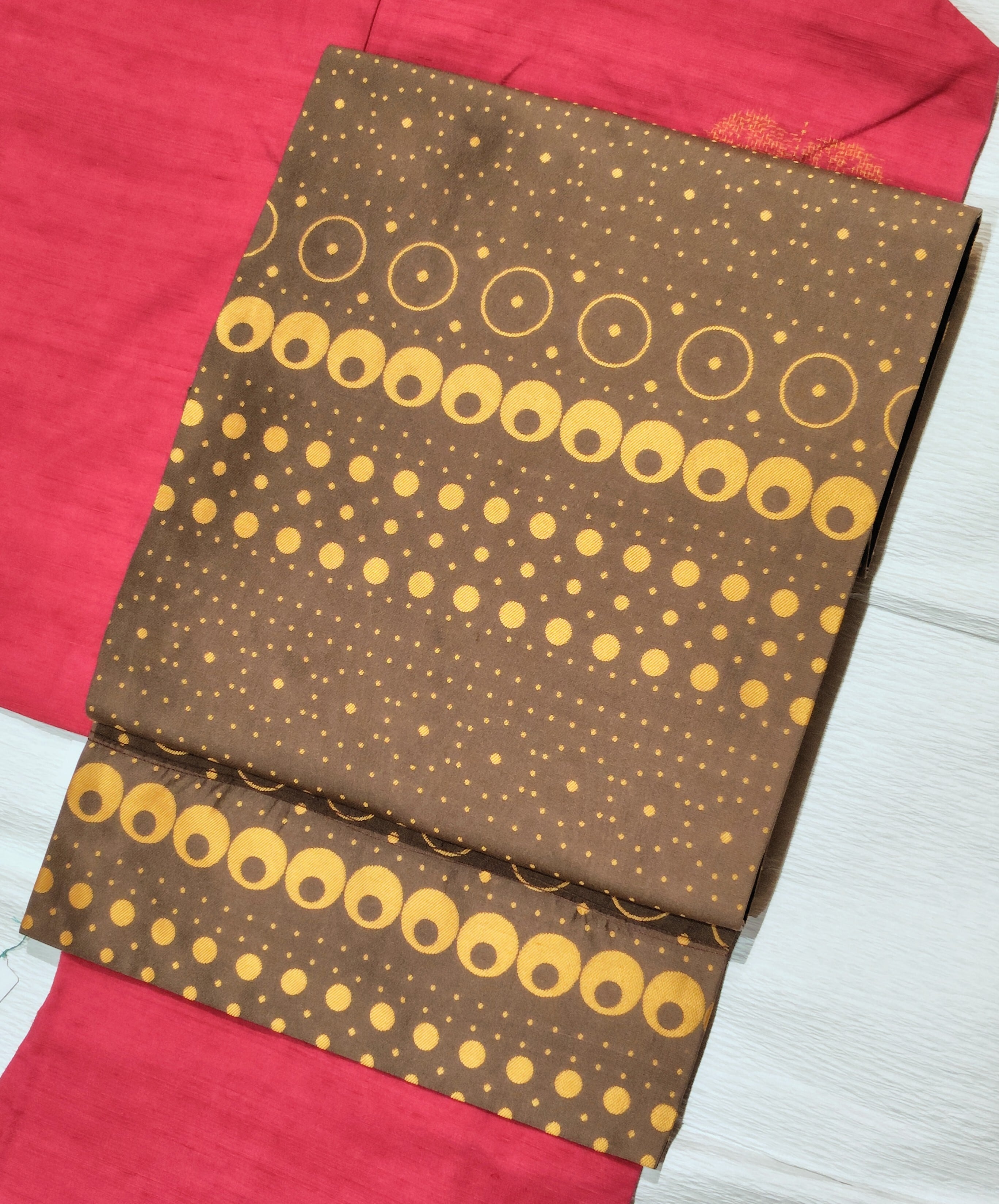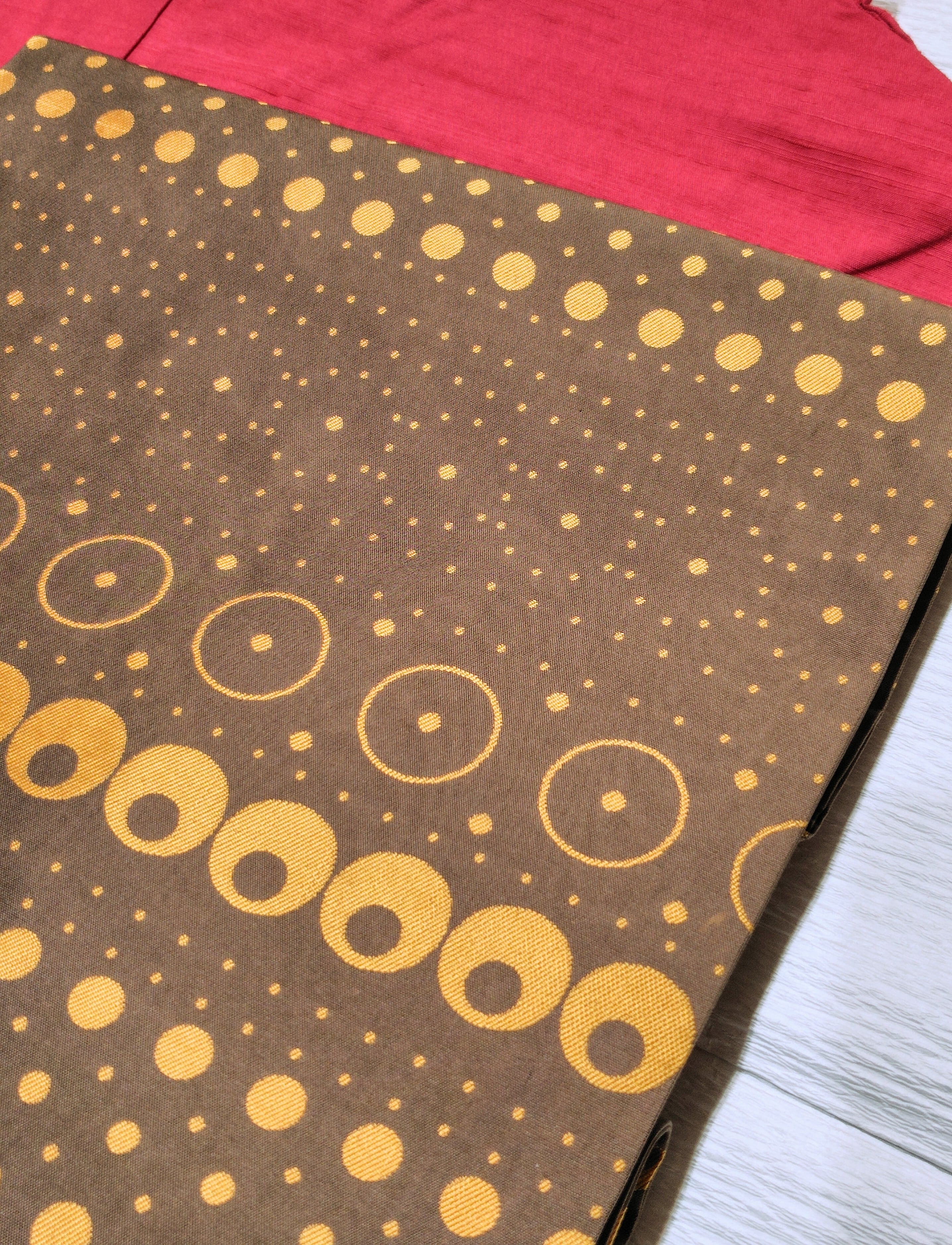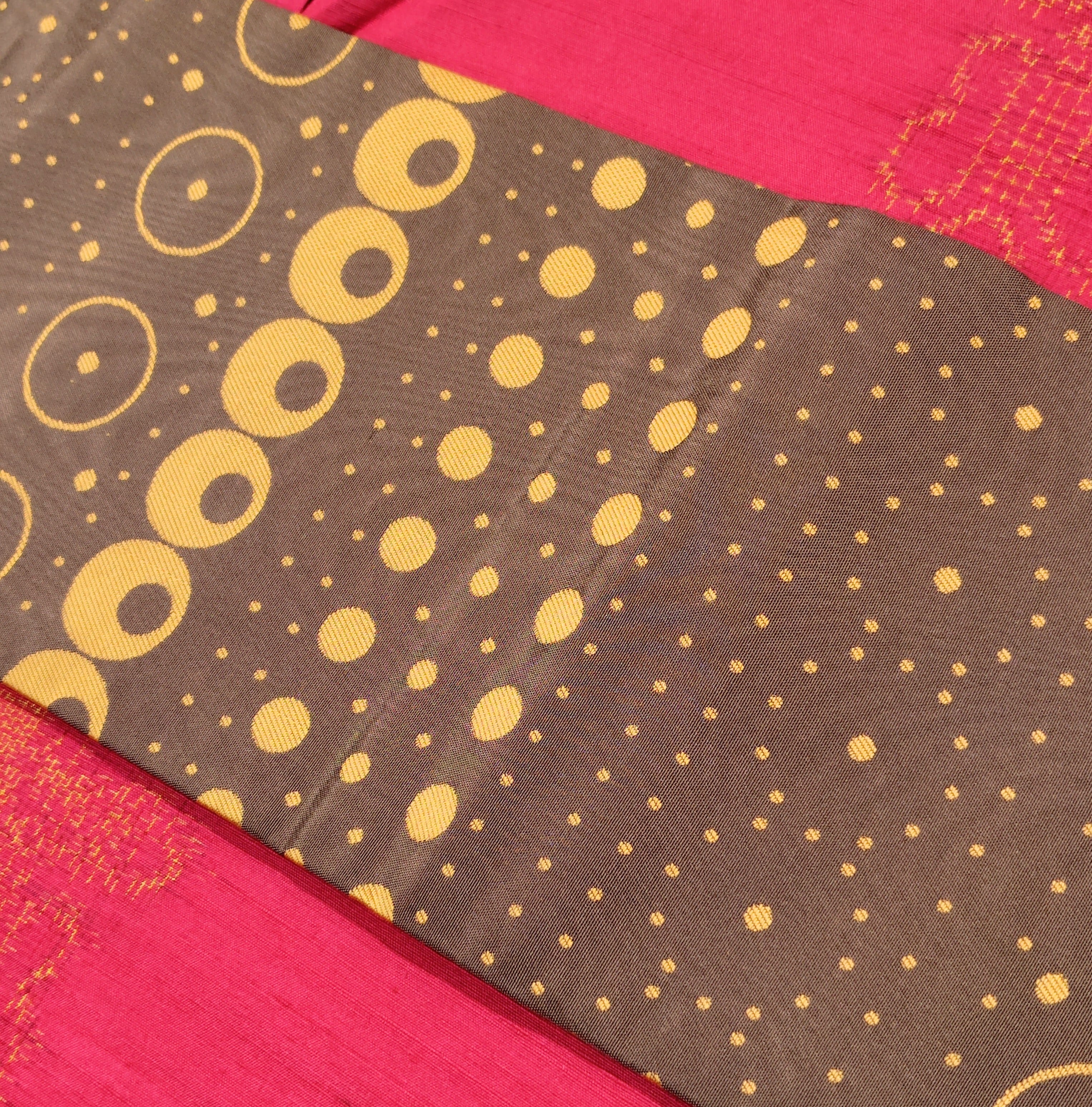 チョコレートのような淡い焦げ茶色に金茶色で大中小の様々な大きさとデザインの水玉柄。
