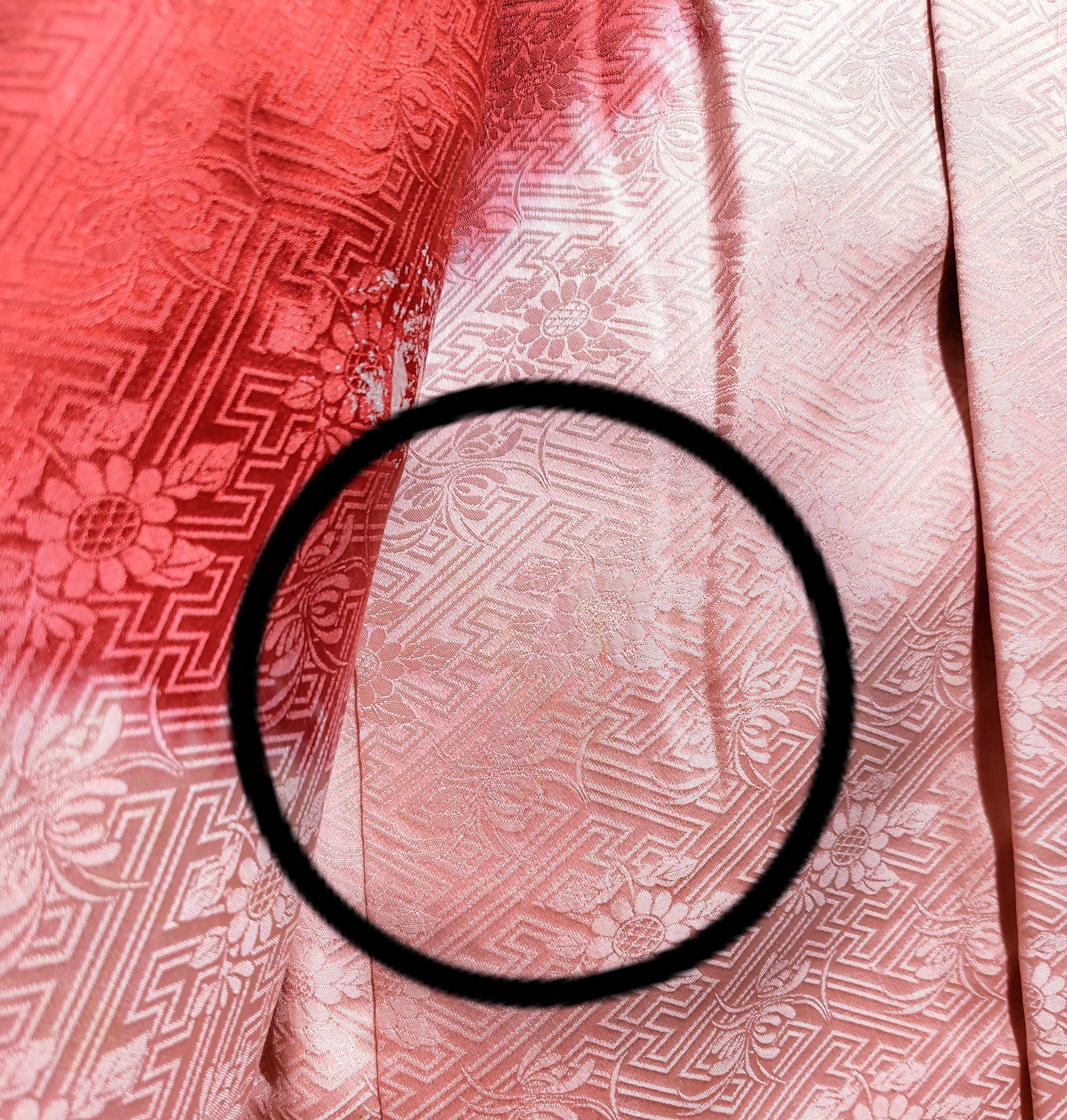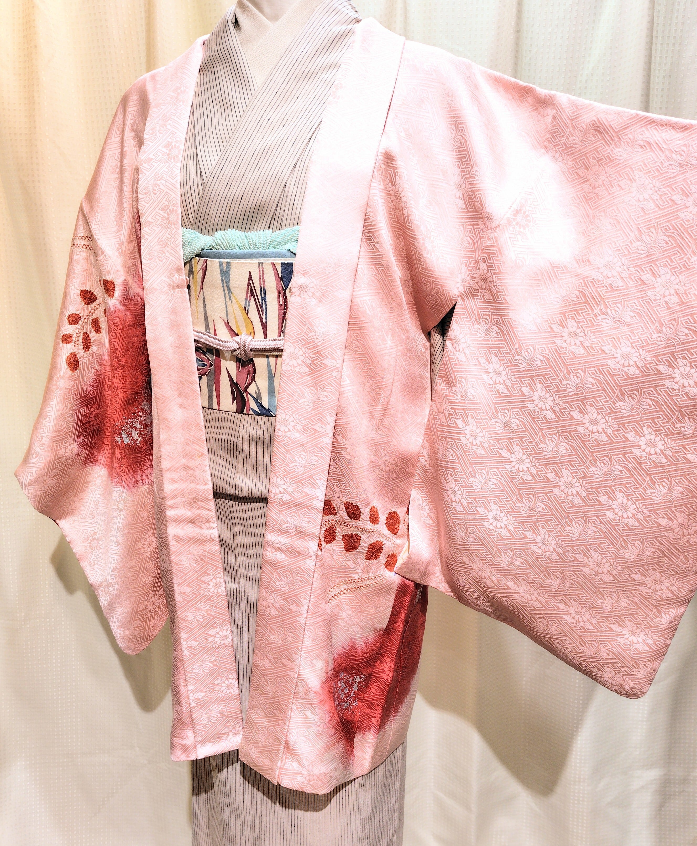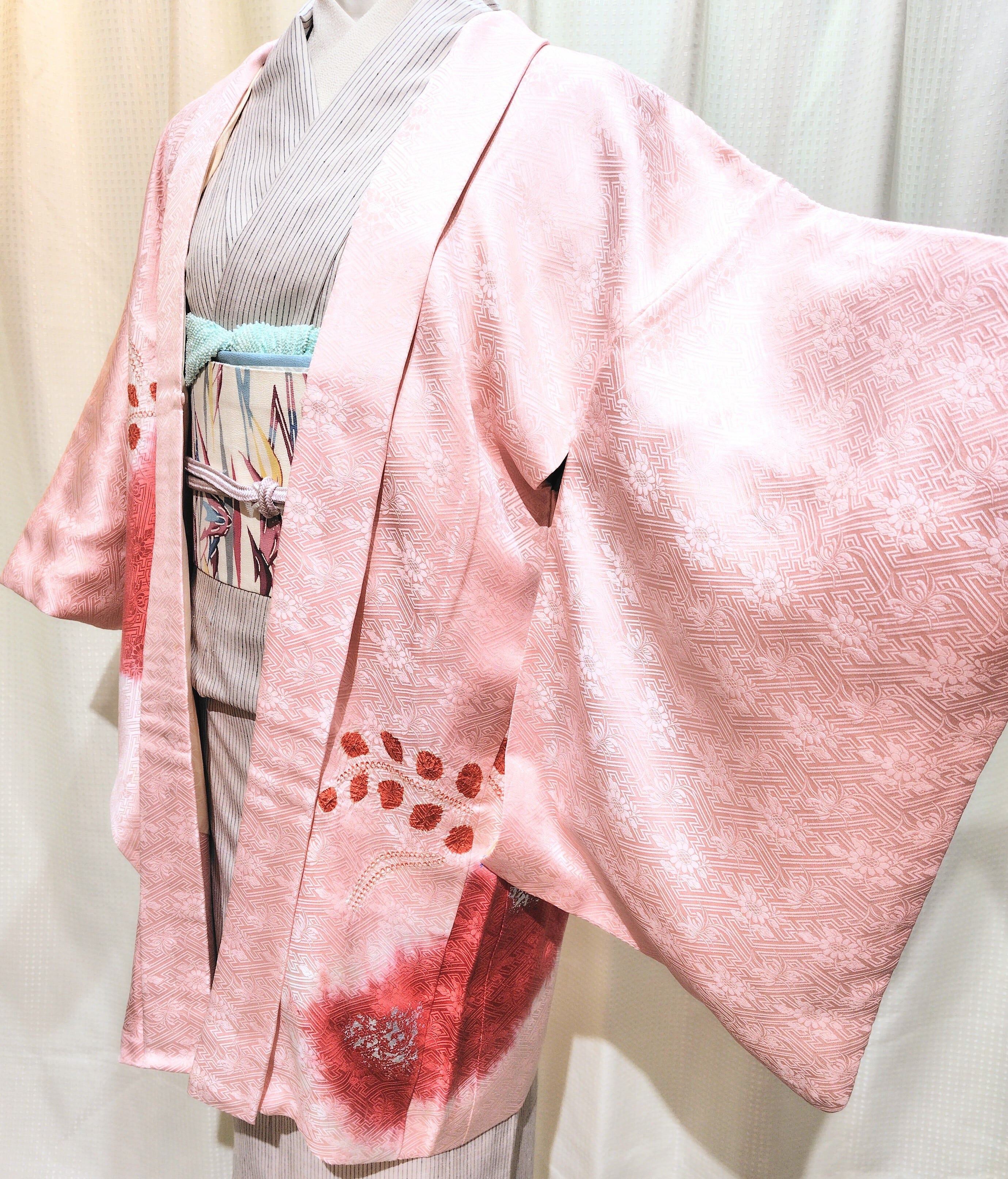 紗綾形にお花柄の地紋入りの綸子地に、イチゴミルクのような淡いピンク色・瑞々しい赤色が可愛い長羽織です。