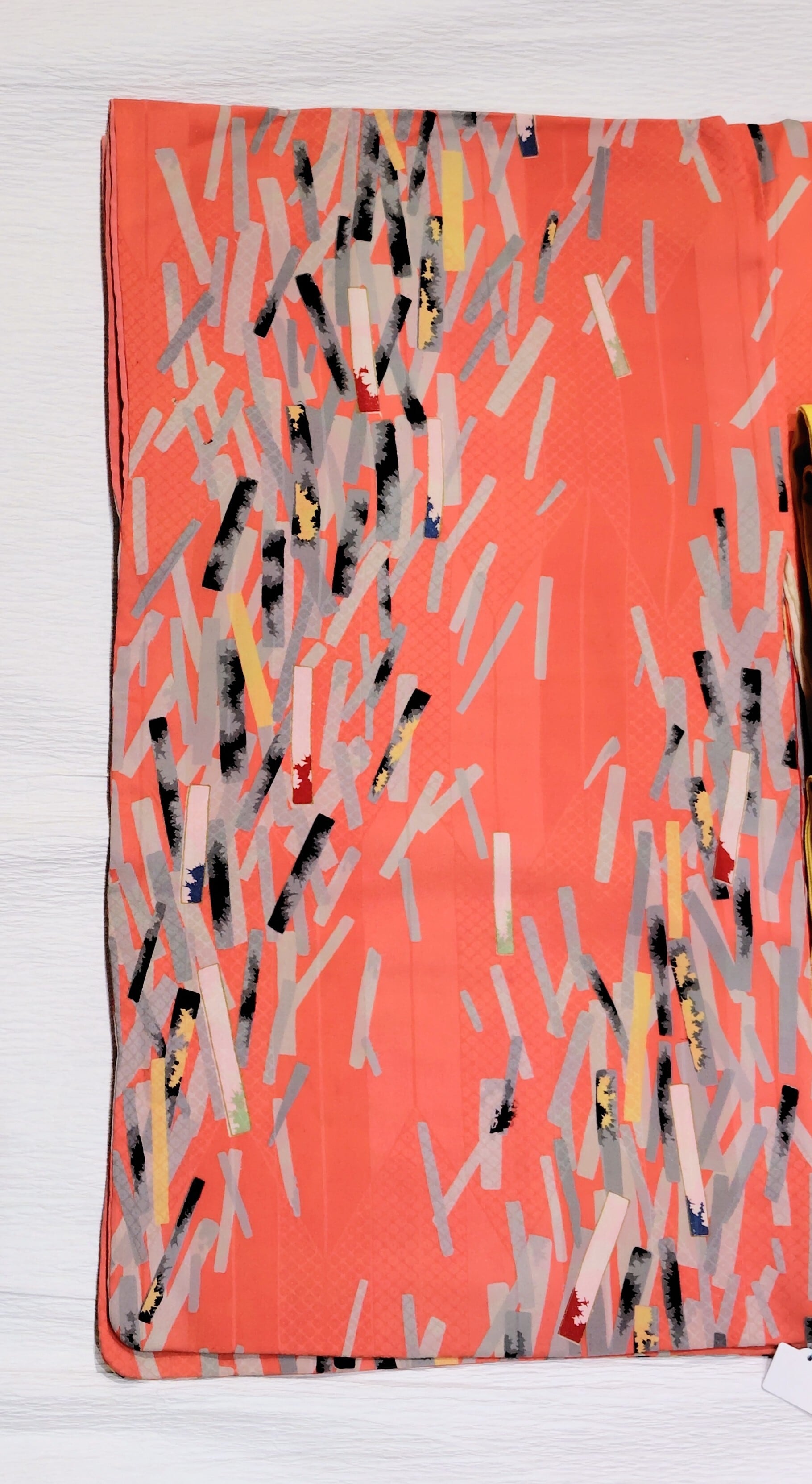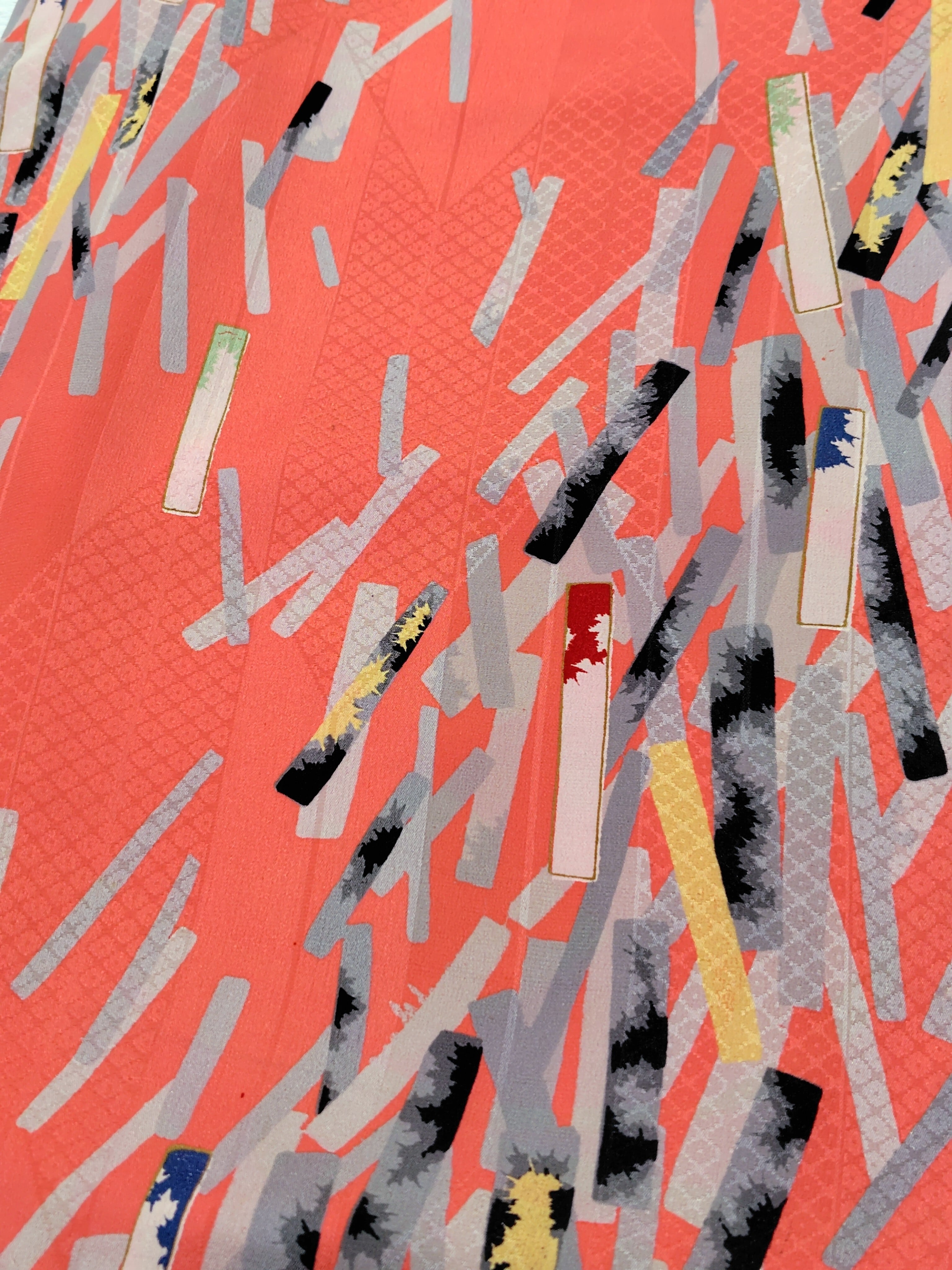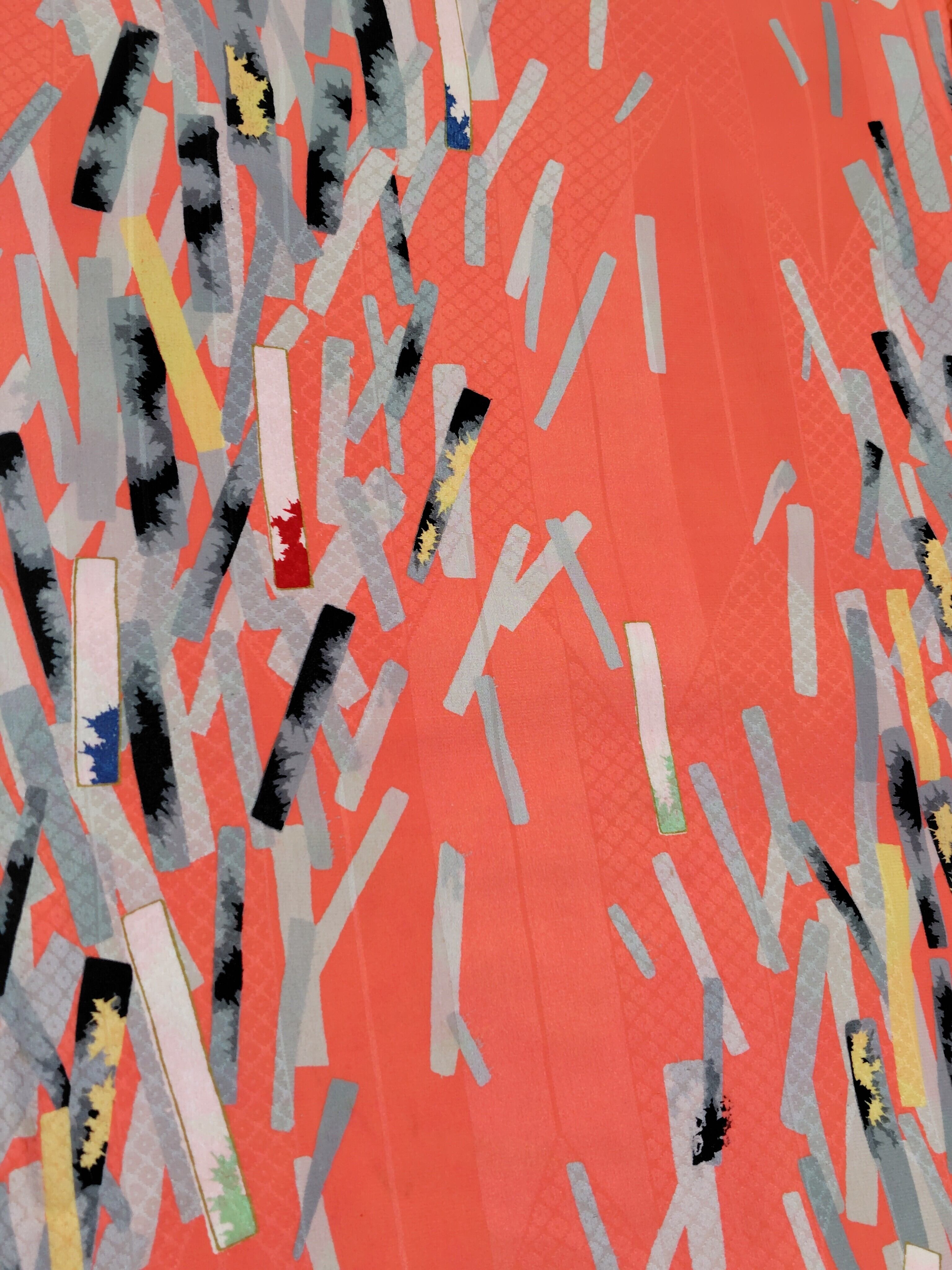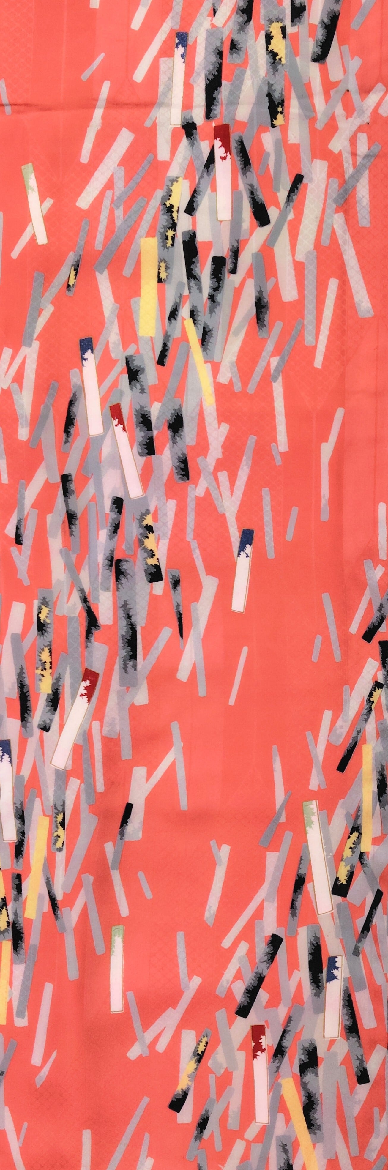 サーモンピンク色に近い華やかなピンク色の地に、白色、グレー色濃淡の短冊柄。