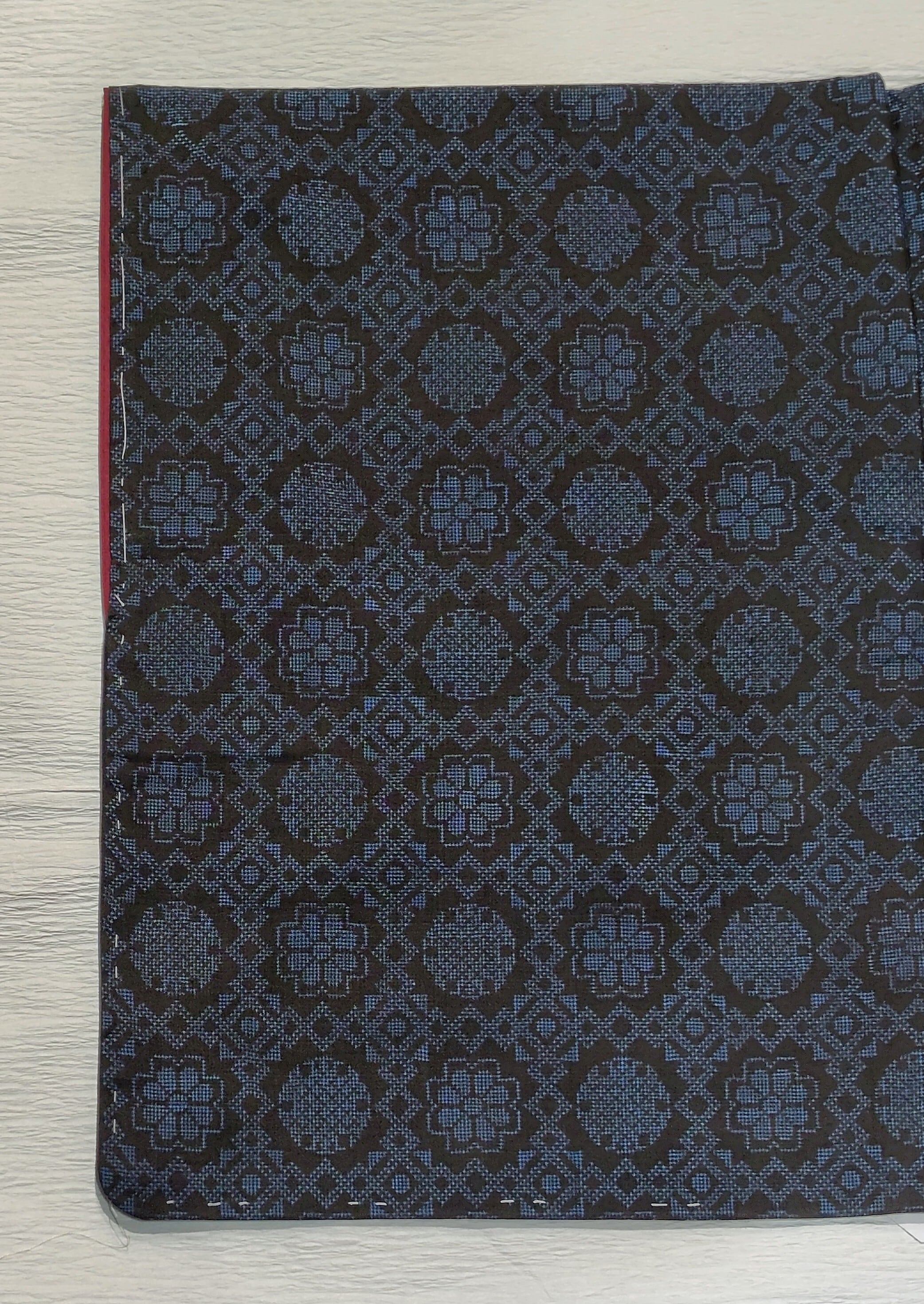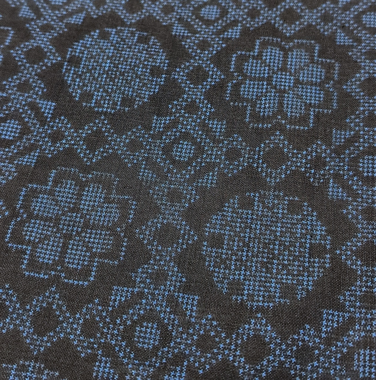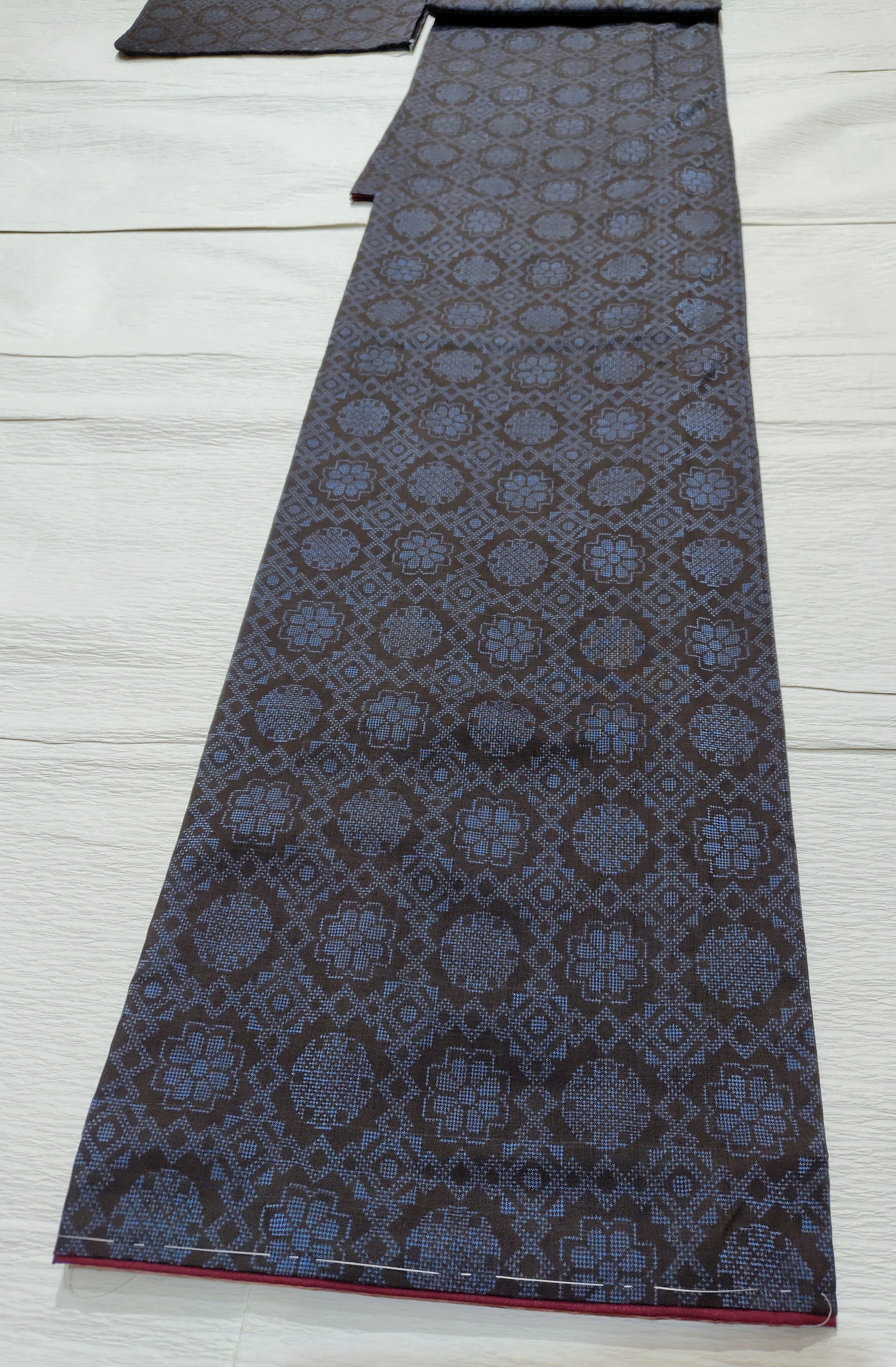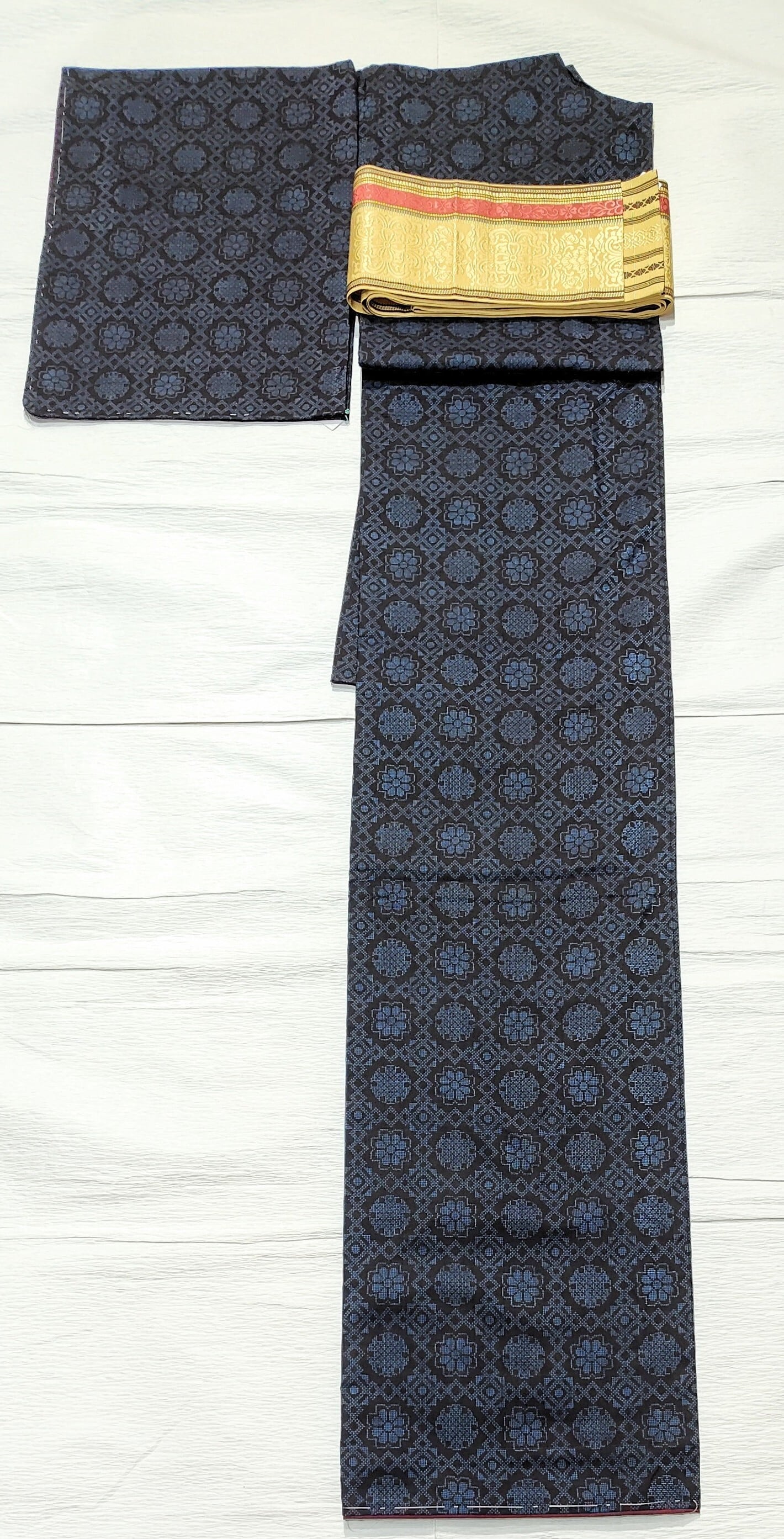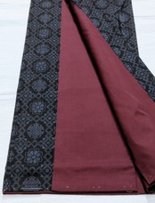 黒地に青色の組み合わせ、菱形、花、雪輪柄。