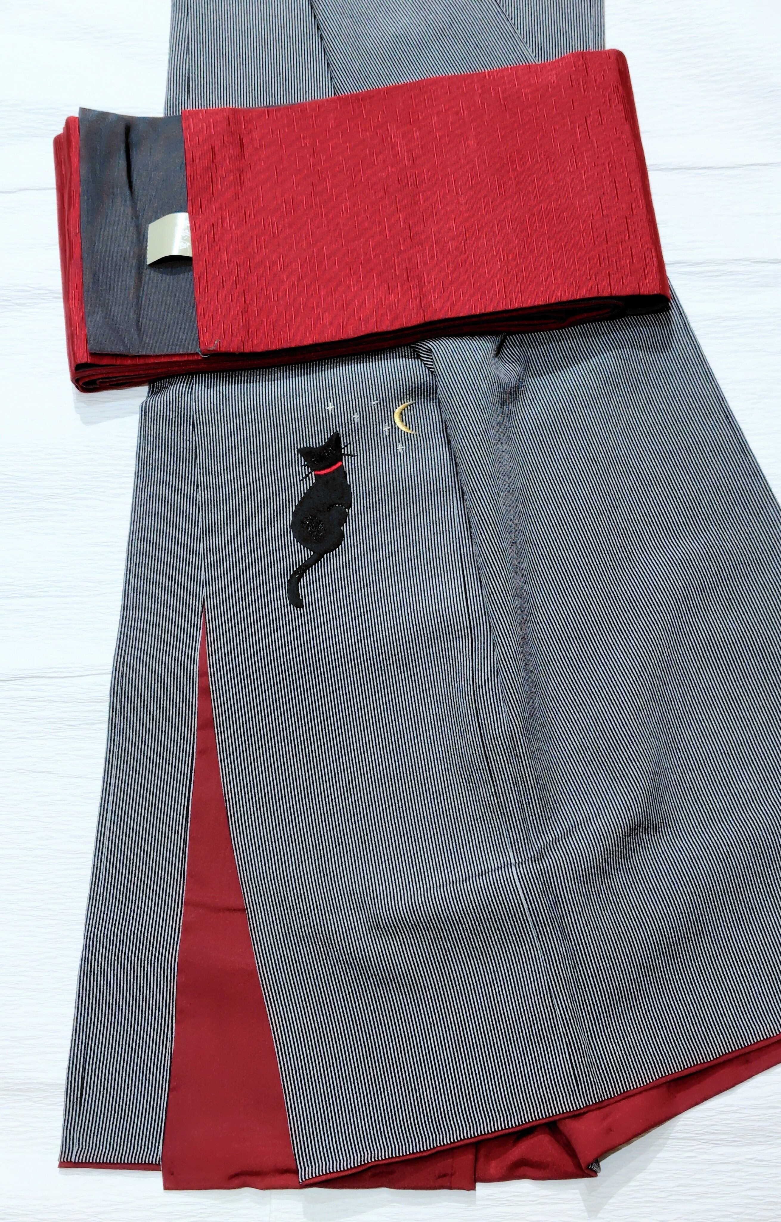 撫松庵 シンプルな半幅帯 臙脂✕グレーです。