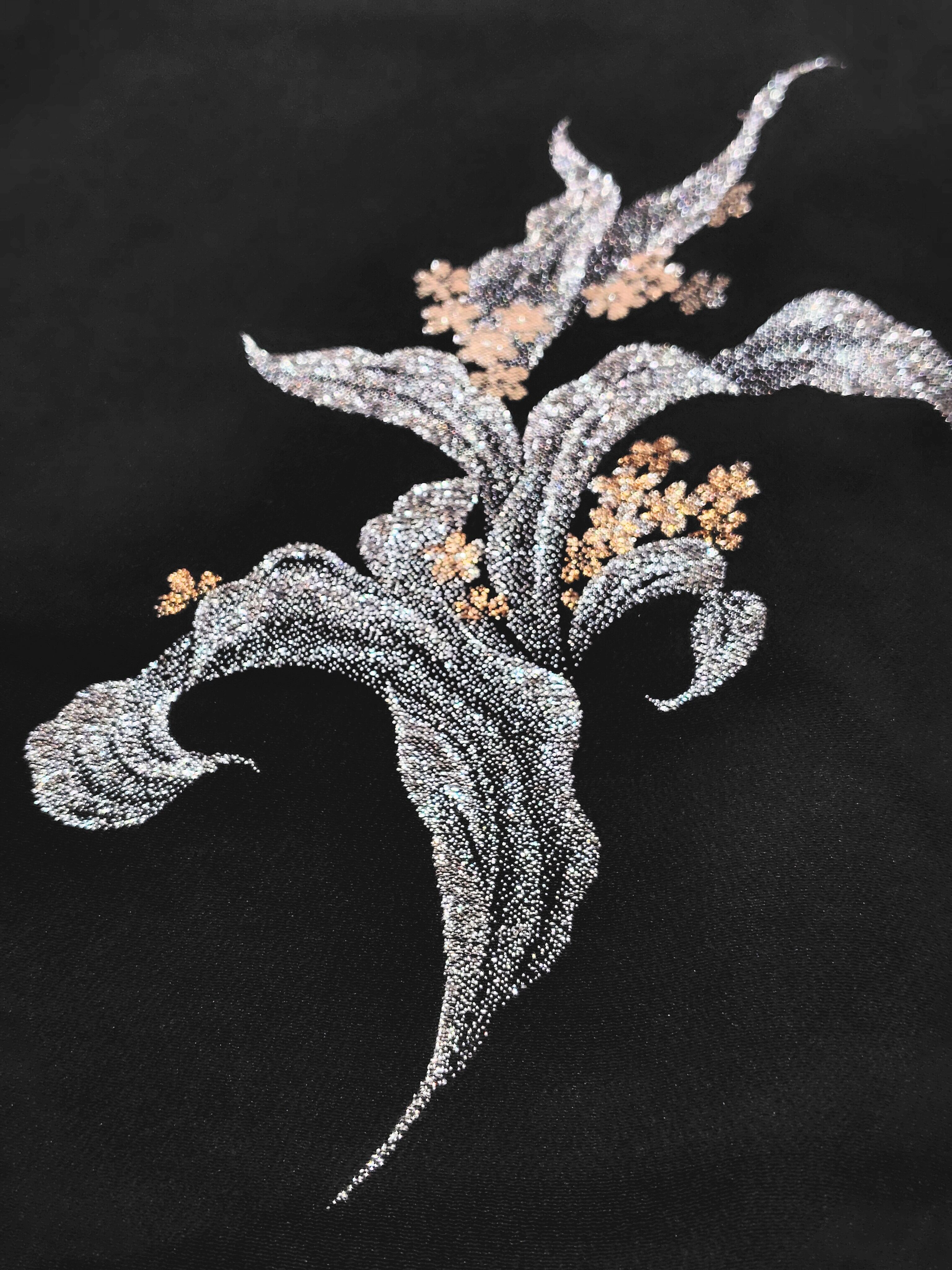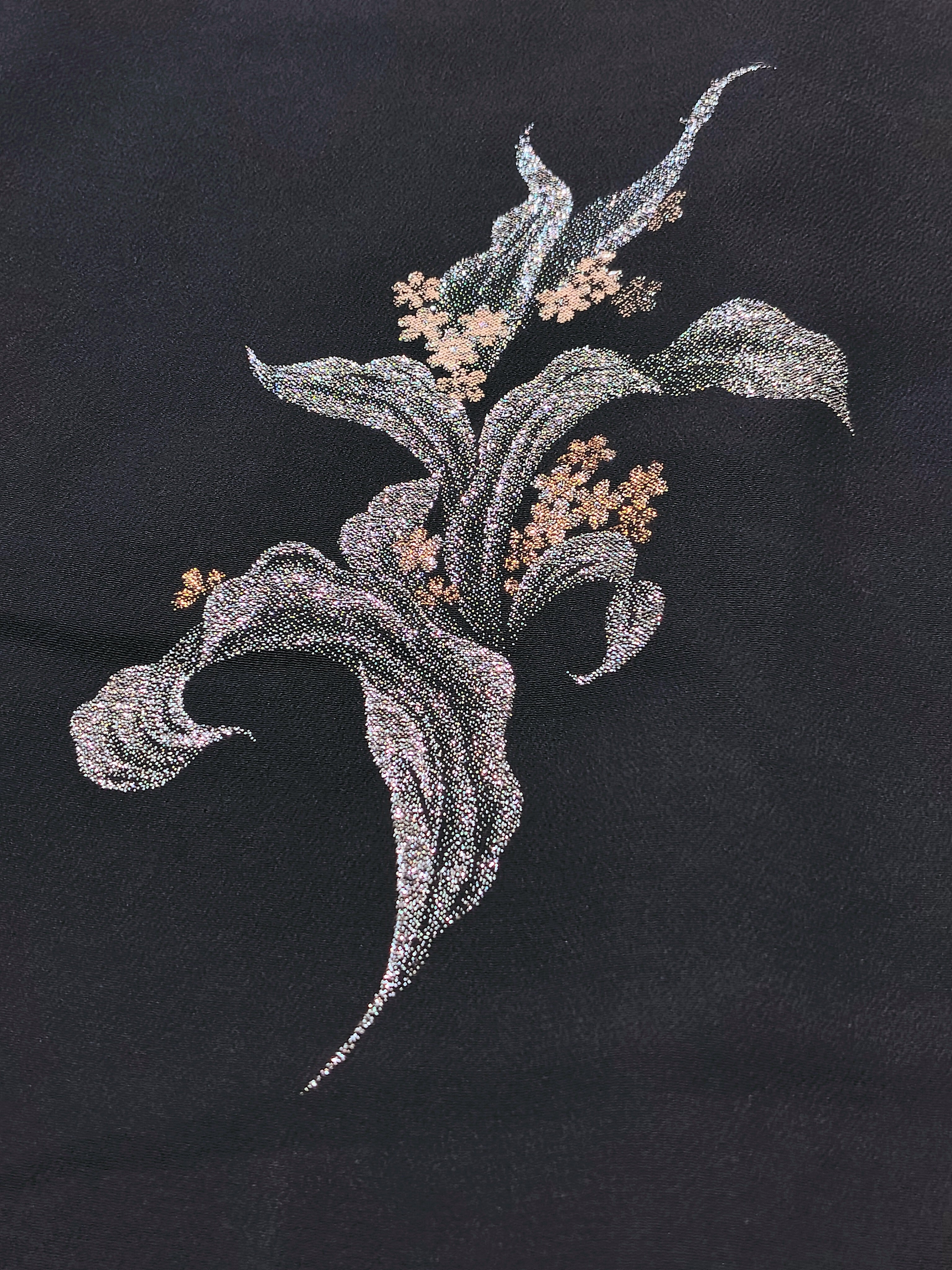こちらも黒地に銀色とピンク色とオレンジ色のきらきら輝く糸のみ。