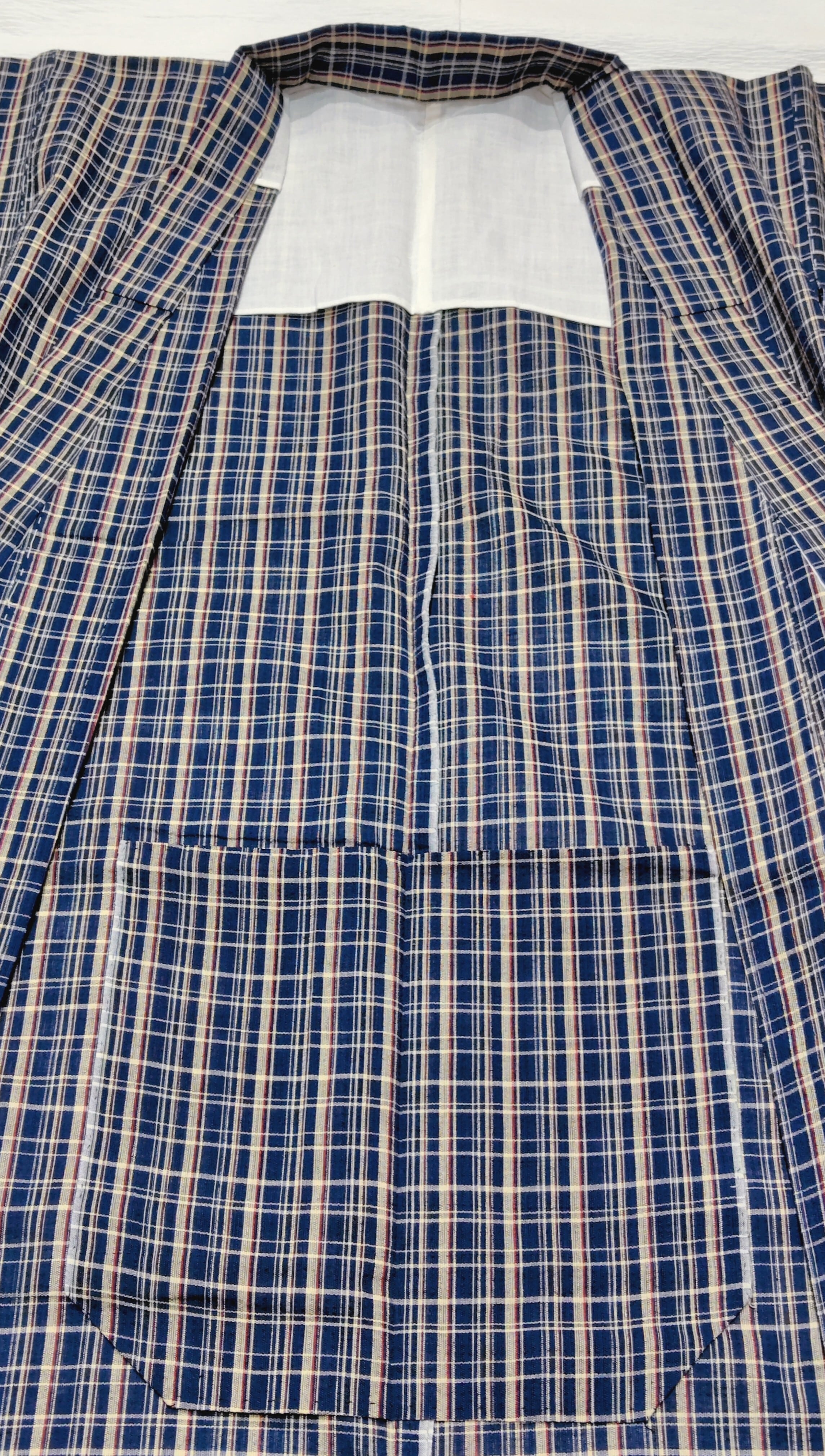 明るい紺色の地に赤色とクリーム色の格子柄(チェック柄)が、シンプルな大人可愛い雰囲気です。