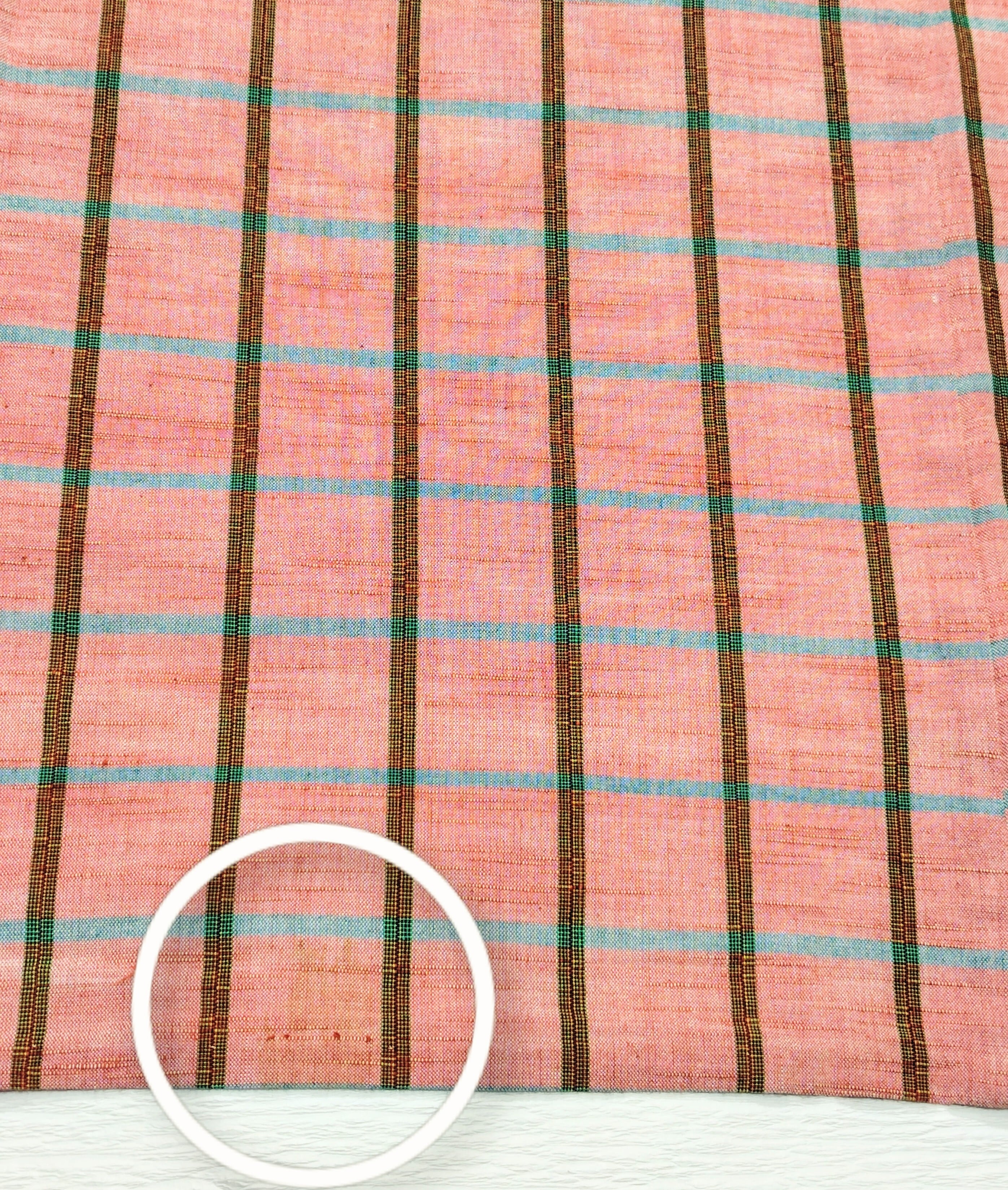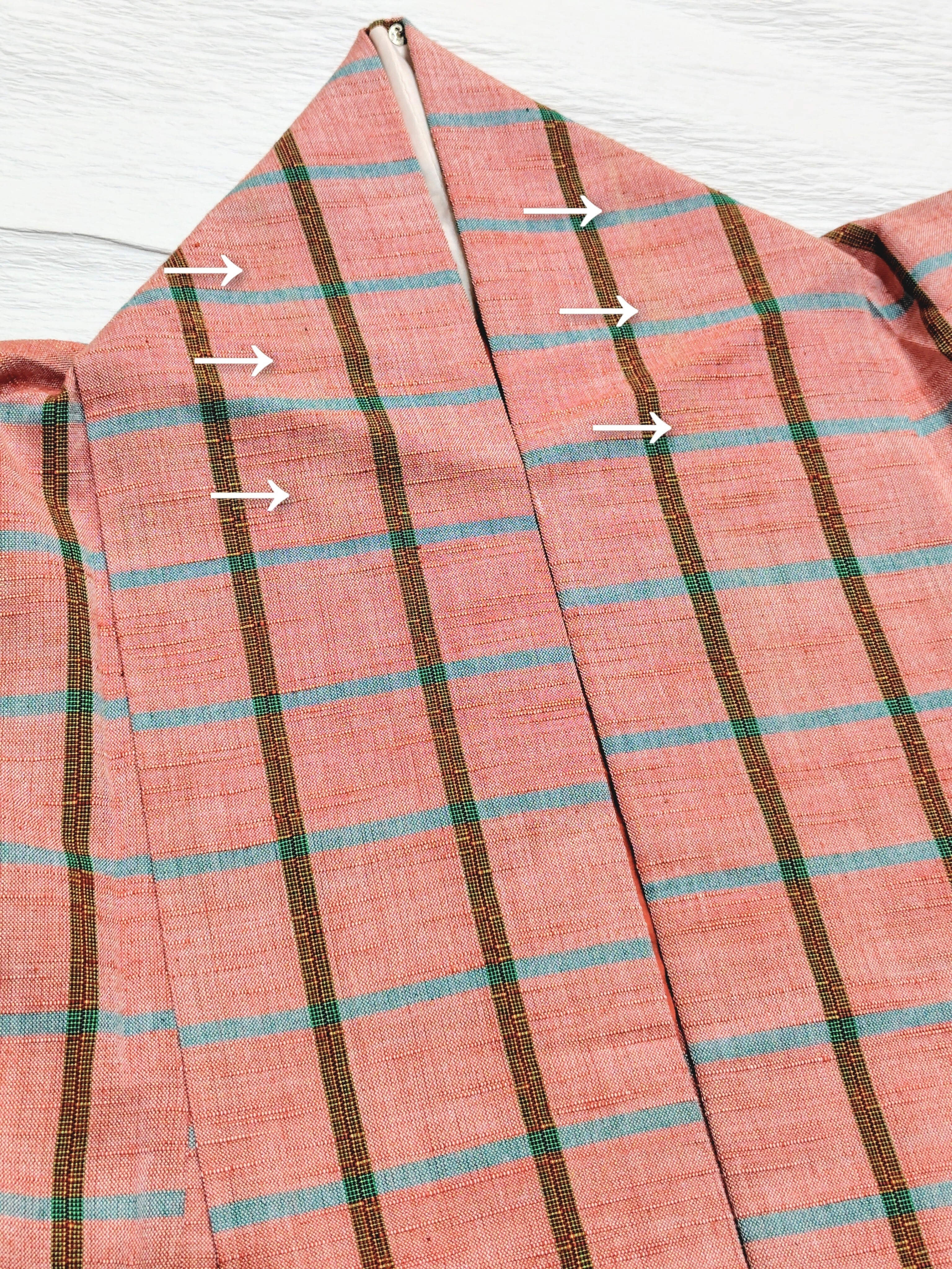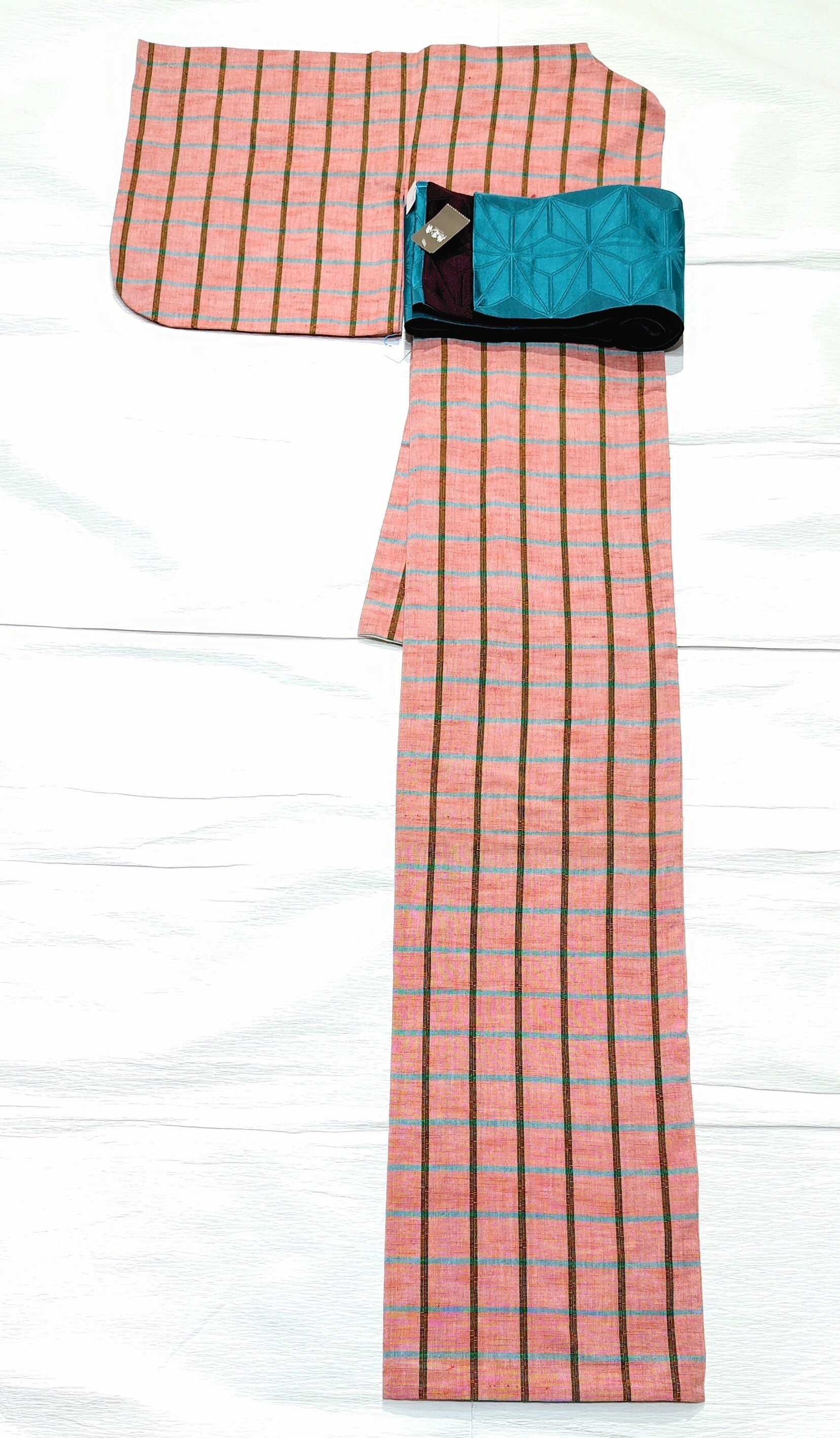 綿紬の単衣 チェック柄にターコイズの差し色です。