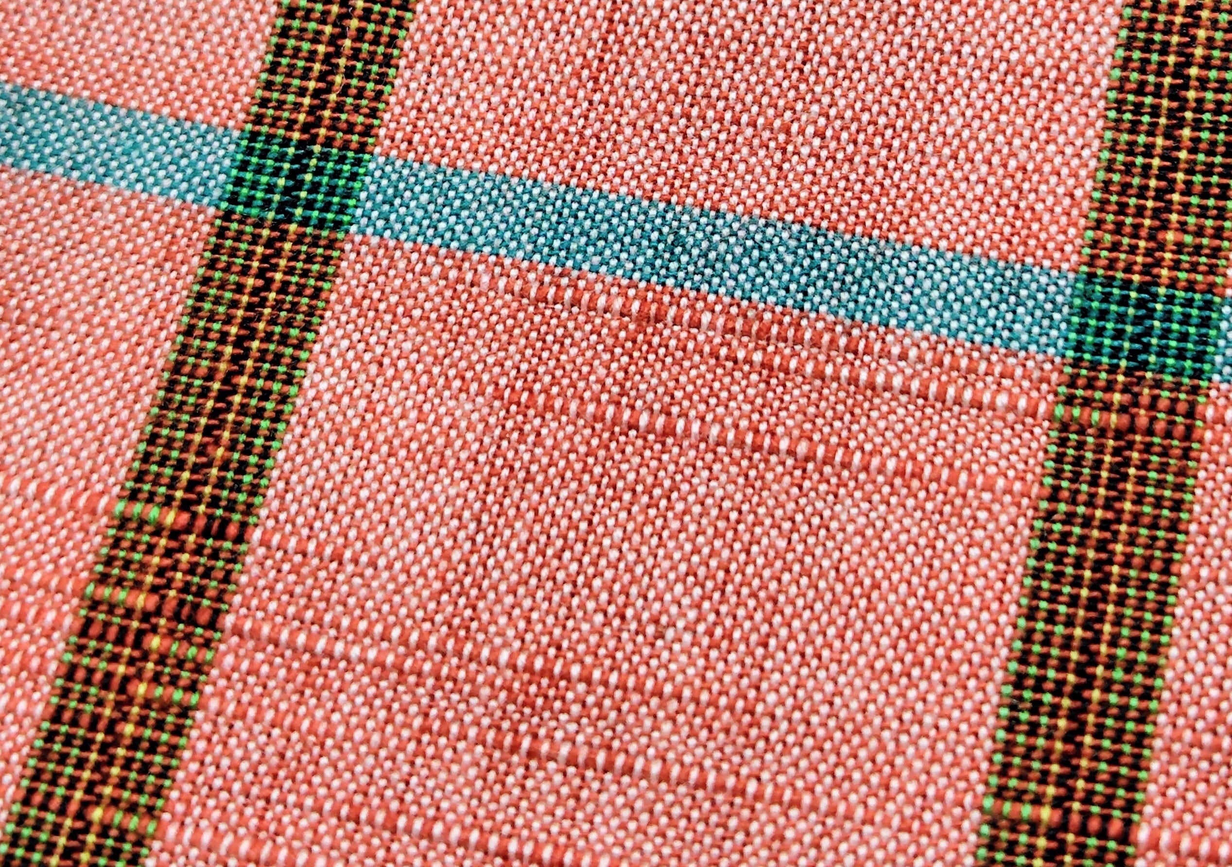 苺の果汁のような薄い赤色地に深い緑色と黒色のストライプ(縞)にターコイズ色が横に入ることでチェック(格子)柄になっています。