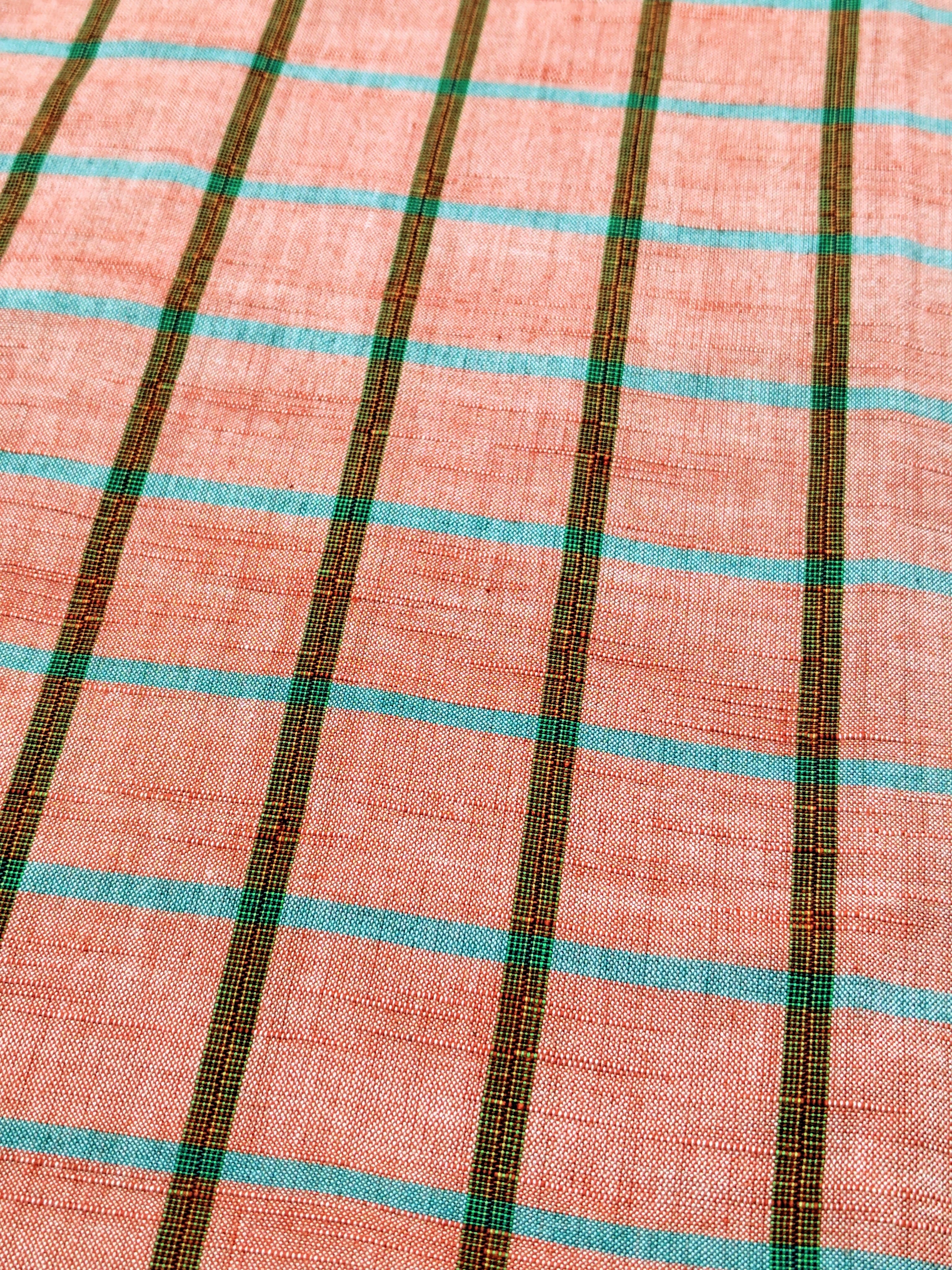 綿紬の単衣 チェック柄に青緑の差し色