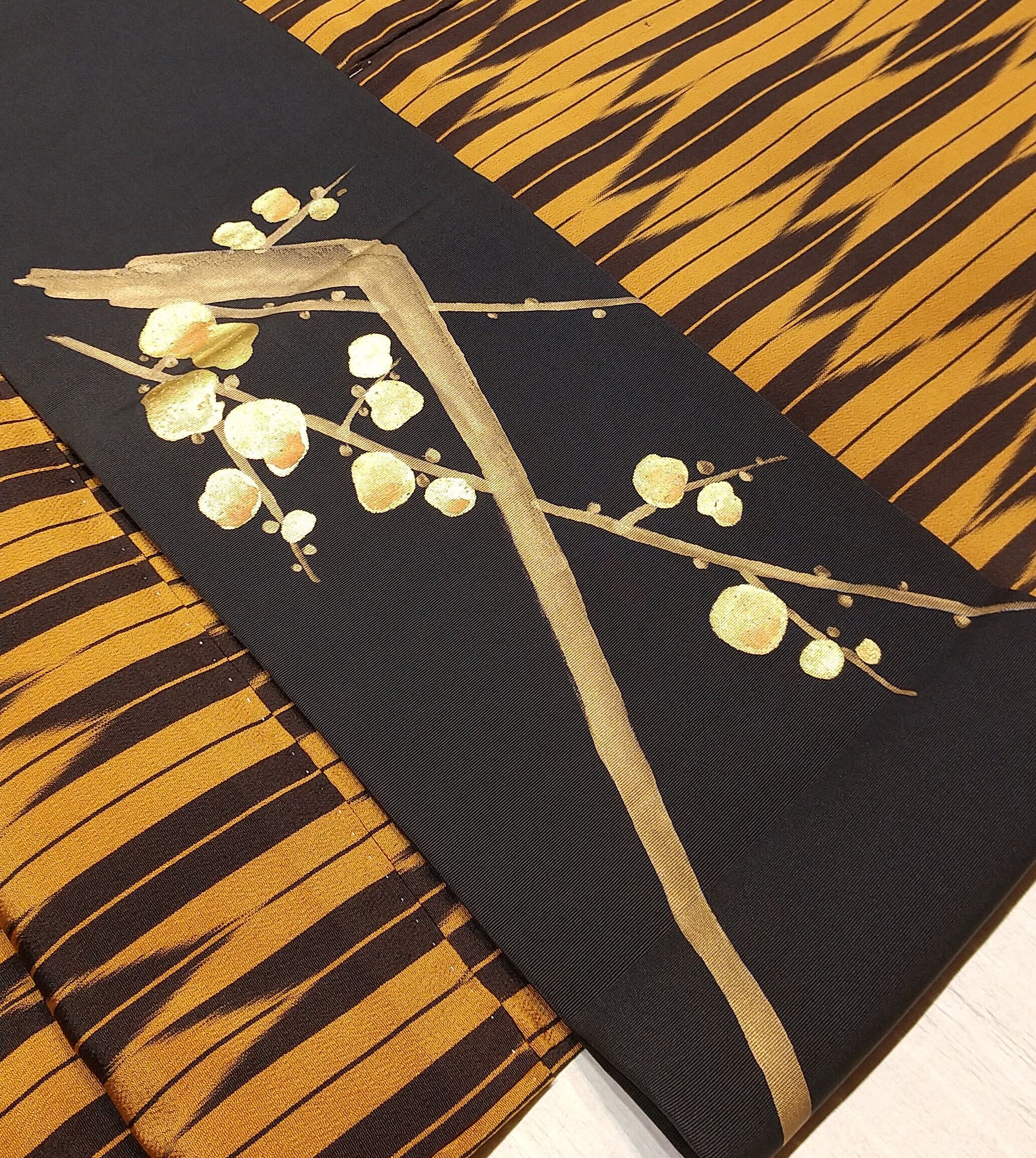 黒地に金の絵の具で描かれた梅の花柄の名古屋帯です。