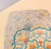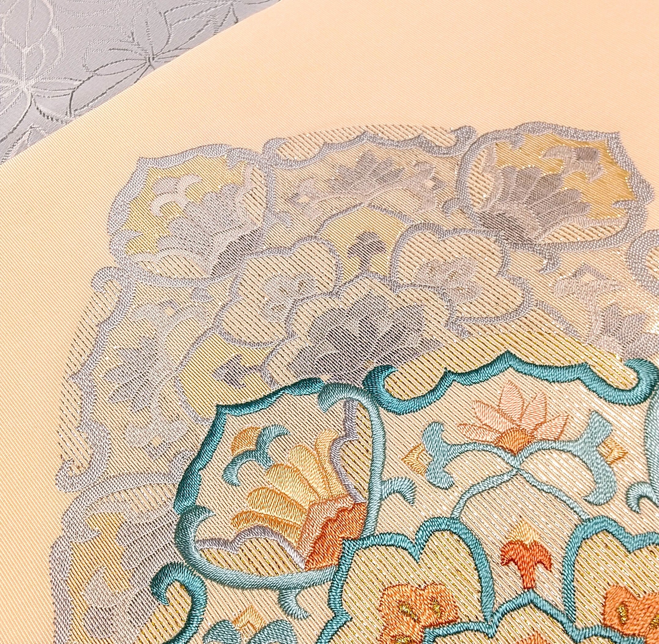 ファンデーションのような綺麗な肌色(ペールオレンジ系)のお色にオレンジ、オレンジよりの茶色やグレー、金銀糸、エメラルドグリーンのお色の刺繍が美しい名古屋帯です。