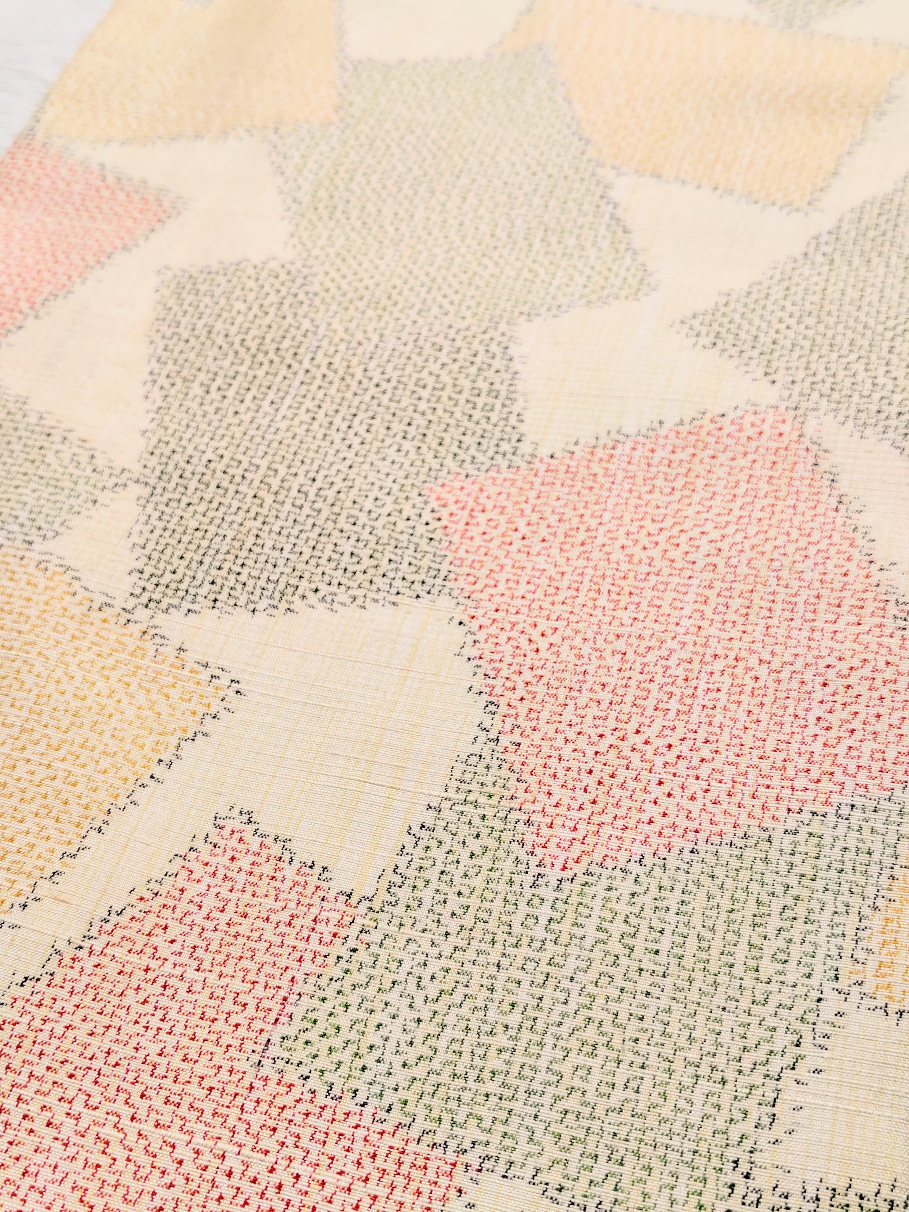 アイボリーに近い白地に黄色、緑色、赤色の色紙柄が可愛い紬の単衣です。