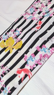 白地に黒色の縞(ストライプ)がとてもシックな雰囲気で、そこに綺麗な黄緑色の菖蒲、紫色と水色と灰色の紫陽花、百合、撫子、クレマチスなど今の時期~秋までの美しい花々が幻想的に浮かんでいます。