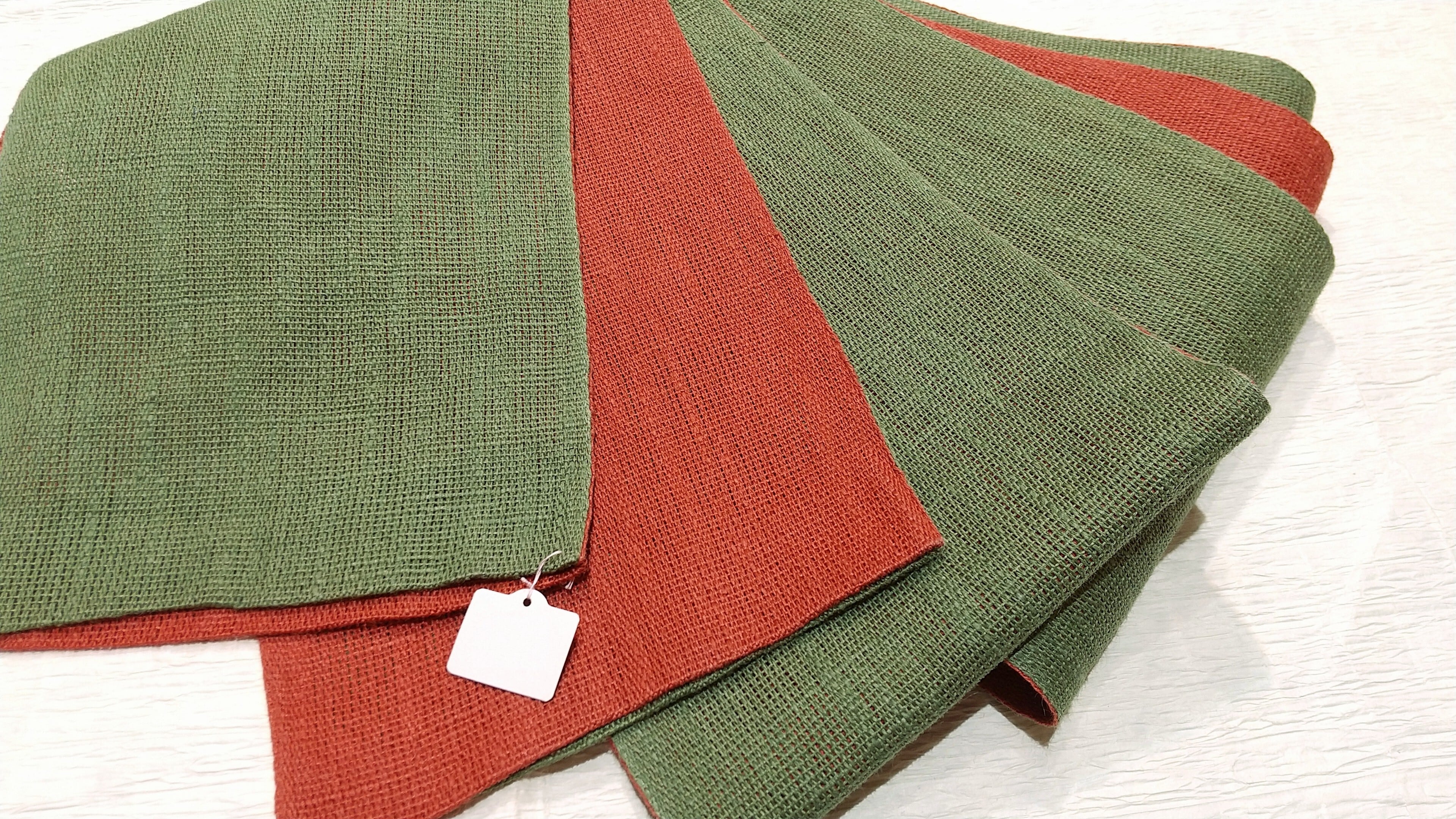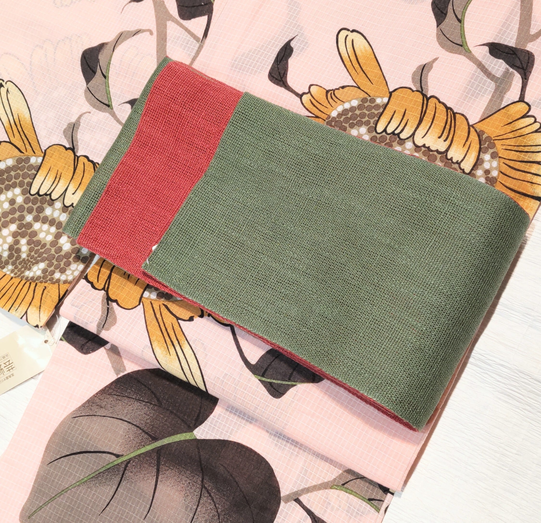 麻の半幅帯 緑色と赤色のリバーシブル