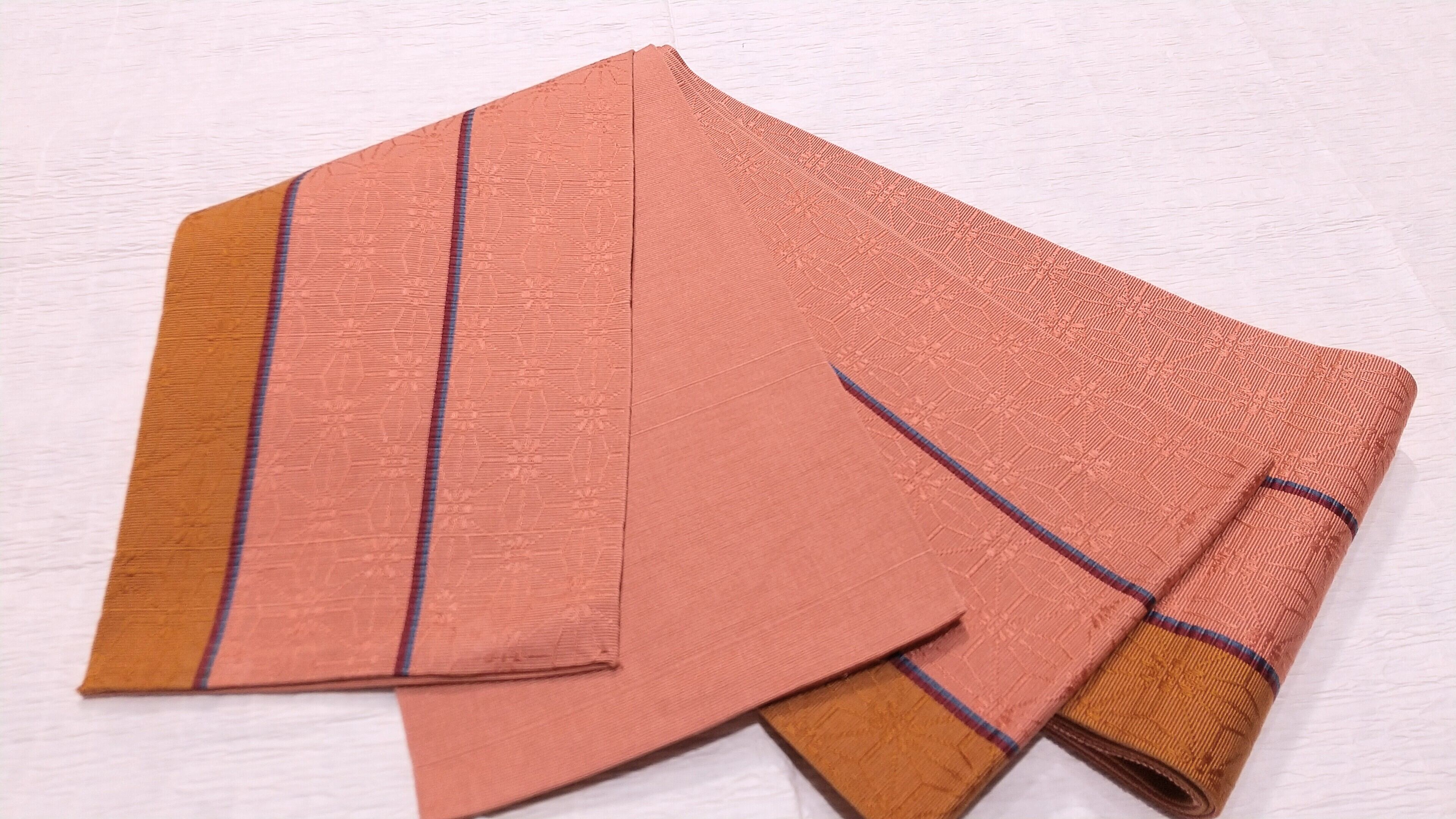 珊瑚のようなピンク色と金茶色の博多織りの半幅帯