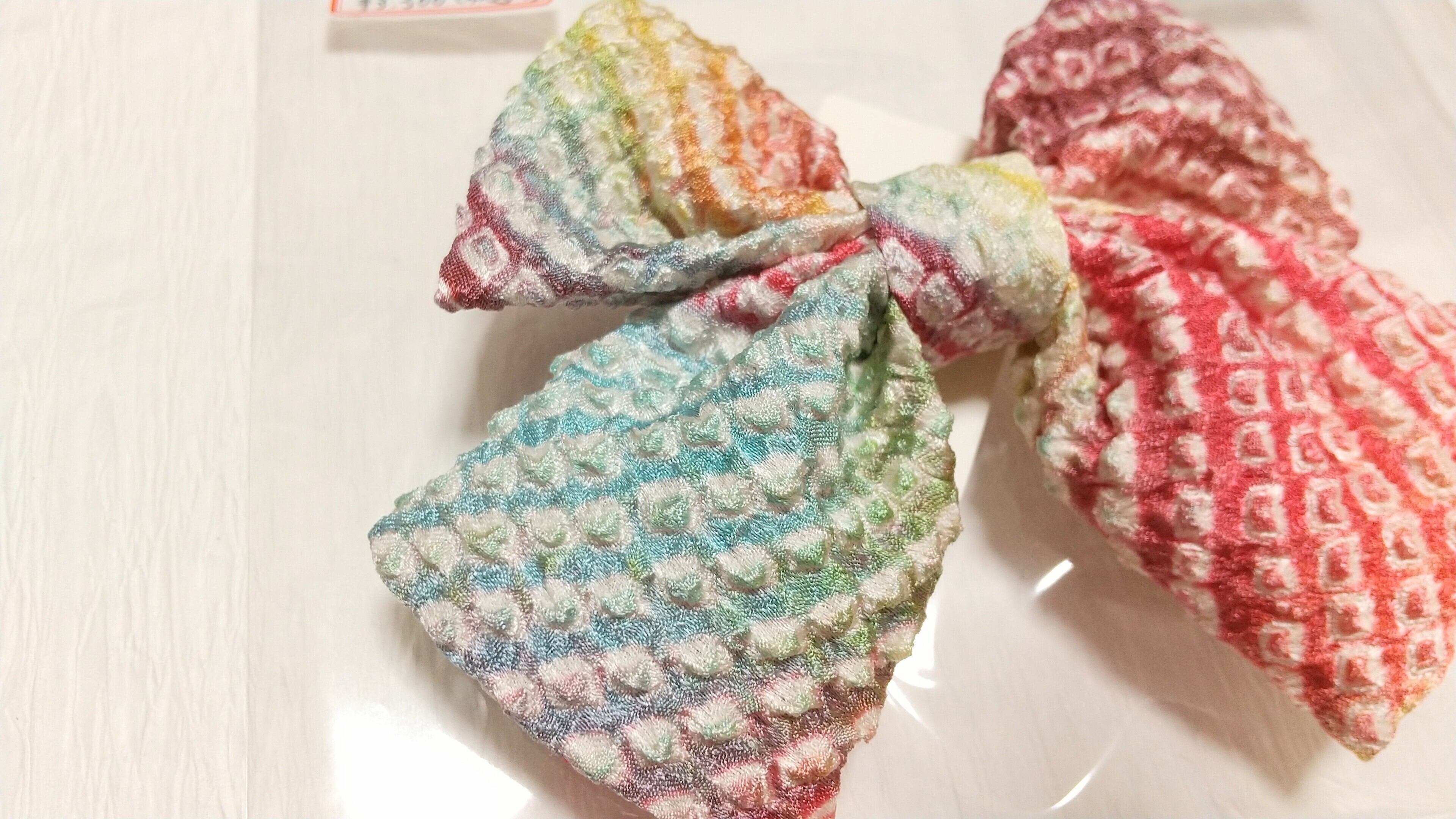 正絹のグラデーションの総絞りから作りました。 とても幻想的なグラデーションの総絞りで華やかな印象ですので、りぼんだけで普段使い~つまみ細工などと組み合わせて七五三や振袖などにも良さそうです。