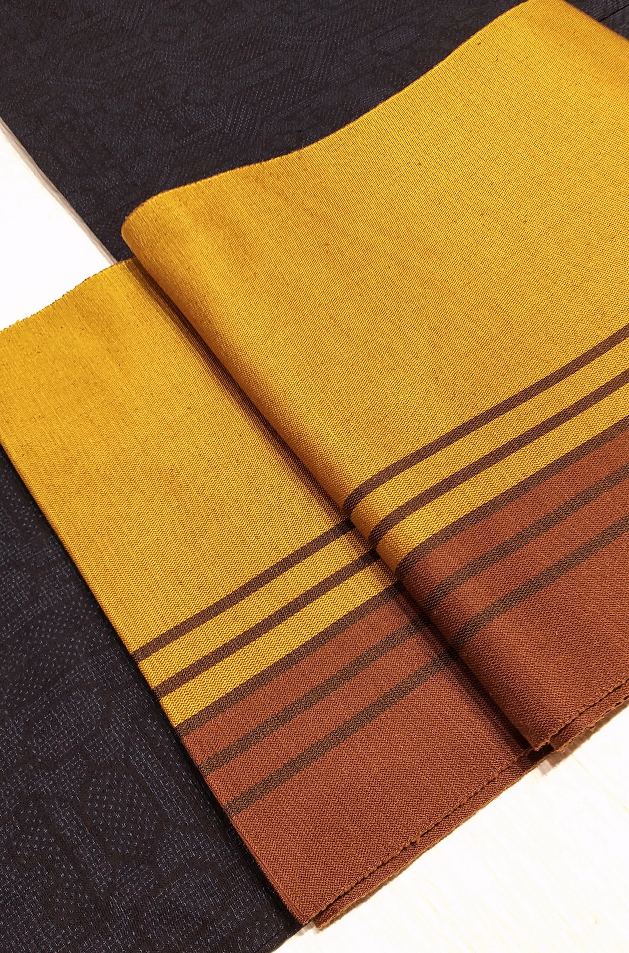 上品な発色の黄金色と鳶色と黒色の組み合わせがシックで味わい深い本場黄八丈、憧れの方も多いのではないでしょうか。