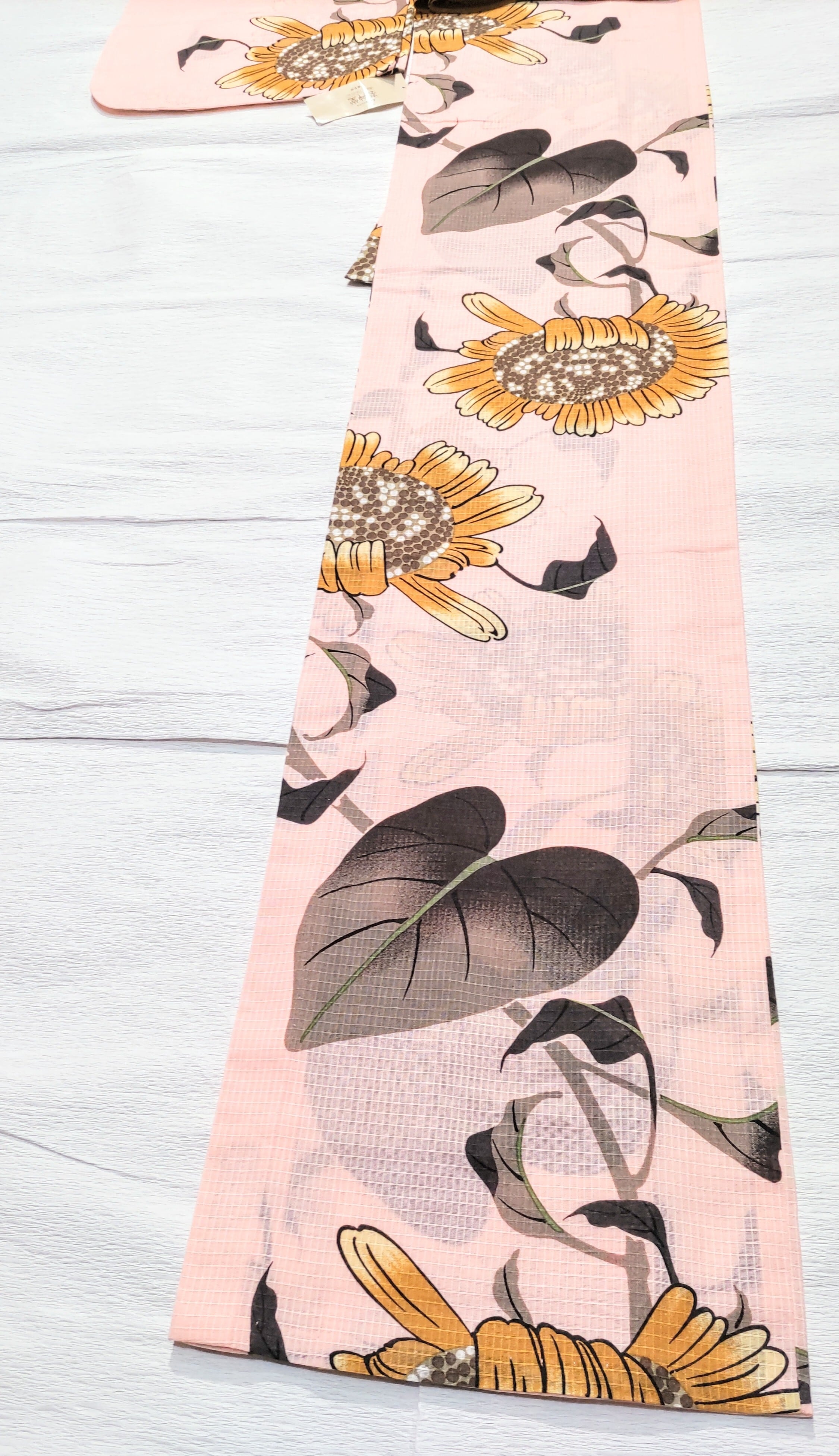 上品で優しい淡いピンク色に落ち着いた色合いの向日葵とグレーの葉が美しい素敵な浴衣です。