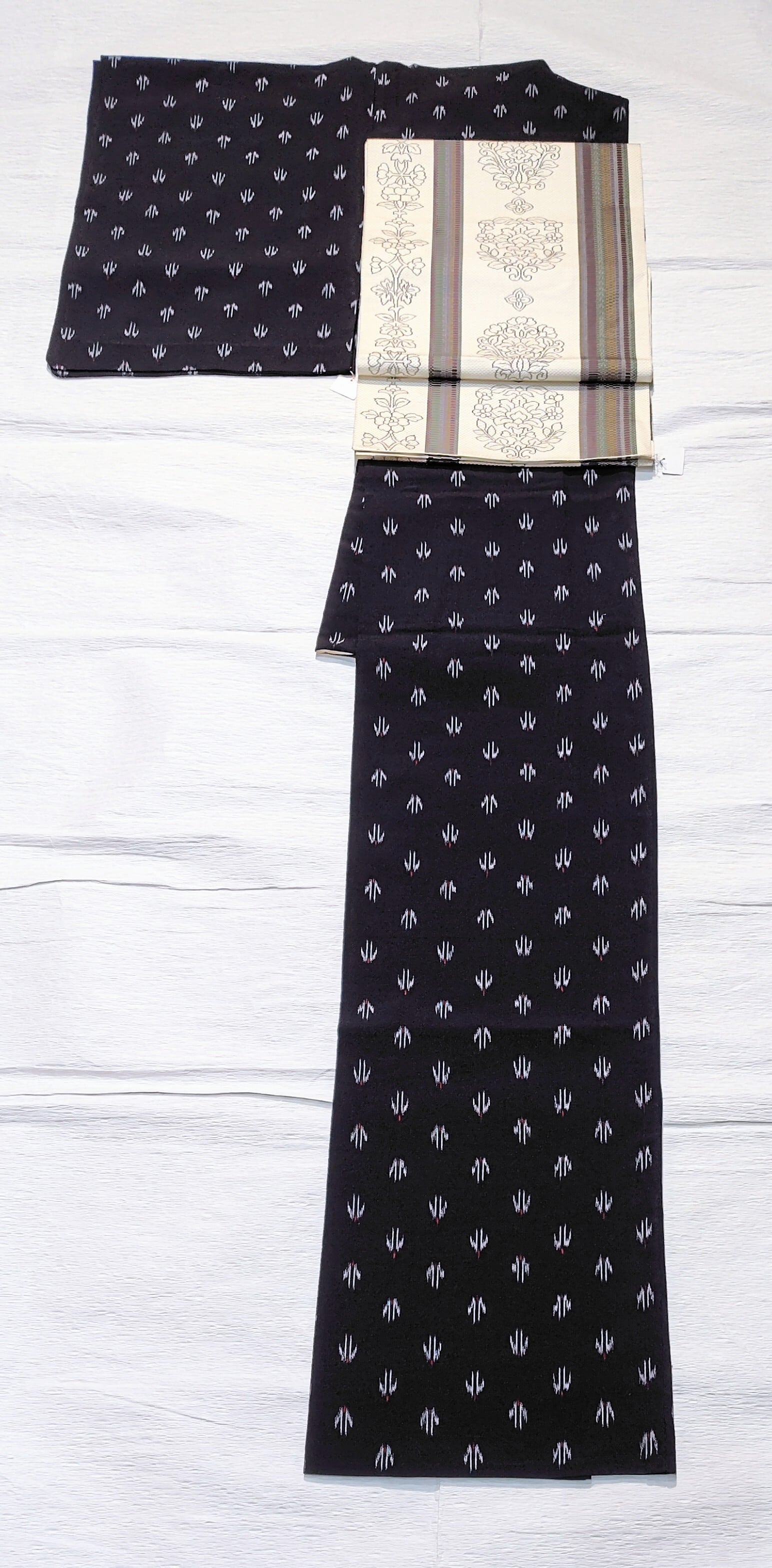 黒に見えるような濃紺色地に水色と赤色で琉球の燕柄のような絣模様