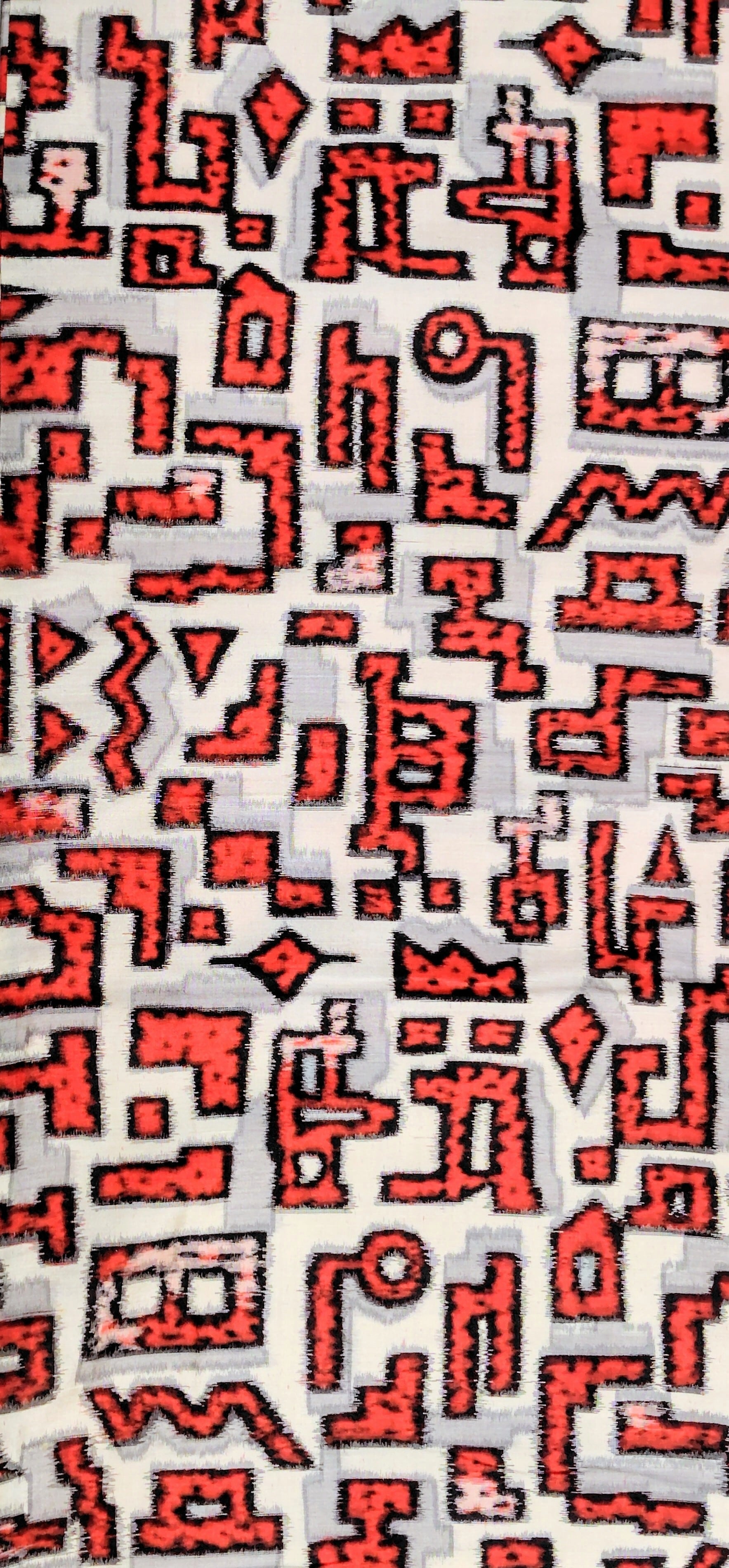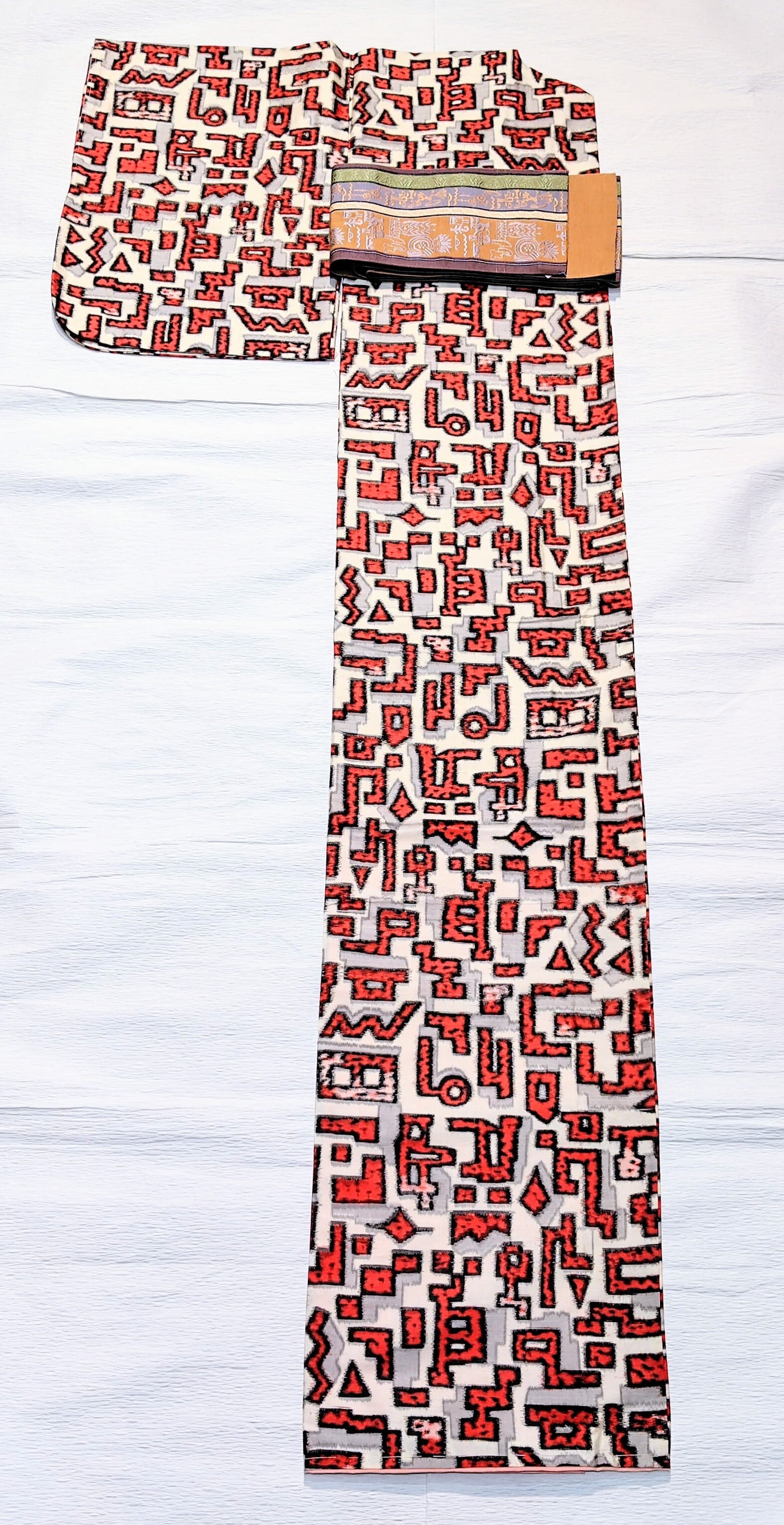 白地に赤色に黒色の縁取り、グレー色が影のようにデザインされているお洒落なお着物です。