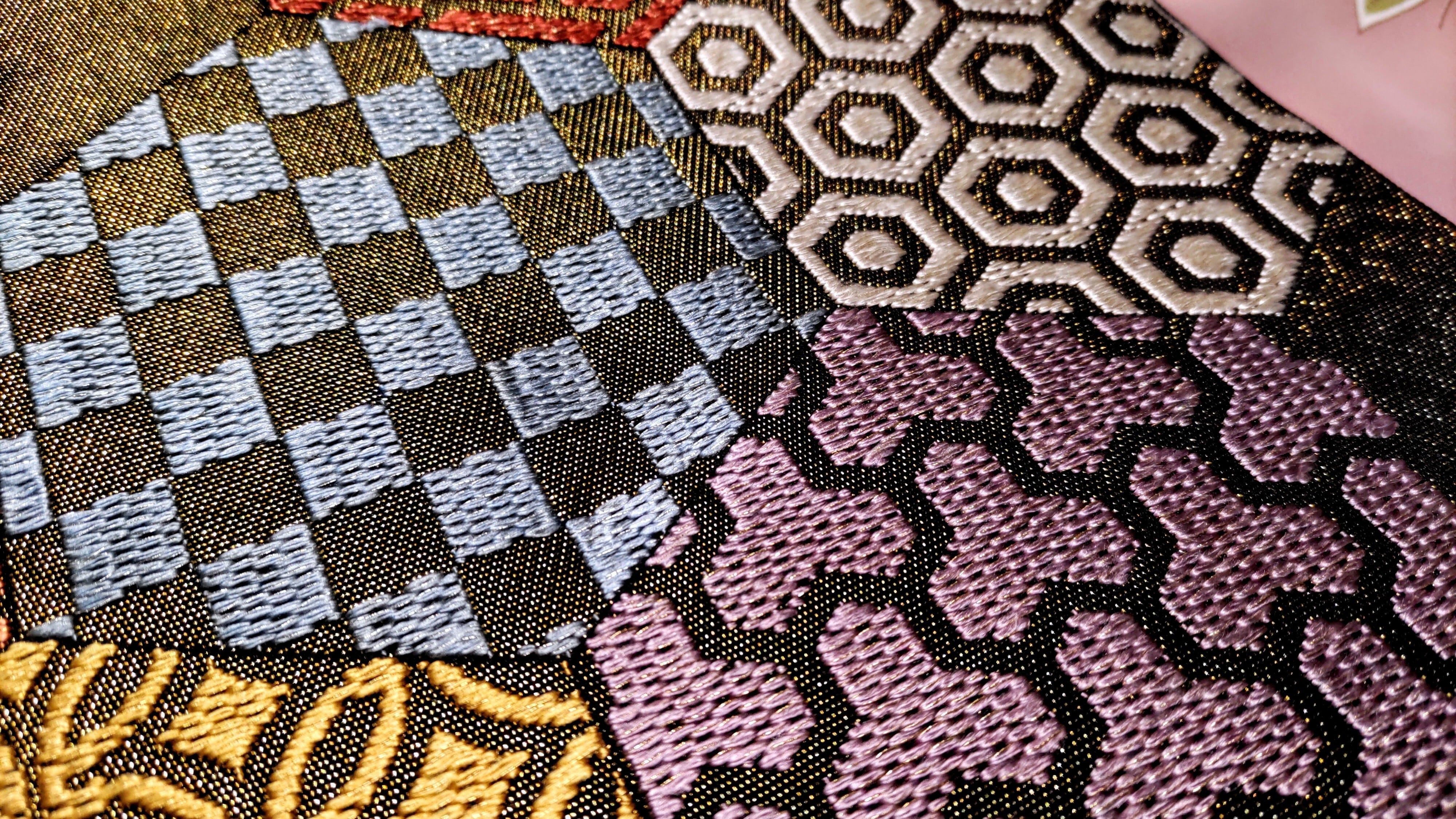 こちらは、黒色(光が当たると金糸が煌めき明るめの黒色、影では綺麗な黒色)、金糸の輝きが美しく、また数種類の古典柄が亀甲形に組み合わされた素敵な袋帯です。