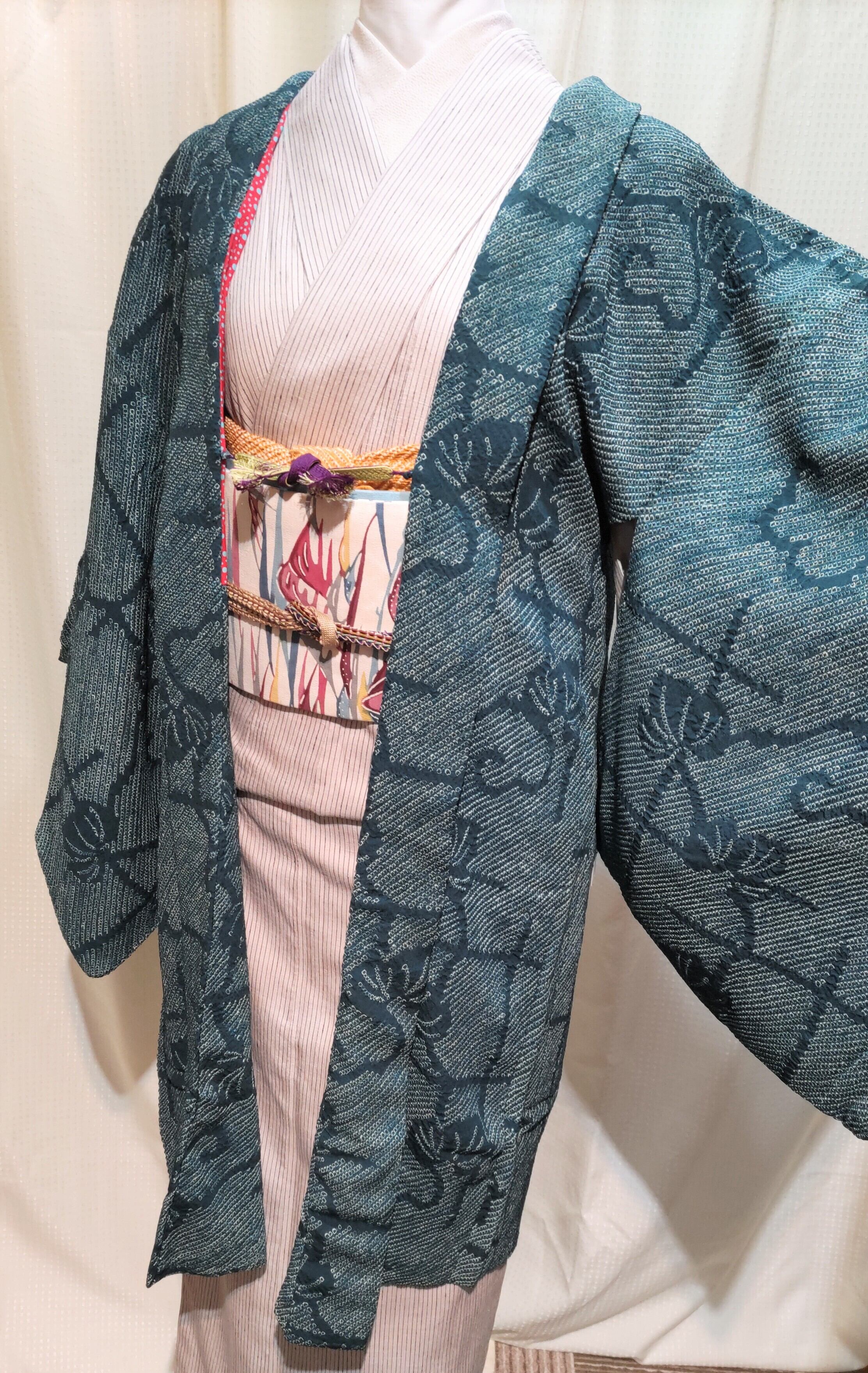 アンティークの長羽織り 総絞り〜濃い青緑色 鴨の羽色〜