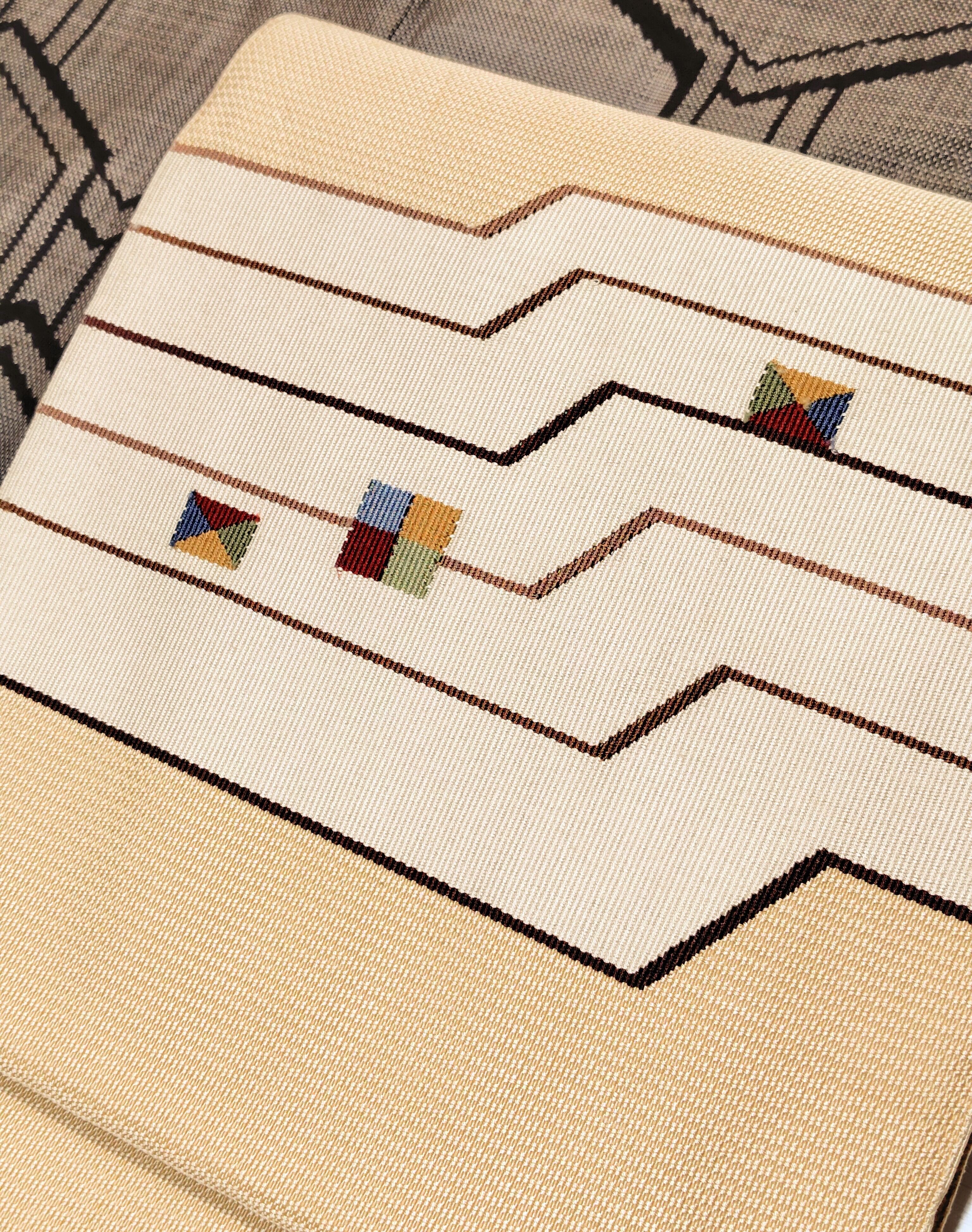 かなり上質な生地に変わった織りになっていて、おそらく西陣織の八寸名古屋帯だと思います。