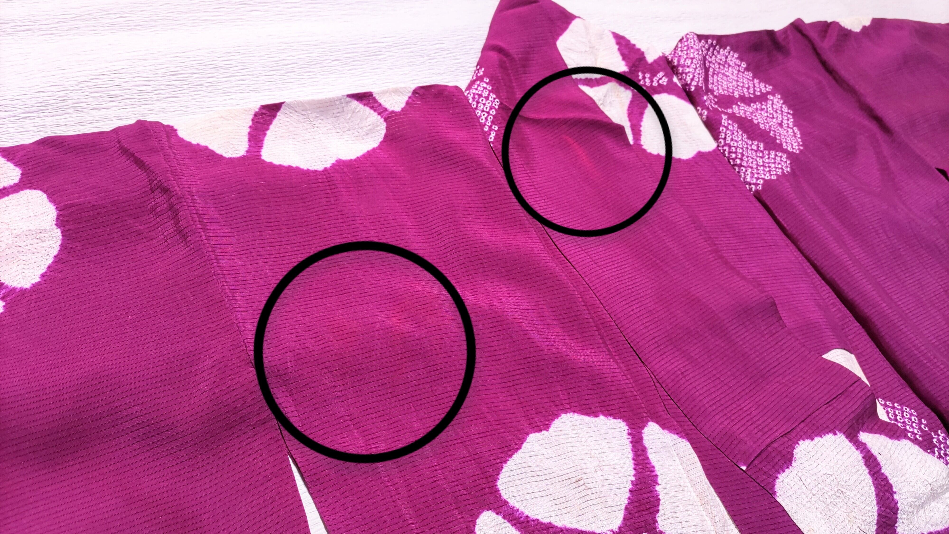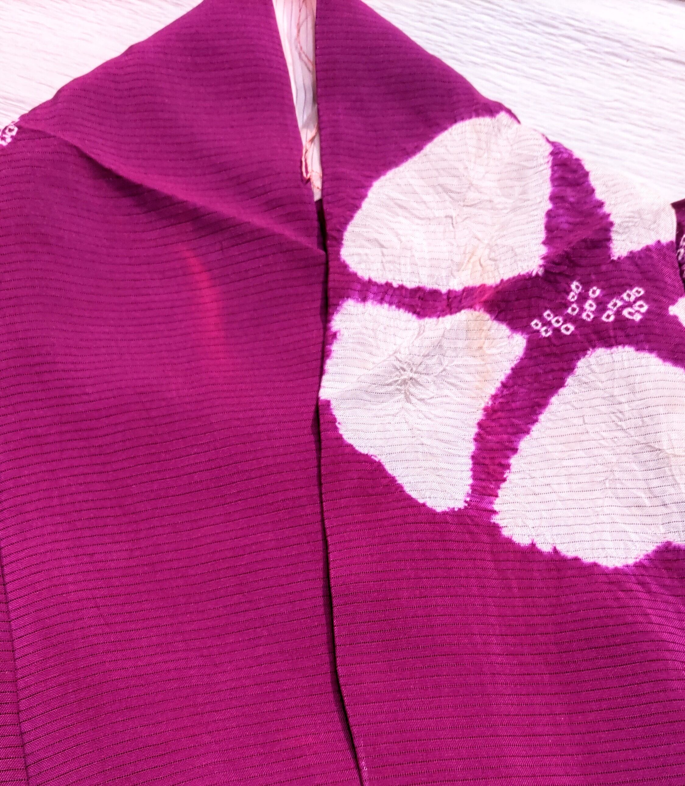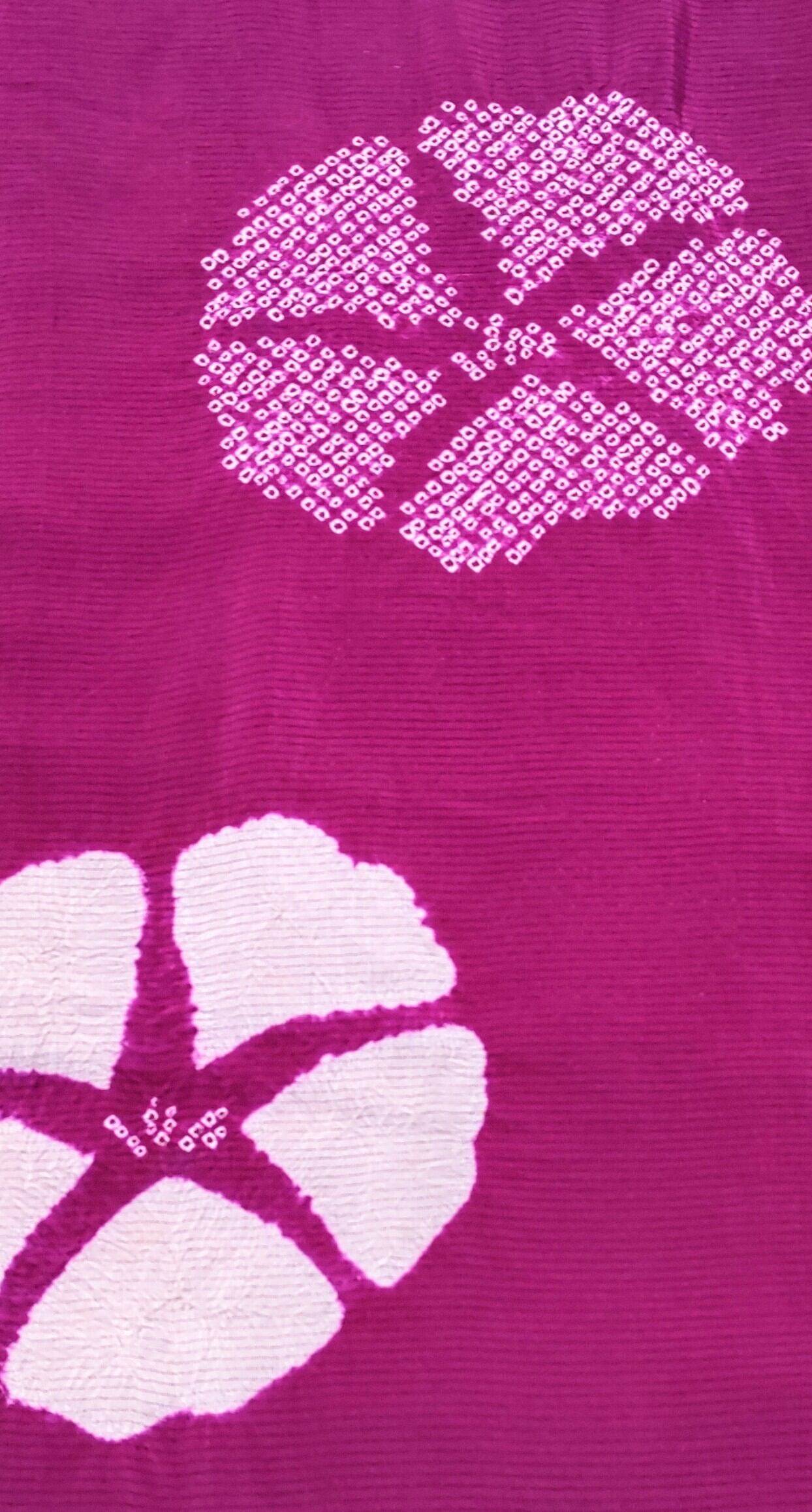 明るい発色の赤紫色に絞りで、白色の朝顔柄。