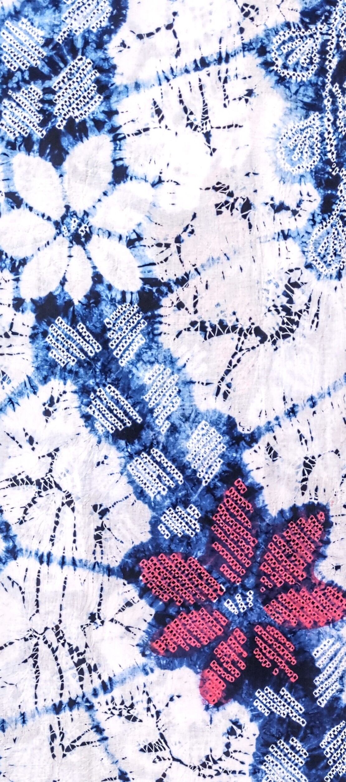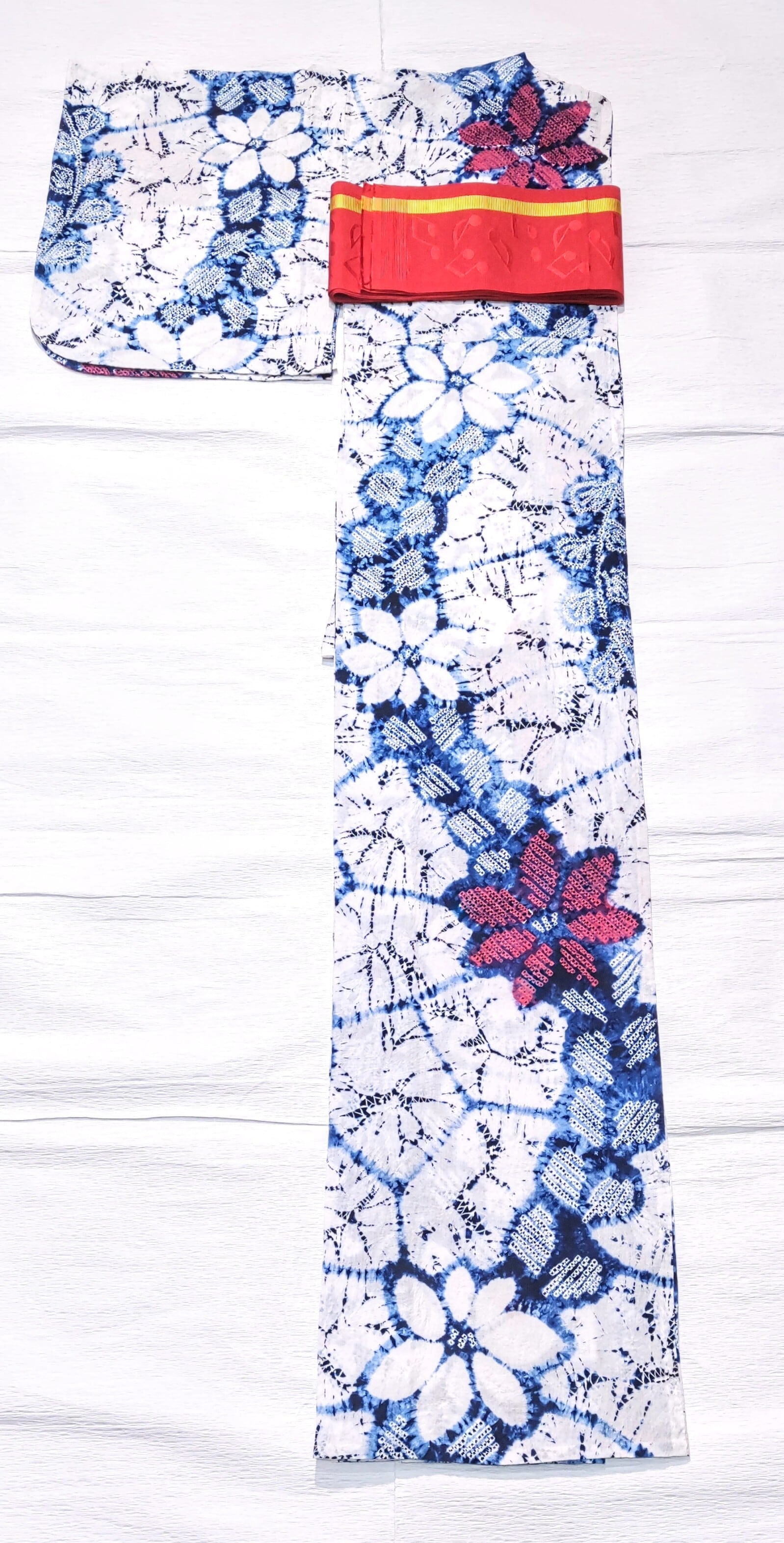 生地質も柔らかく、絞りもよく、色柄も青色と白色のすっきりとした涼しげな組み合わせに、赤〜のピンク色が差し色に入っていて、丁度よい可愛さと華やかさがあります。