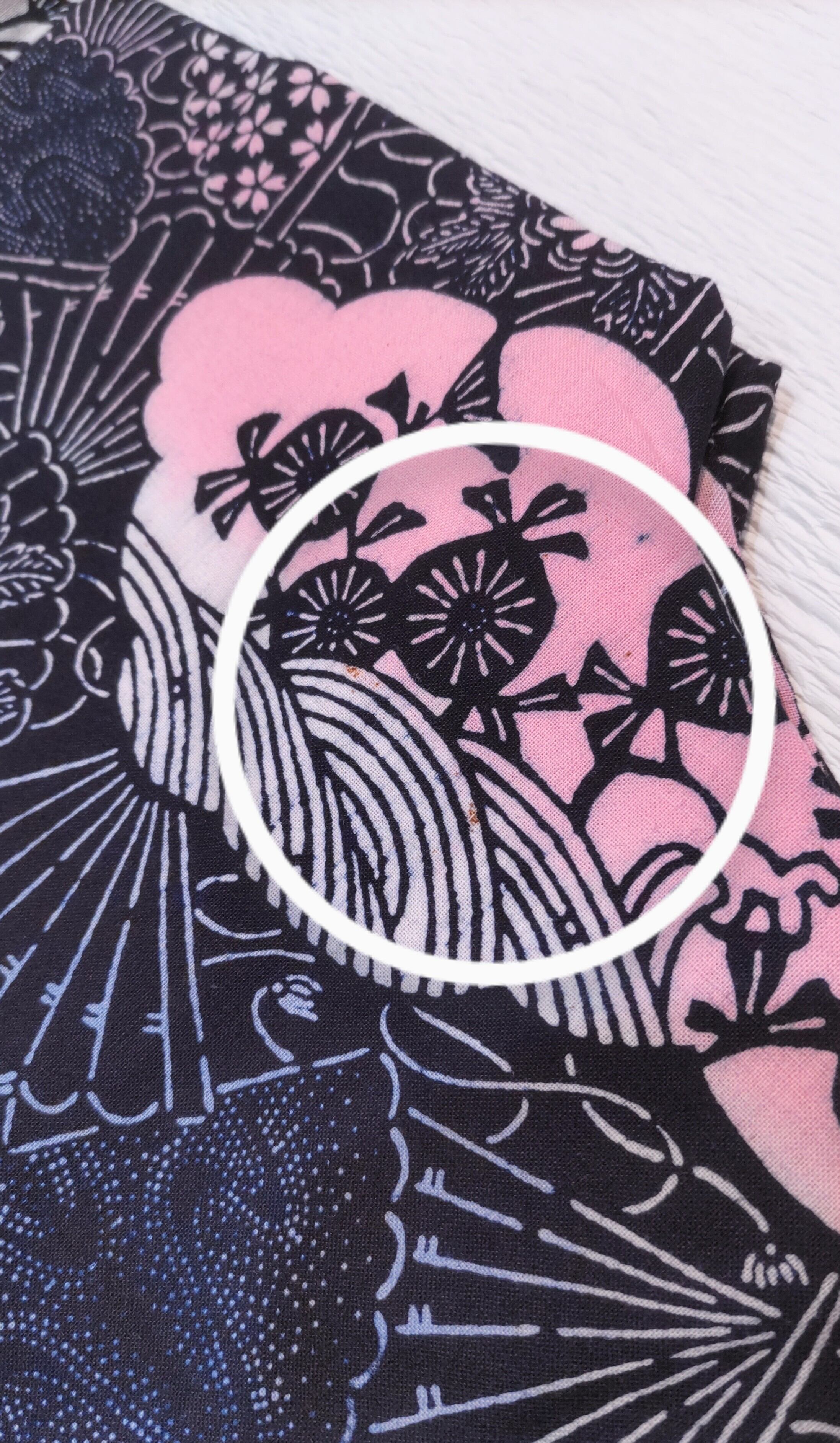 柄だけ見ると、かなり大人な雰囲気ですが、ぽわっと色づくようなぼかし染めでピンク色、黄色、薄緑色、青色が差し色になっていて、提灯のような幻想的な雰囲気と可愛さをプラスしてくれています。