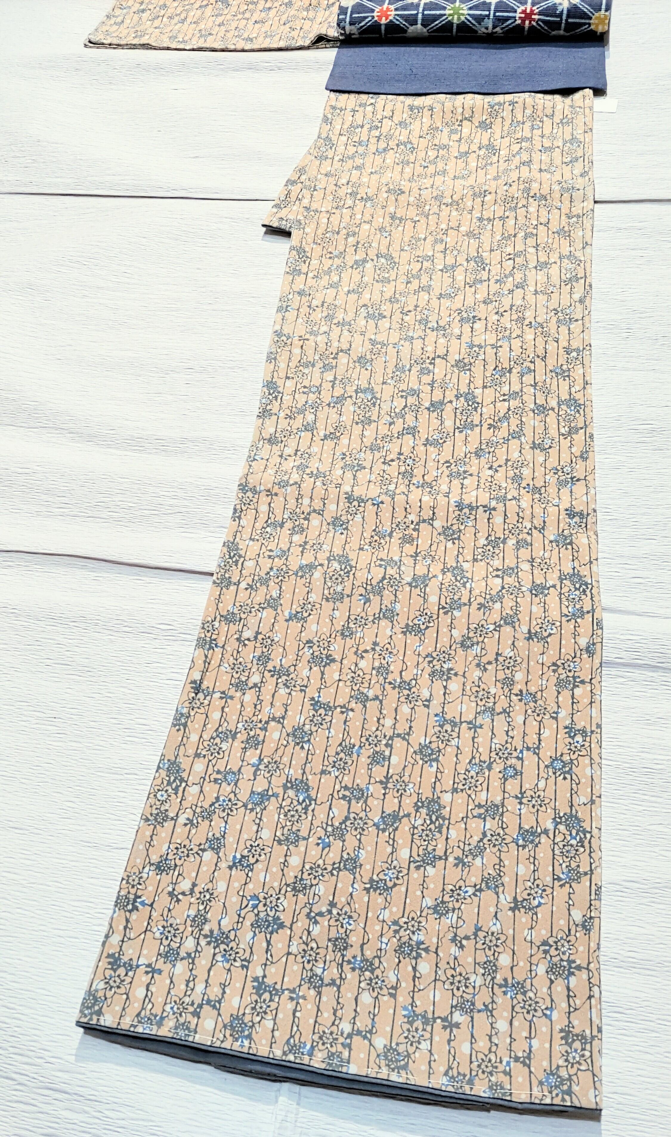 こちらはミルクたっぷりカフェラテのような淡いベージュ色の地に、白色の水玉柄、更にその上に薄い藍色のような青色でクレマチスorテッセン柄になっている小紋です。