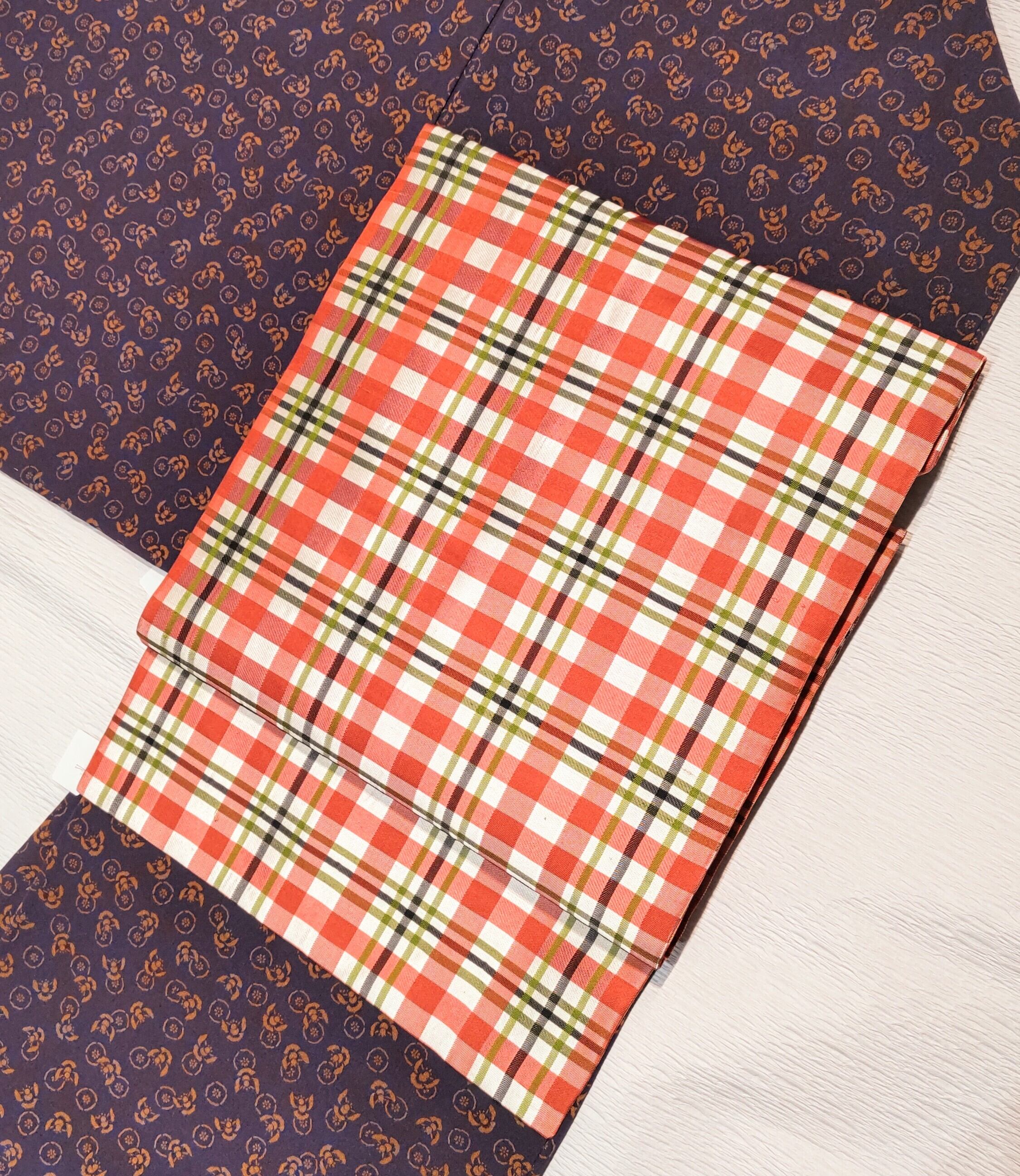 白地にまるで珊瑚のような柔らかく淡めのオレンジ色、少し渋さのある黄緑色、濃い緑色、黒色の組み合わせの格子柄。