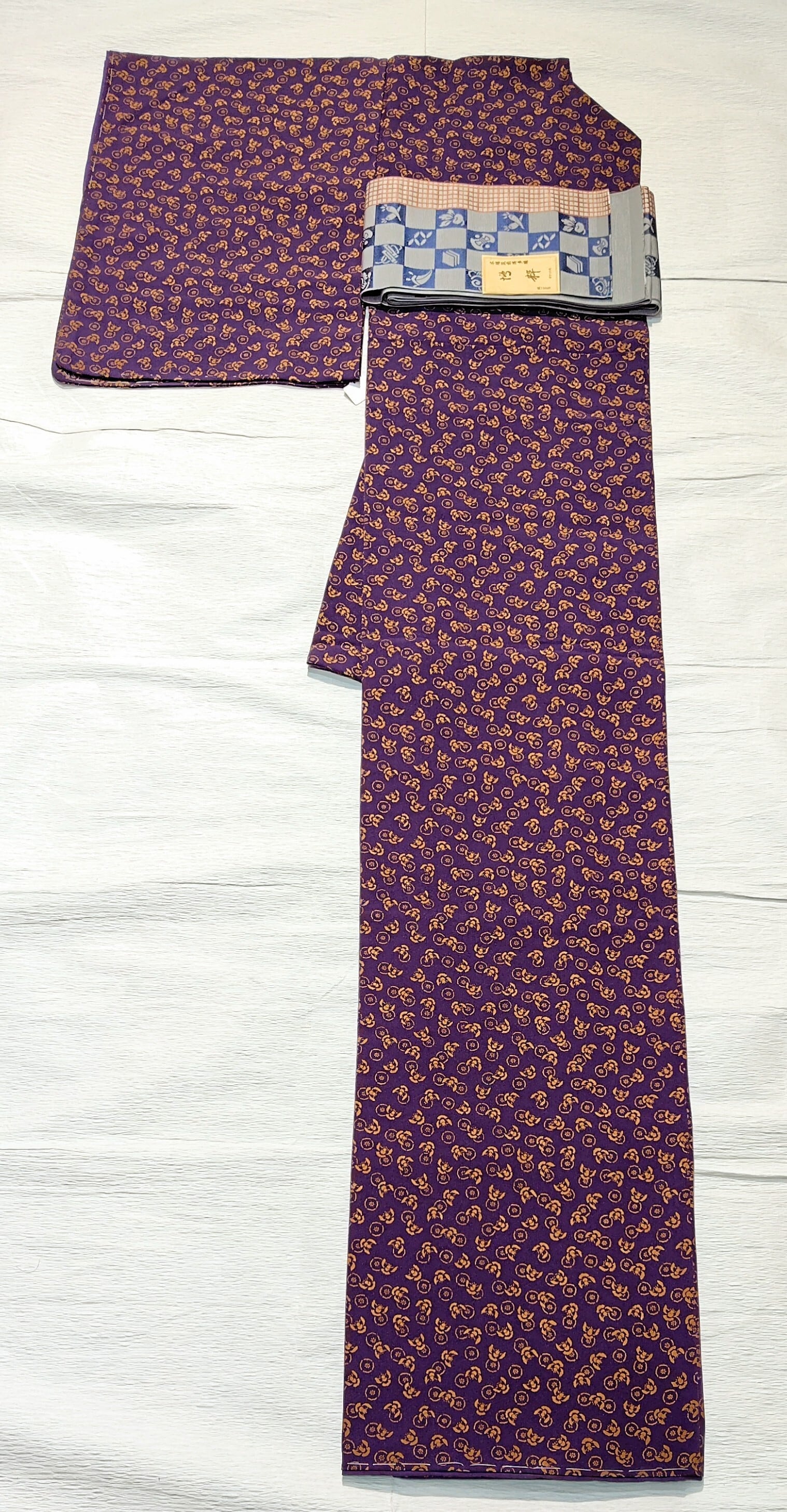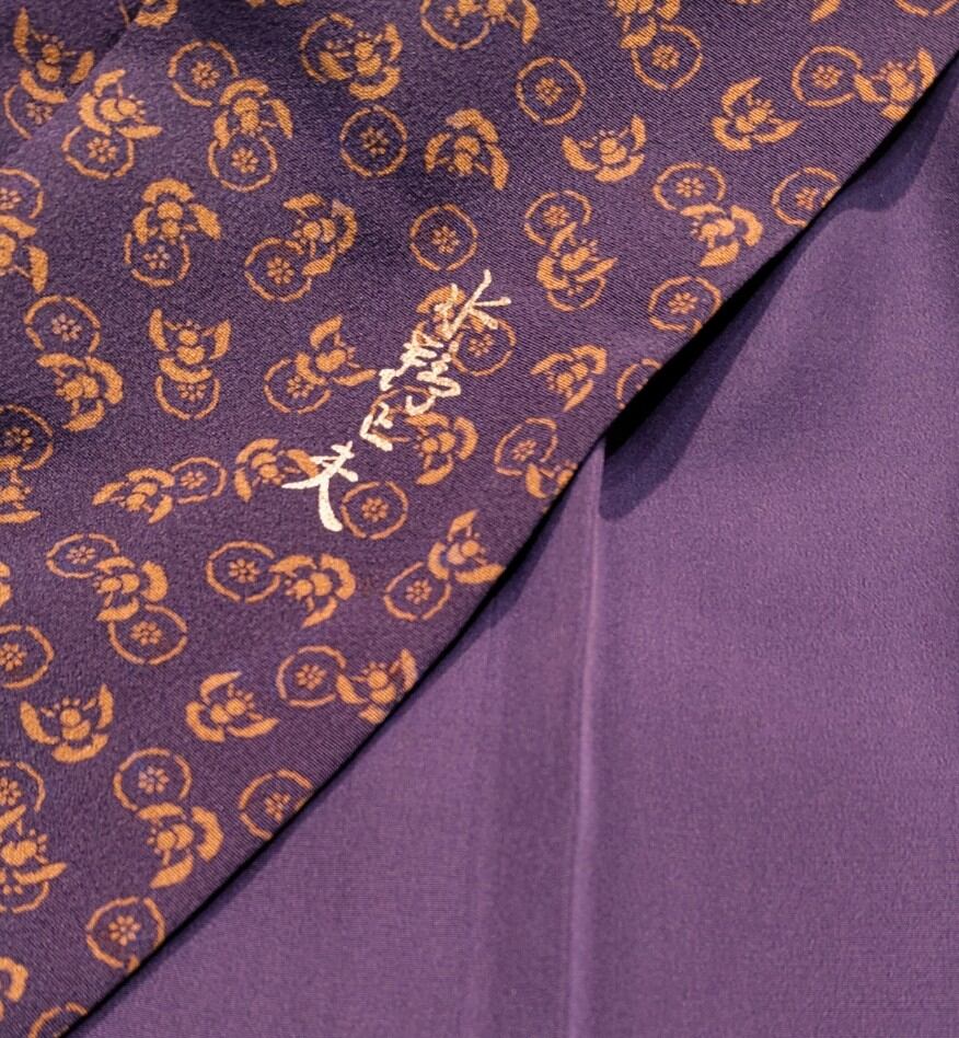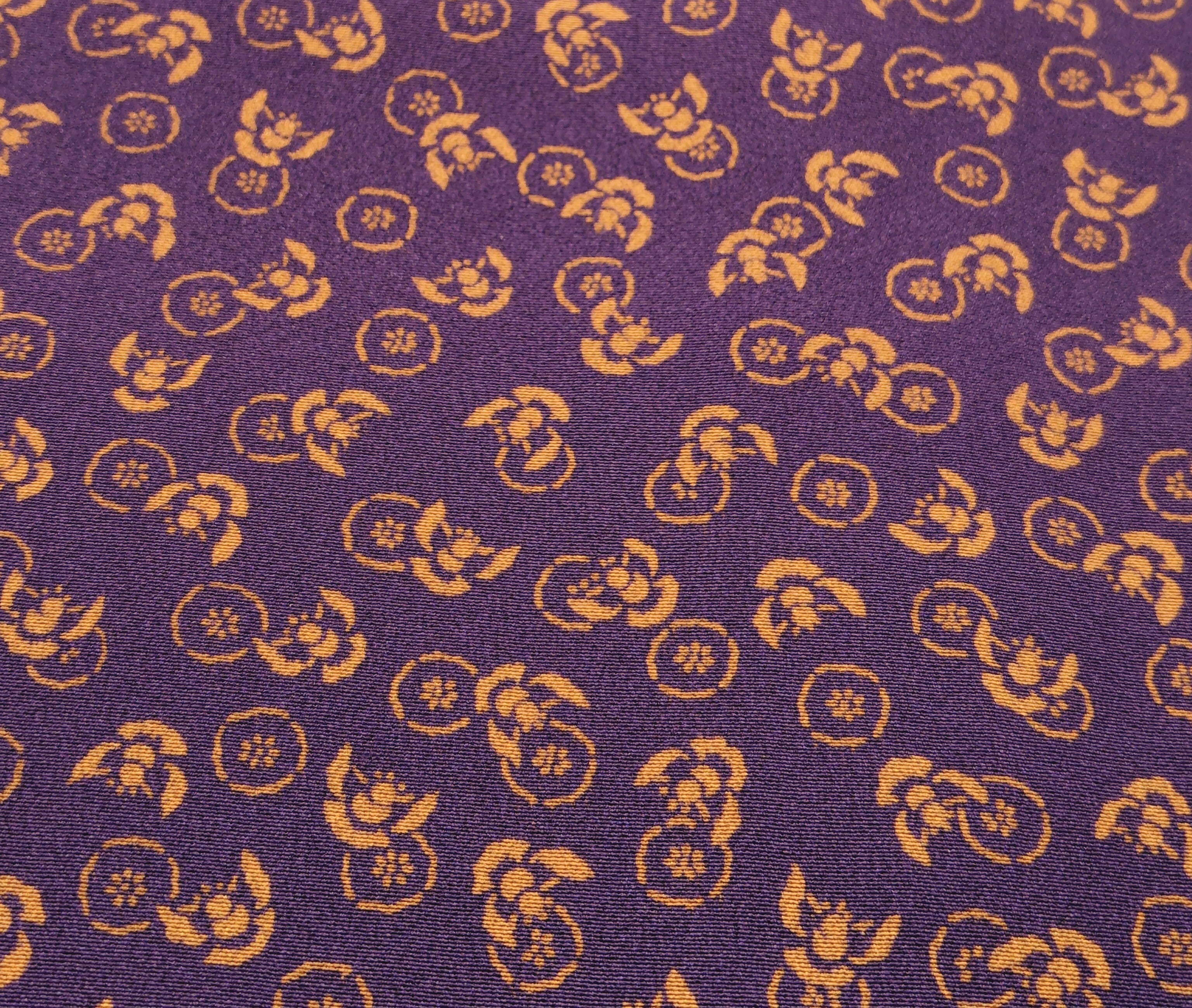 今回は濃い上品な紫色の地に金茶色(写真よりは彩度抑えめ)で、小さめのふくら雀と丸紋ように小花のような柄。