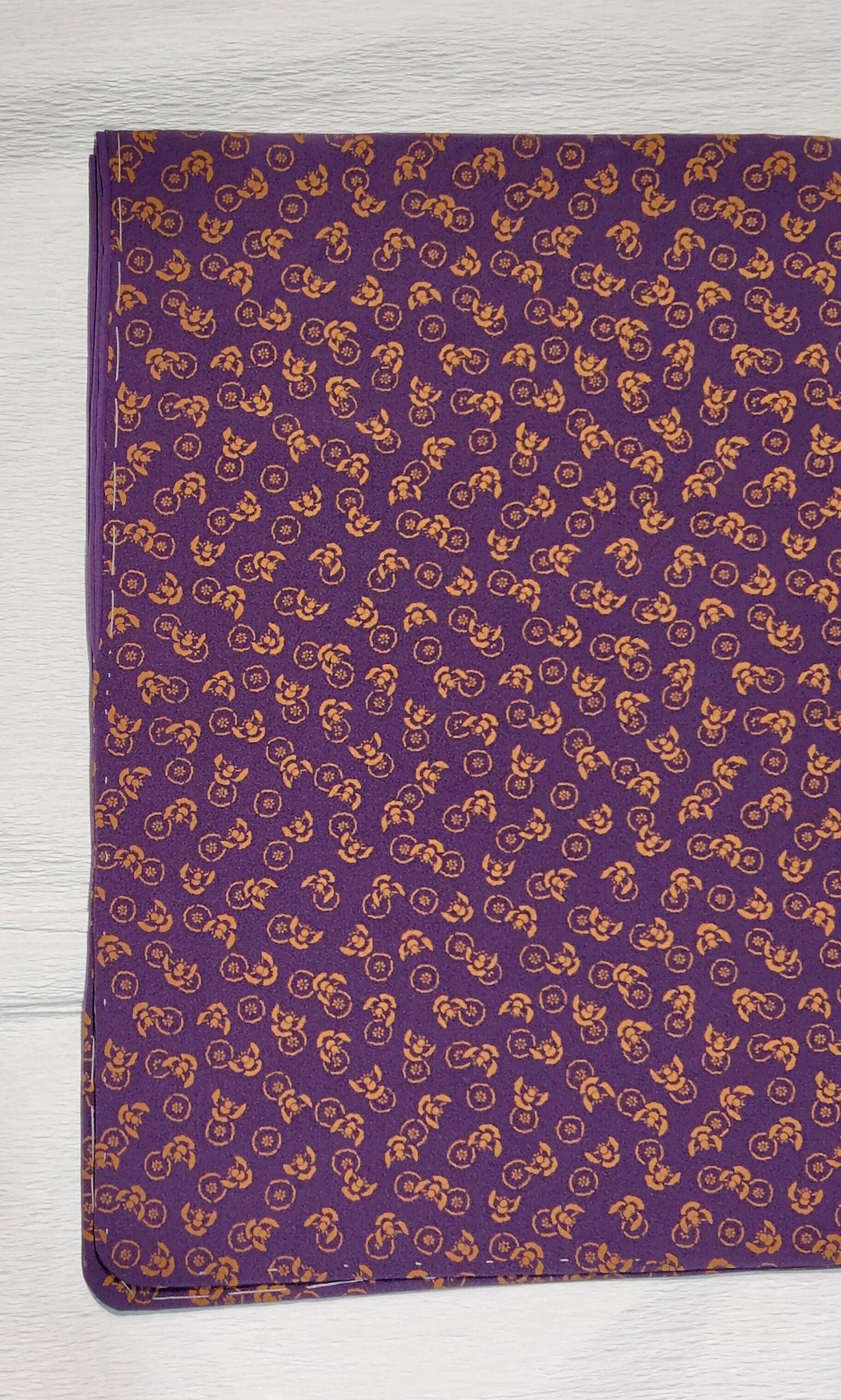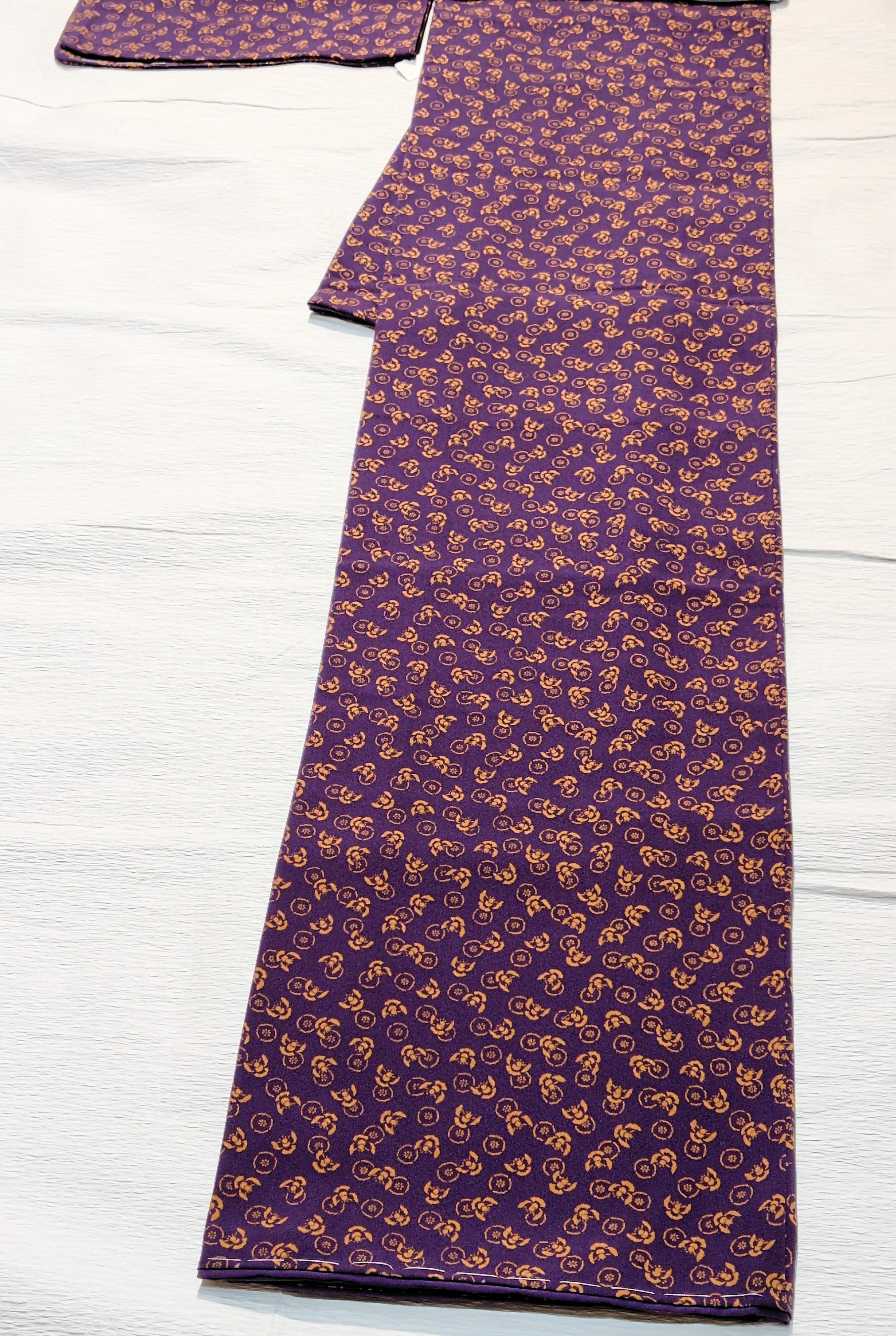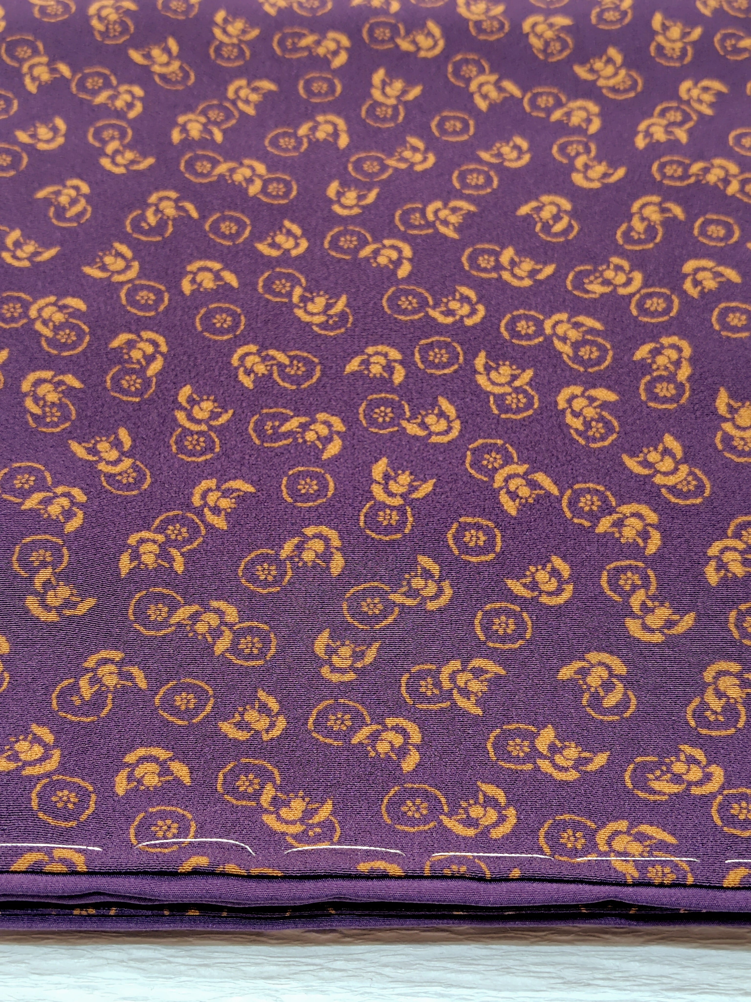 今回は濃い上品な紫色の地に金茶色(写真よりは彩度抑えめ)で、小さめのふくら雀と丸紋ように小花のような柄。