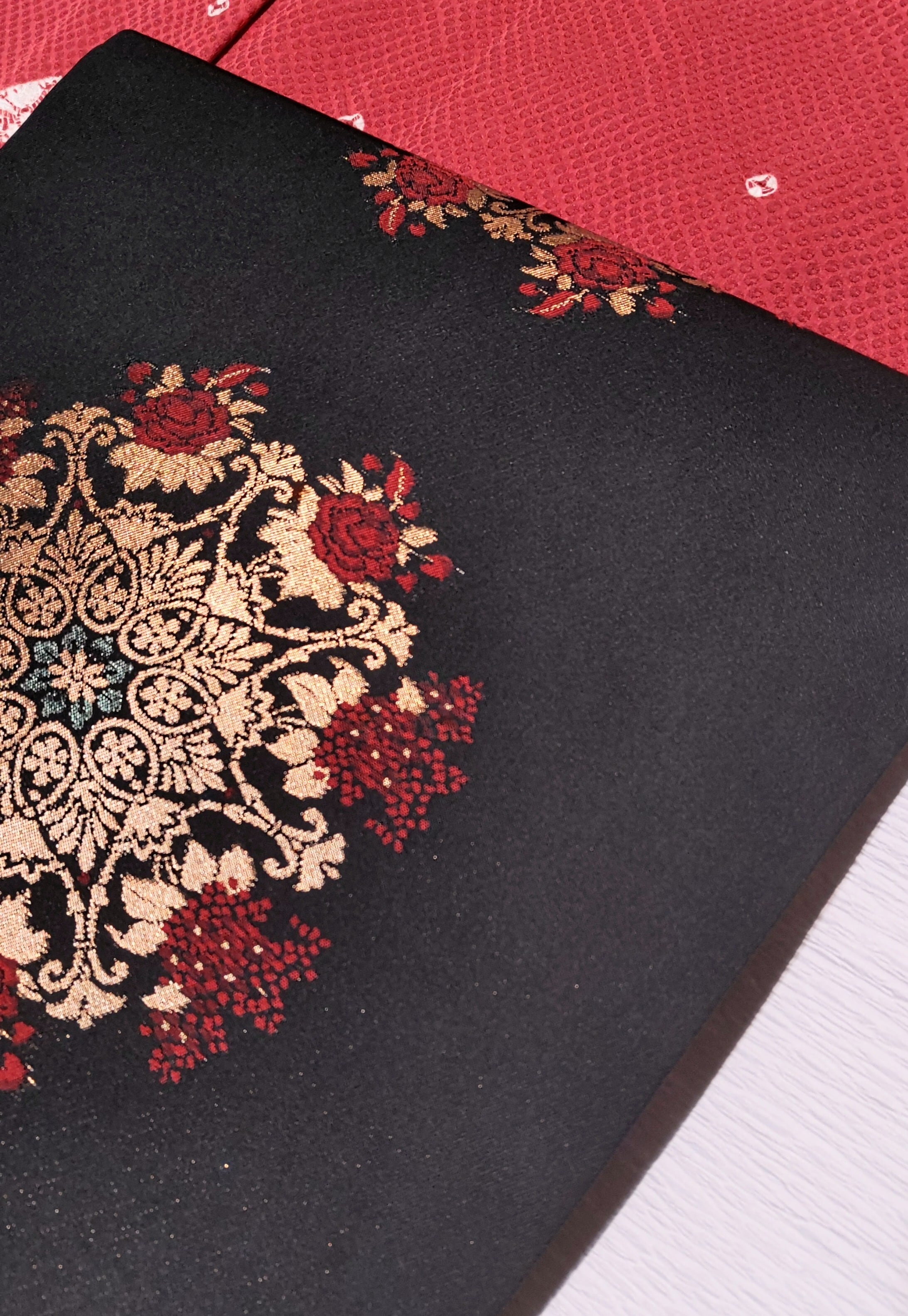 黒地(小さく金糸が煌めいています)に金糸でレースモチーフのような柄、そこに深紅の薔薇と小花、真ん中にはきらきら輝くエメラルドのような色がワンポイントで入っています。
