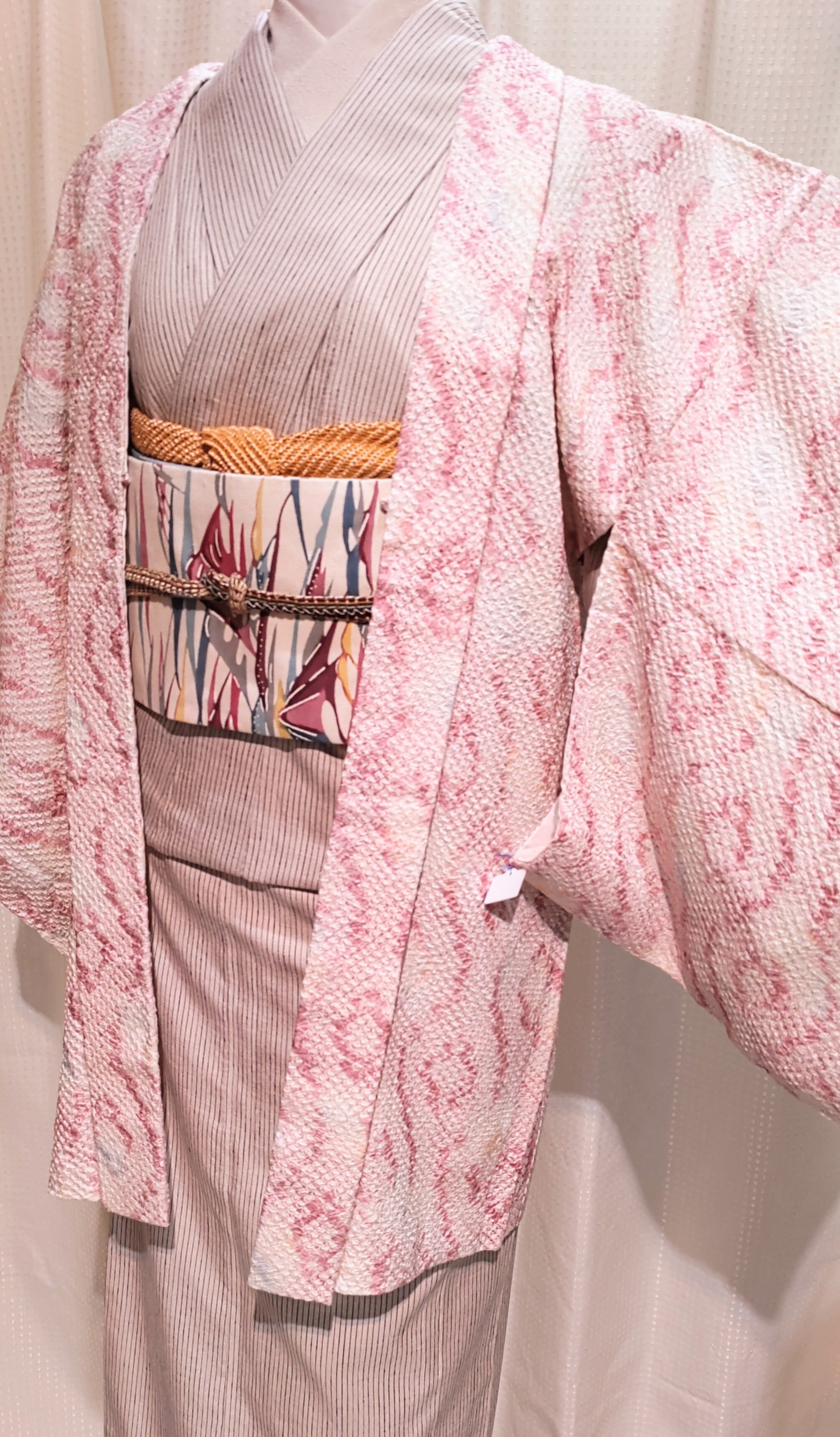 総絞りの羽織~白の綸子地にローズピンク色、淡い青色、薄い橙色~です。