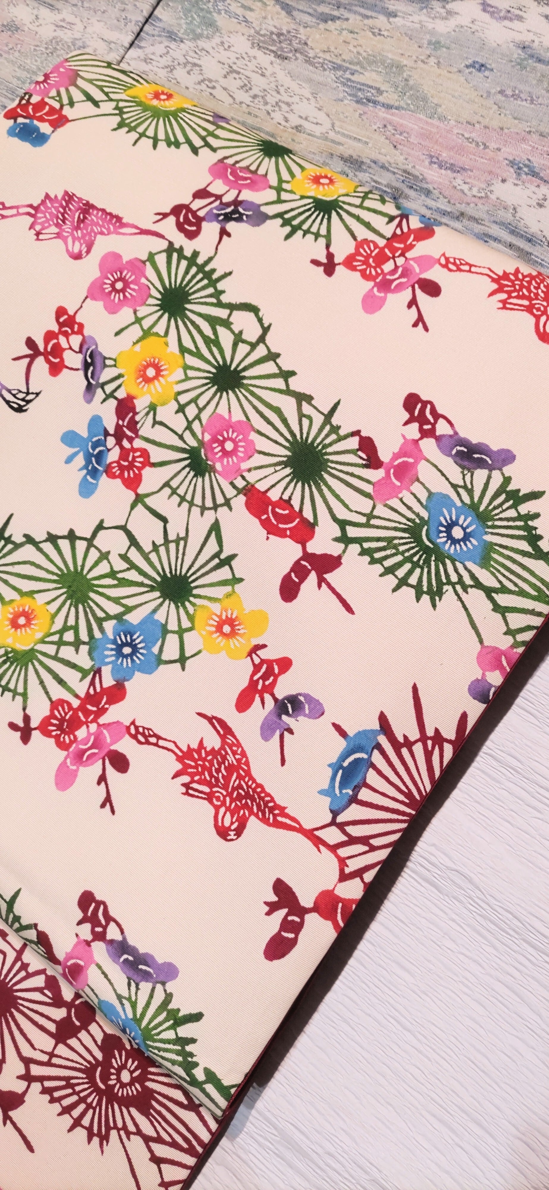 白地に、松葉のような緑色、黄色、朱色、深い赤色、紫色、青色、黒色、ピンク色の華やかで明るいお色の組み合わせ。