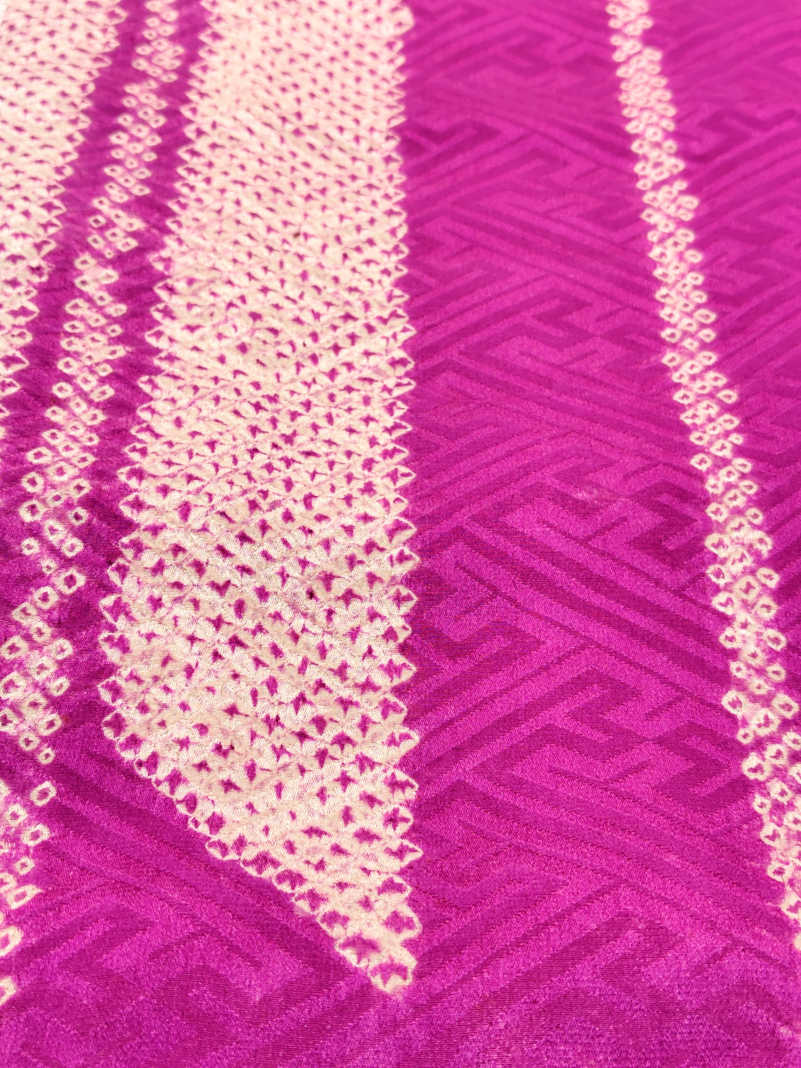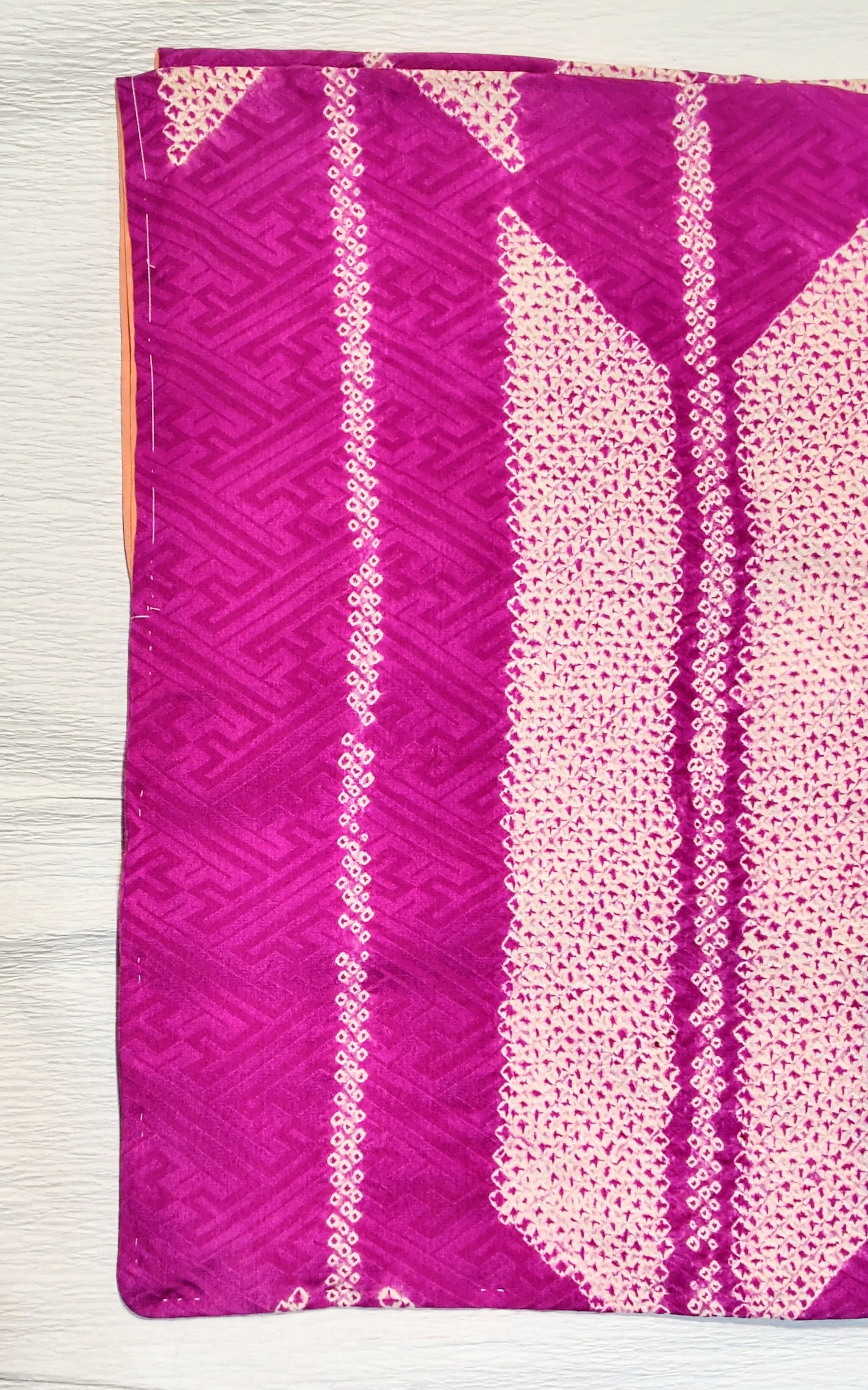 とても美しい紗綾形の地紋入りの生地を絞りで矢羽根柄に染めた小紋です。